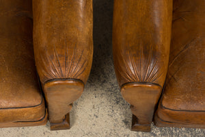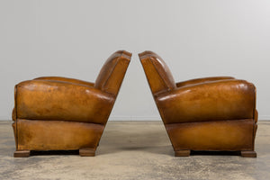 1920s French Art Deco Scalloped Back Club Chairs in Caramel Leather – A Pair