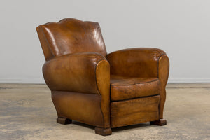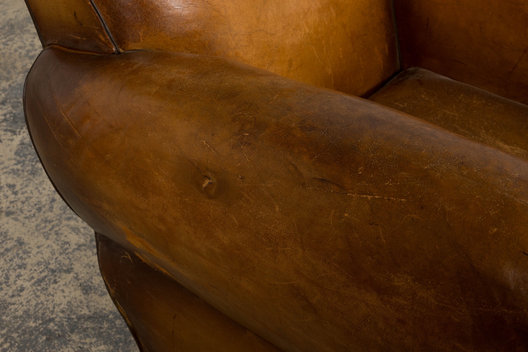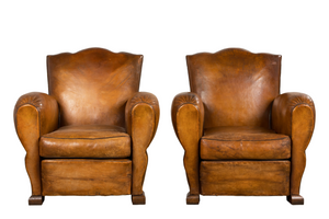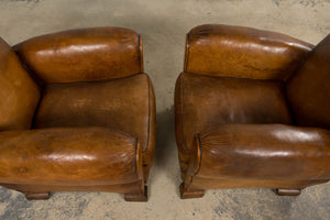 A traditional pair of 1920s French Art Deco leather club chairs sourced from Provence, France. These iconic fauteuils club feature scalloped backs with gently curved silhouettes, enveloping rolled arms, and deep seats. Upholstered in supple caramel-brown leather with a rich patina, they showcase distinctive gathered stitching on the arm fronts and rest on solid block feet. The loose seat cushions display natural creasing and surface wear, contributing to their authentic character and comfort. Sturdy in construction and generously proportioned, they embody the understated luxury and timeless appeal associated with French club seating of the Art Deco period. A quintessential pair of French Art Deco club chairs — warm, inviting, and timeless, equally suited for a library, lounge, or living space.