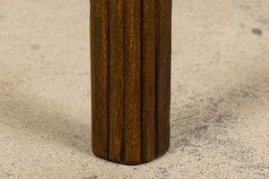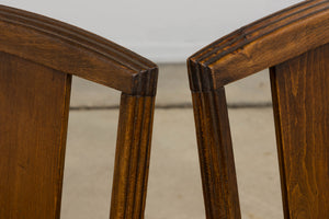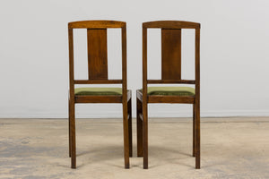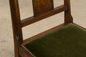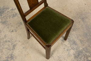 A striking set of six French Art Deco dining chairs, dating to the 1930s and sourced in Provence, France. Each chair is hand-crafted in maple with clean architectural lines, featuring a rectangular back with a central splat framed by molded stiles. The front legs are detailed with vertical fluting, while the rear legs are slightly curved for balance. Our in-house workshop has structurally revised the frames, ensuring they are solid and stable. The chairs have been newly reupholstered in a deep olive green velvet, accented with hand-applied speckled brass nailhead trim for a refined finish. Frames were gently refinished and waxed, reviving the natural maple patina while preserving their period character.