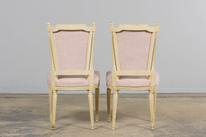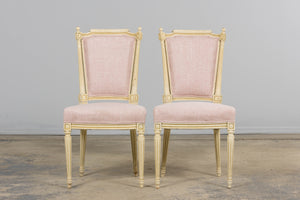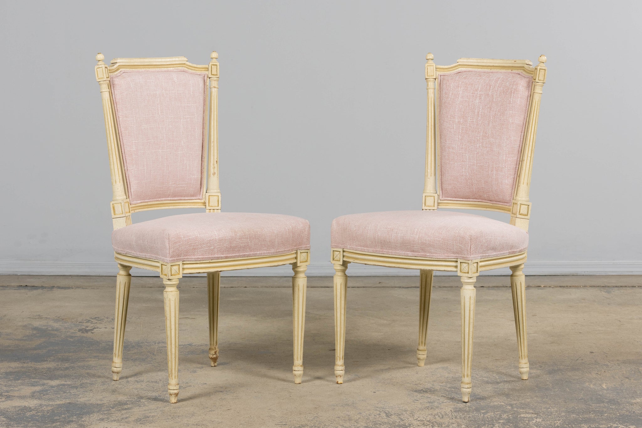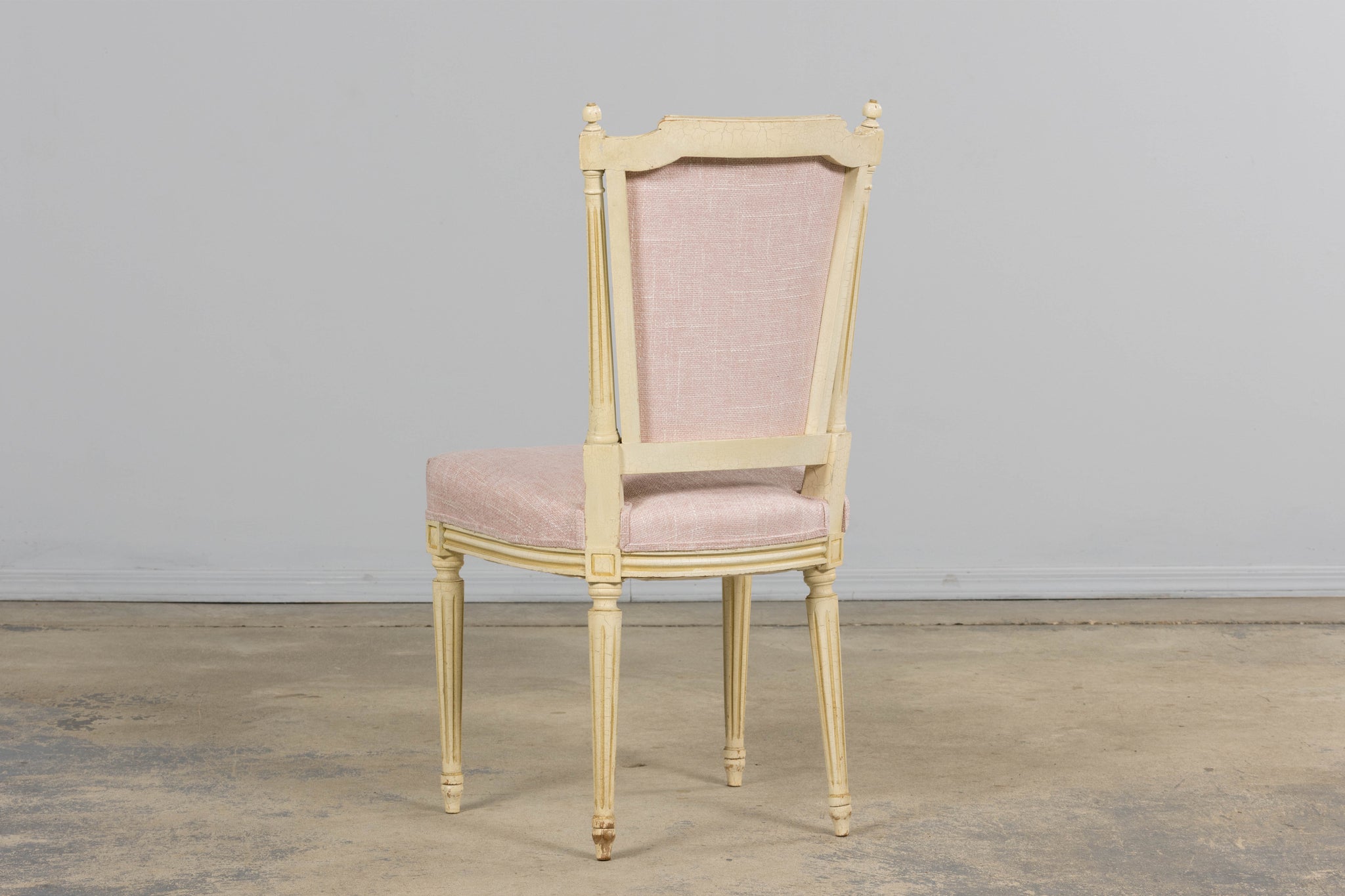 A graceful set of six late 19th century French dining chairs crafted in the Louis XVI style and sourced from Provence, France. Hand-carved and finished in creamy white paint, the frames display authentic crackle, chipping, and light paint loss consistent with age, highlighting the original patina. The design reflects the refined neoclassical aesthetic associated with the Marie Antoinette taste, with elegant proportions and restrained ornamentation. Each chair has been structurally revised for stability and features a rectangular padded back with a shaped crest rail. Newly upholstered in textured blush-pink high-performance chenille, the chairs are finished with matching single piping on the back and welt trim along the seat for a clean, tailored look. Raised on tapered, fluted legs, the set blends classical symmetry with a soft, romantic palette.