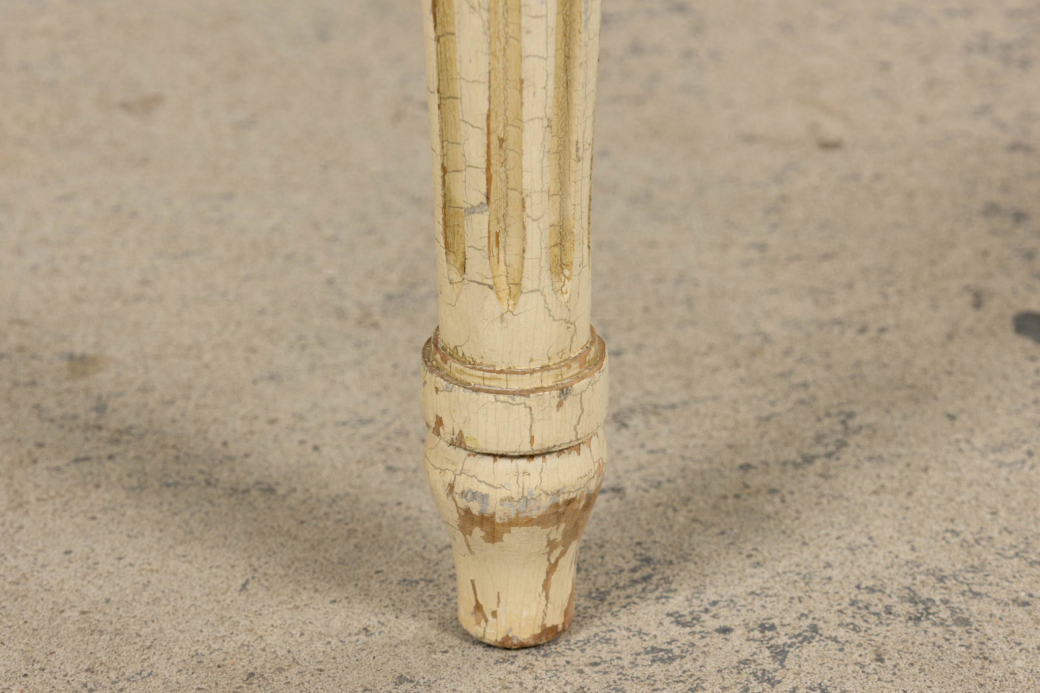 - Condition: Solid and stable with structurally revised frames; painted finish shows crackling, chipping, and areas of wear; newly upholstered in high-performance fabric.