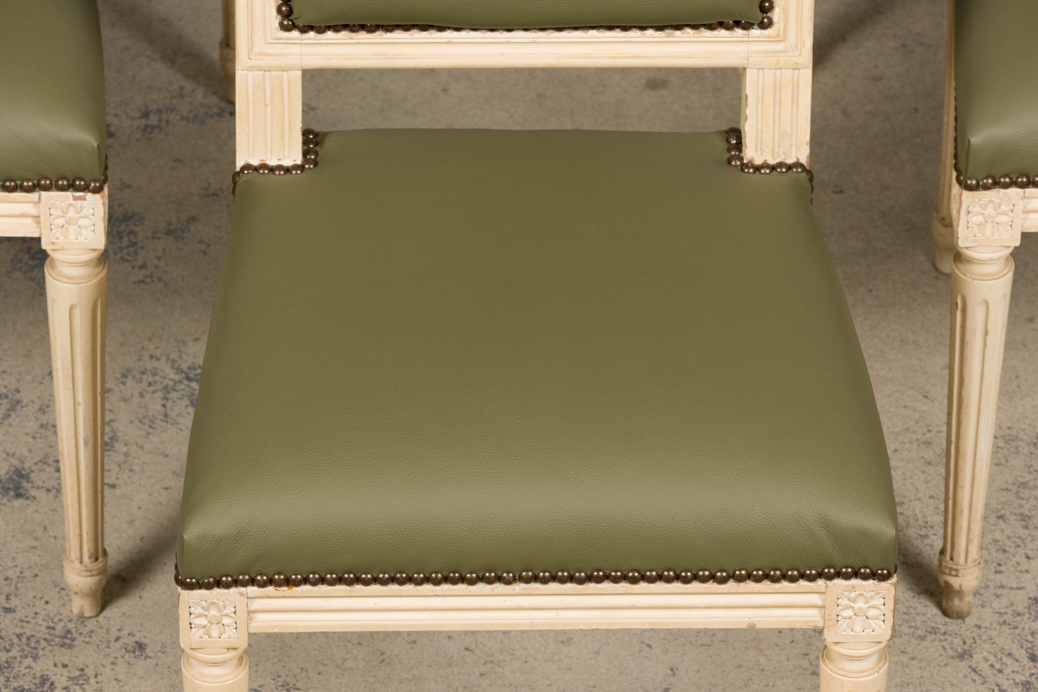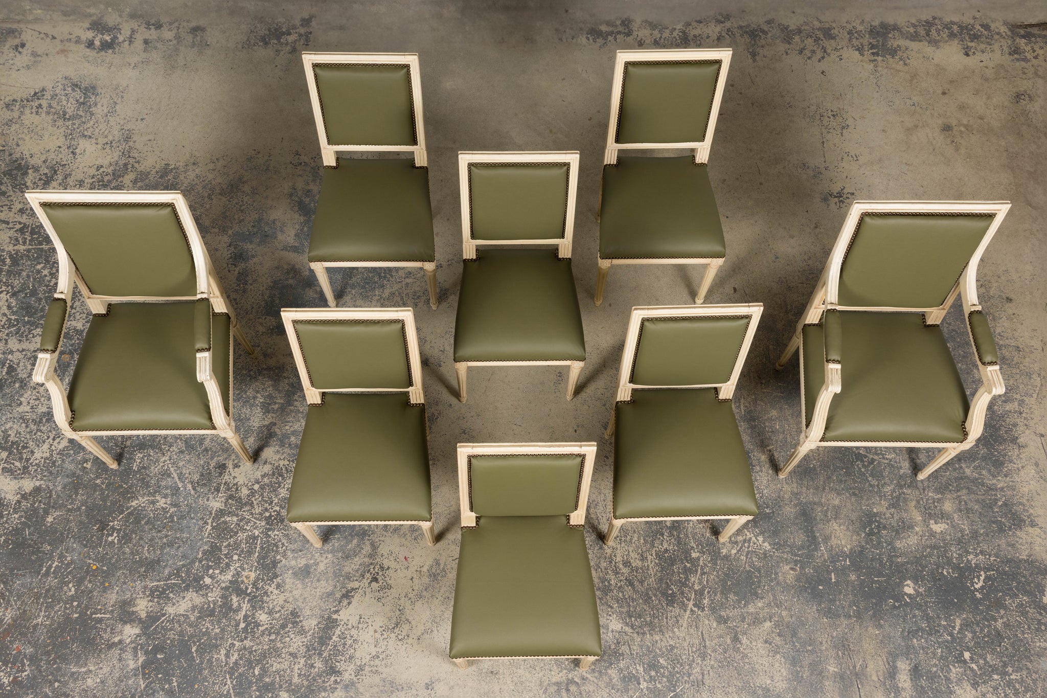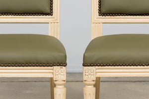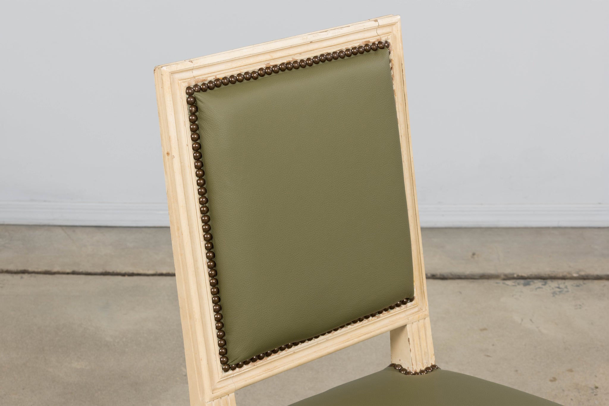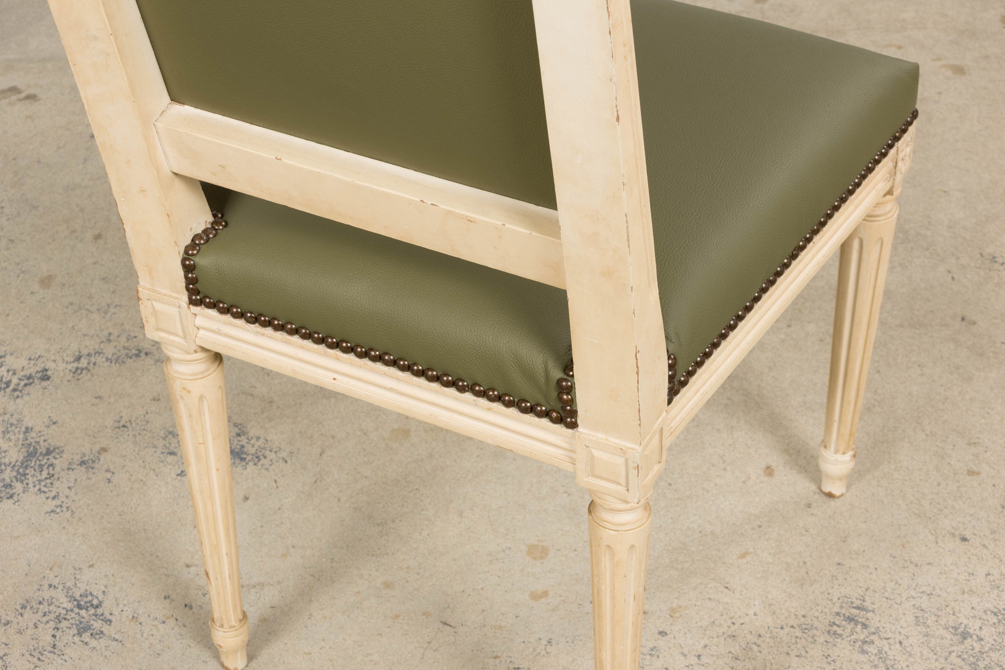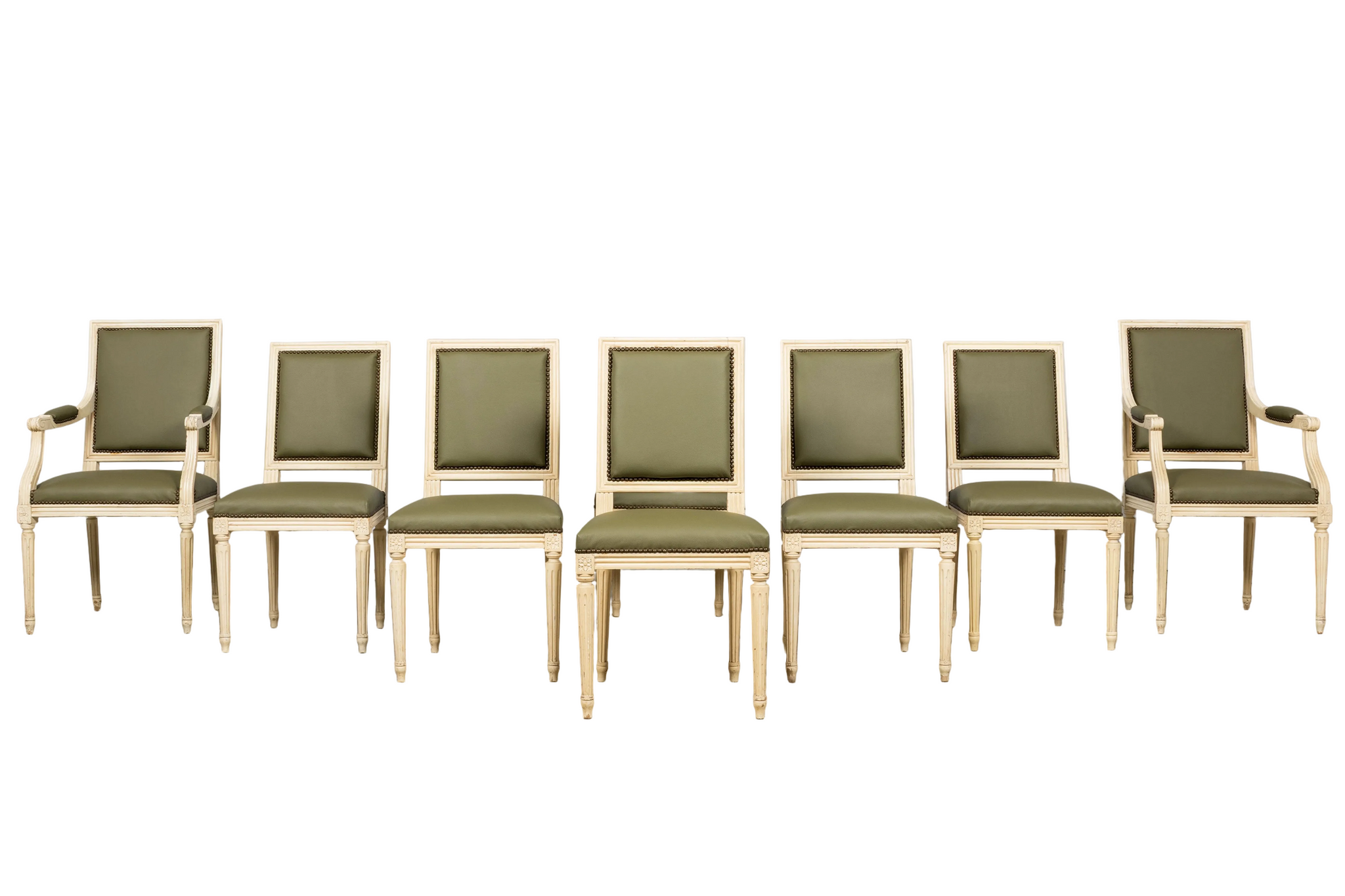 An exquisite set of eight French Louis XVI style restored dining chairs, consisting of six side chairs and two armchairs, sourced in Paris, France. This elegant set features classic Louis XVI proportions with square upholstered backs, straight lines, and finely fluted tapered legs. The frames are accented with carved rosette corner blocks and subtle neoclassical detailing throughout, giving the chairs a clean, architectural presence that feels refined without being overly formal. The armchairs are distinguished by gently curved arms with upholstered rests, adding comfort while maintaining the same balanced profile as the side chairs. The chairs retain their original painted finish, with beautifully aged patina and wear consistent with age and use. The entire set has undergone a careful, full restoration intended for long-term everyday use. All frames were structurally revised, reinforced, and tightened. Seats and backs were completely rebuilt and newly upholstered in a high-quality Italian olive green leather, selected for its rich tone, supple hand, and durability. The leather provides a refined contrast to the painted frames and elevates the overall presentation. Upholstery is finished with hand-applied brass nailhead trim, applied with consistent spacing for a clean, tailored finish. A substantial, well-executed set that combines original French craftsmanship with premium materials and thoughtful restoration, suitable for both formal dining rooms and relaxed, lived-in interiors.