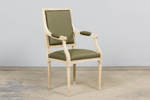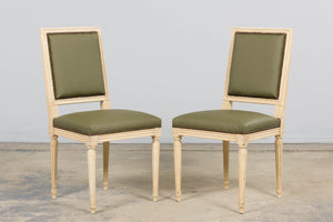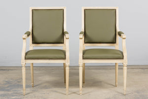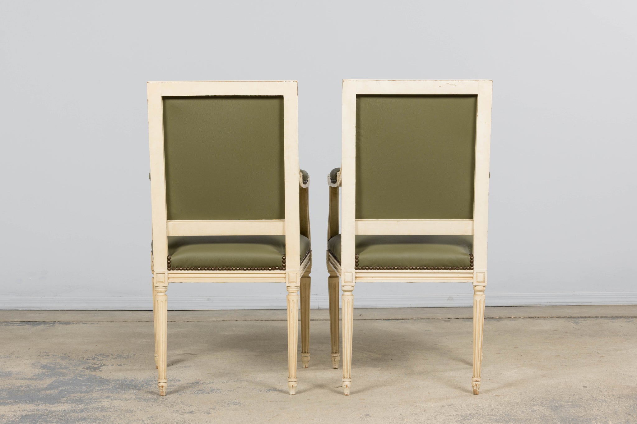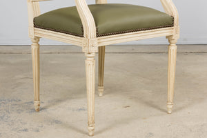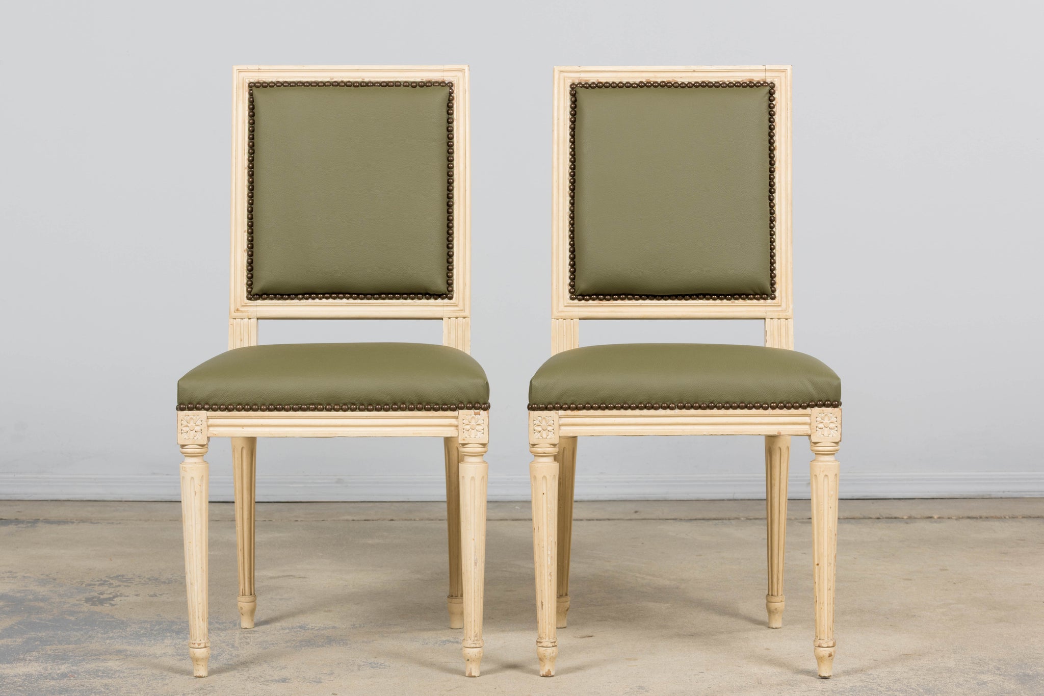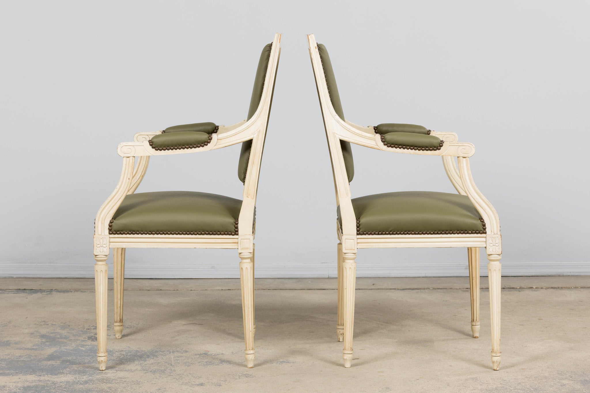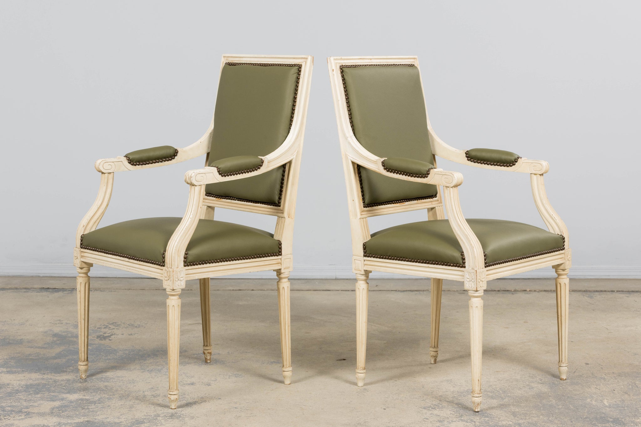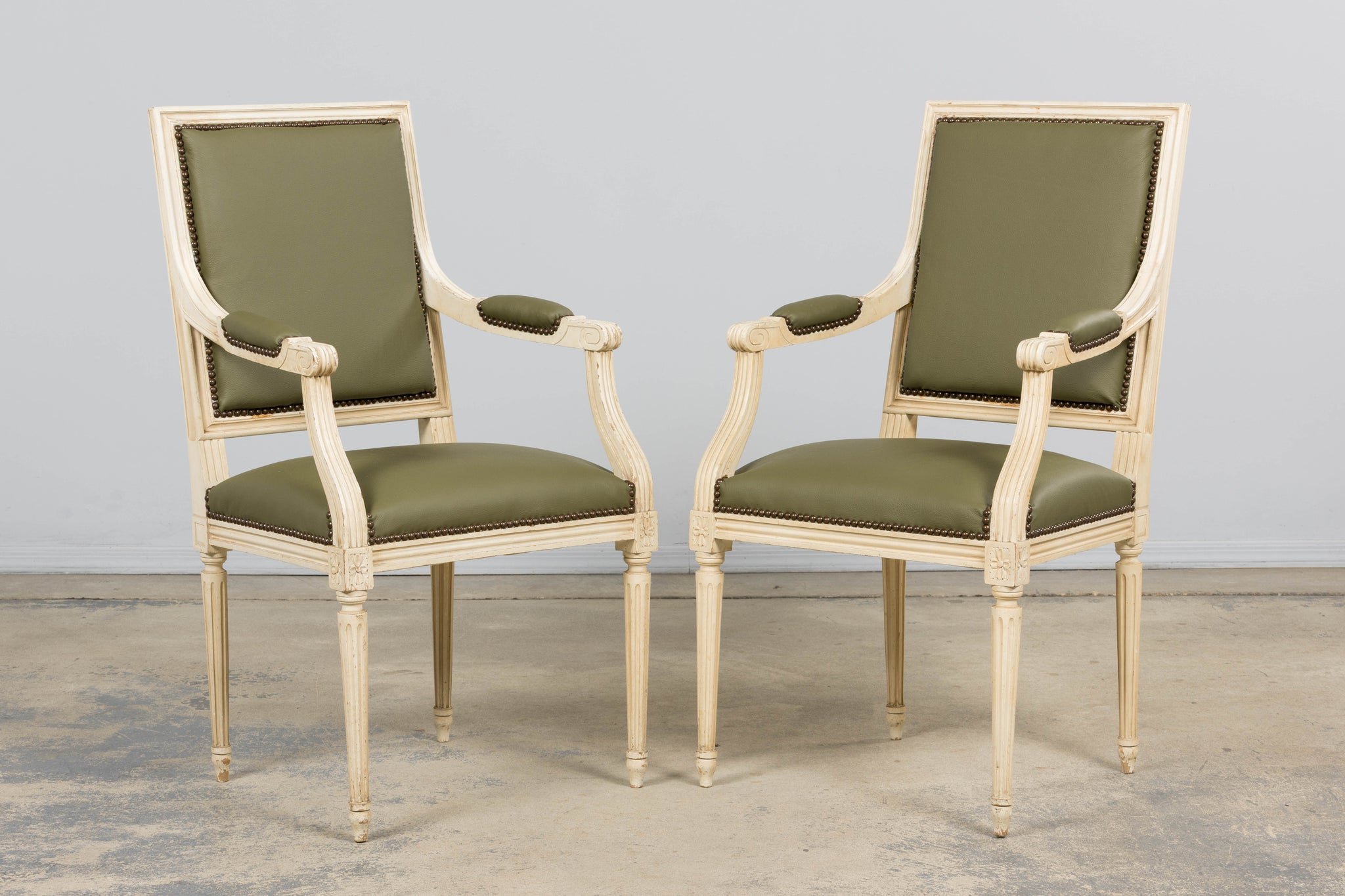 An exquisite set of eight French Louis XVI style restored dining chairs, consisting of six side chairs and two armchairs, sourced in Paris, France. This elegant set features classic Louis XVI proportions with square upholstered backs, straight lines, and finely fluted tapered legs. The frames are accented with carved rosette corner blocks and subtle neoclassical detailing throughout, giving the chairs a clean, architectural presence that feels refined without being overly formal. The armchairs are distinguished by gently curved arms with upholstered rests, adding comfort while maintaining the same balanced profile as the side chairs. The chairs retain their original painted finish, with beautifully aged patina and wear consistent with age and use. The entire set has undergone a careful, full restoration intended for long-term everyday use. All frames were structurally revised, reinforced, and tightened. Seats and backs were completely rebuilt and newly upholstered in a high-quality Italian olive green leather, selected for its rich tone, supple hand, and durability. The leather provides a refined contrast to the painted frames and elevates the overall presentation. Upholstery is finished with hand-applied brass nailhead trim, applied with consistent spacing for a clean, tailored finish. A substantial, well-executed set that combines original French craftsmanship with premium materials and thoughtful restoration, suitable for both formal dining rooms and relaxed, lived-in interiors.