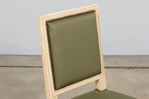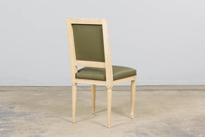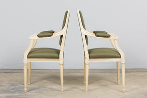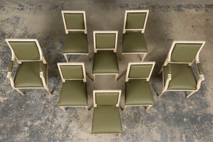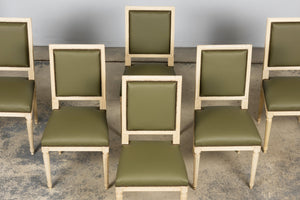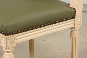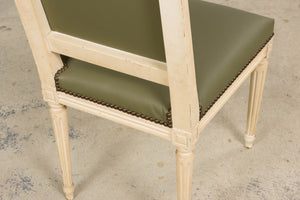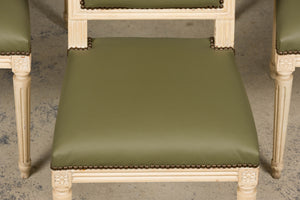 Antique French Louis XVI Style Painted Dining Chairs in Olive Green Leather - Set of 8