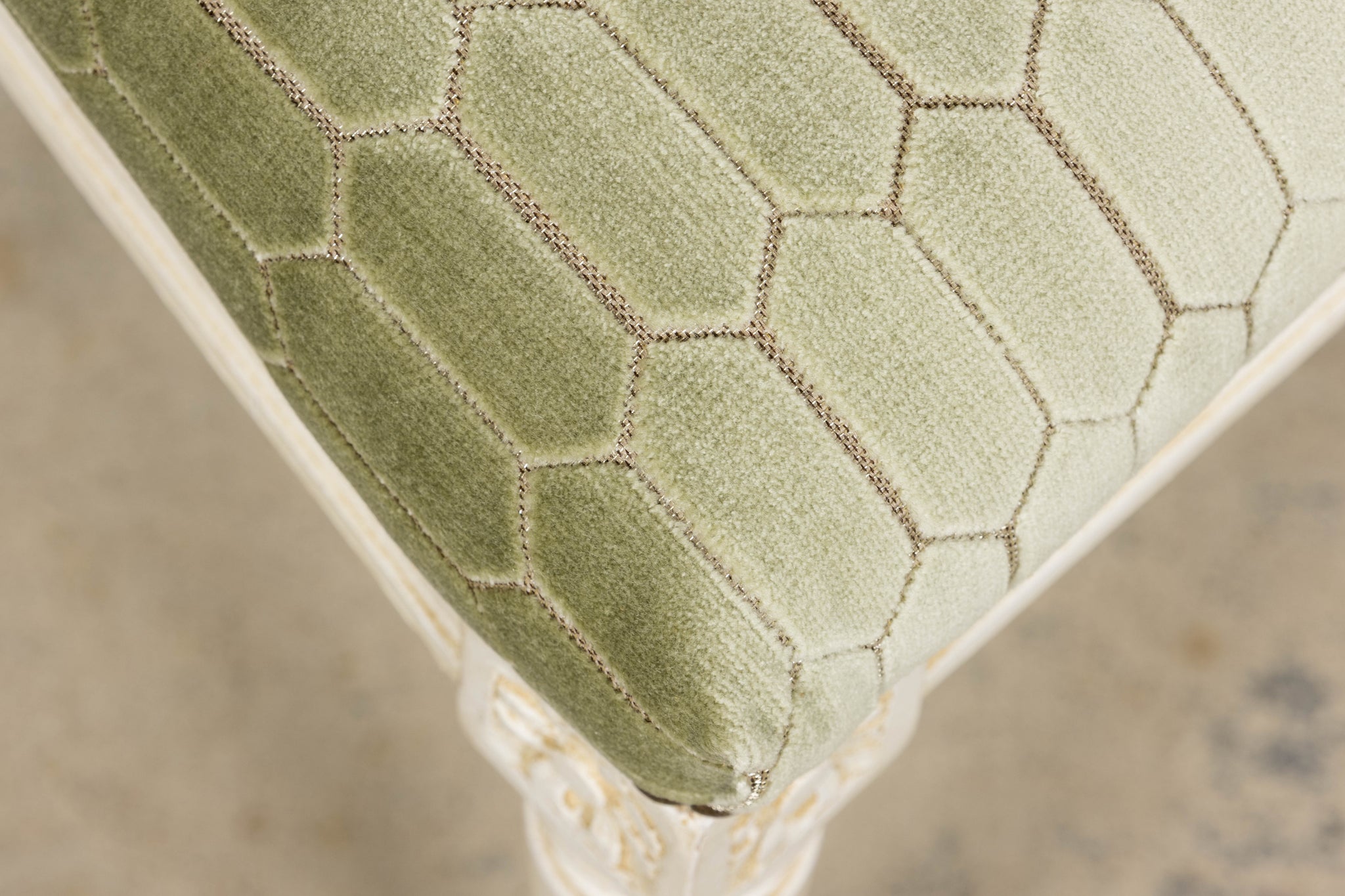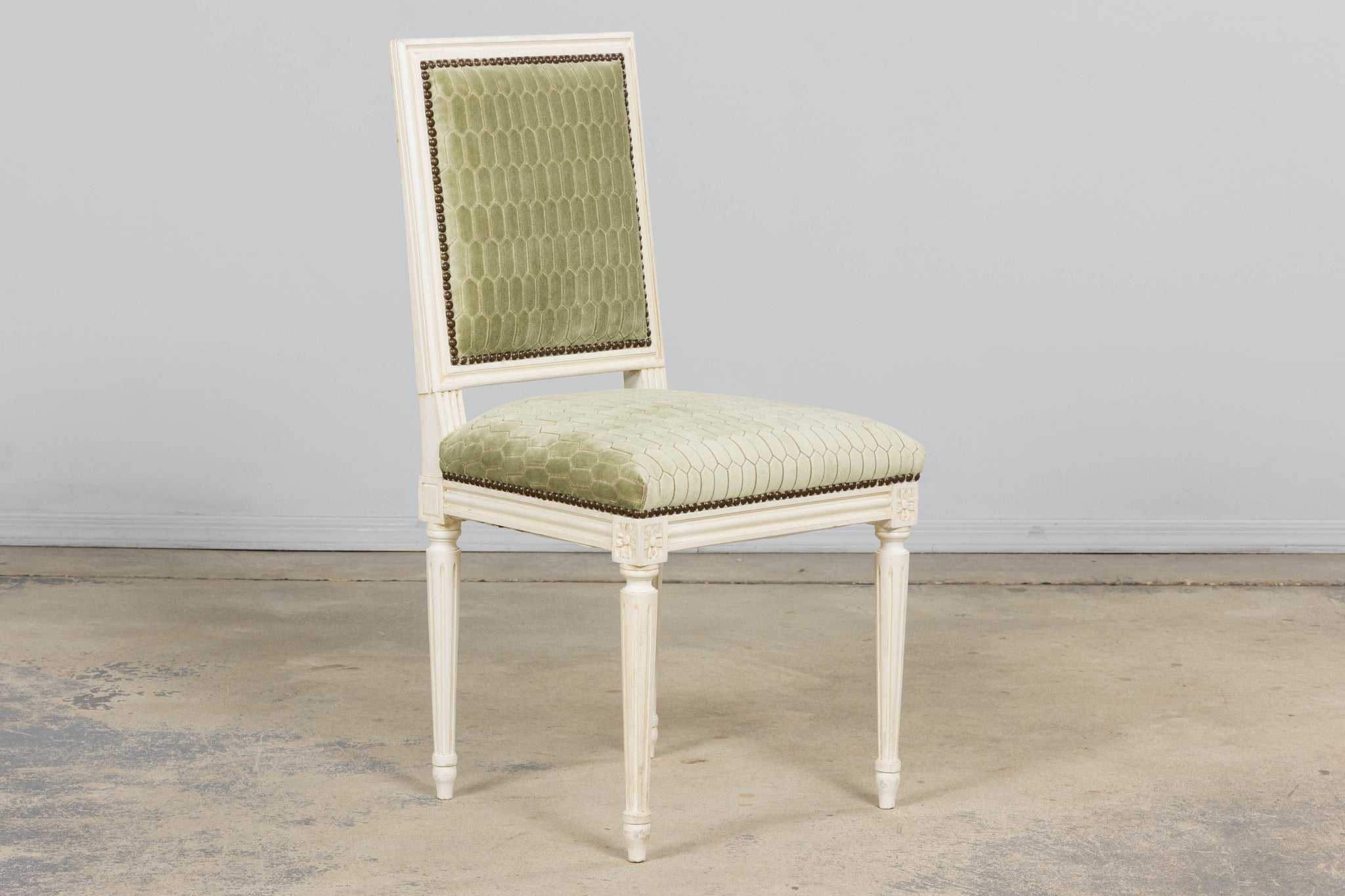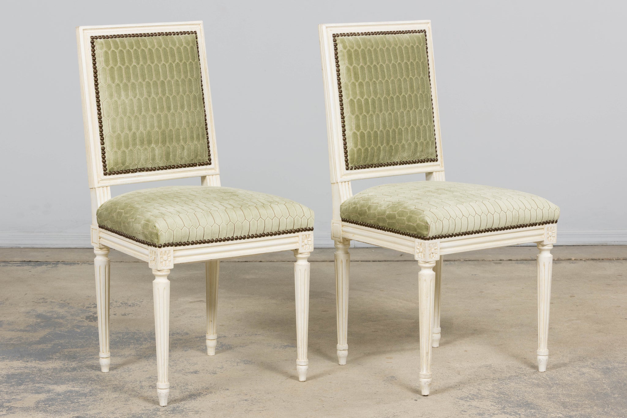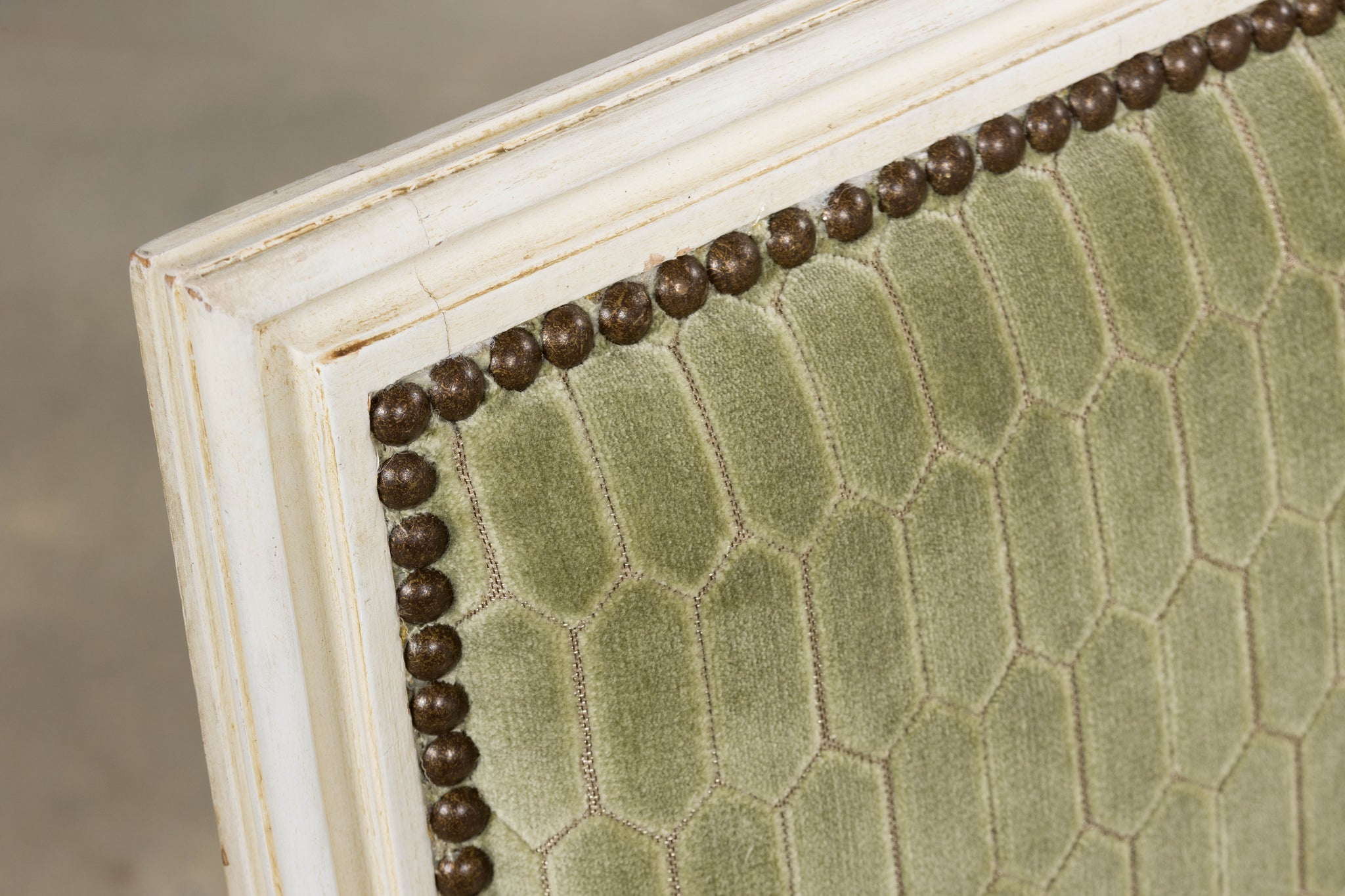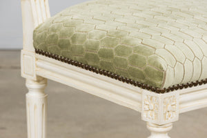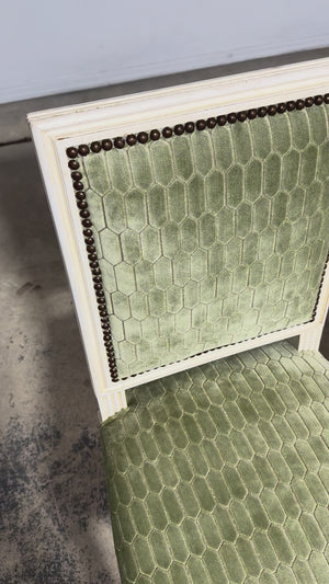 A refined pair of French Louis XVI style side chairs sourced in Paris, dating to the early 20th century. Each chair features a classic rectilinear back with molded framing, fluted tapering legs, and carved rosette corner blocks, all hallmarks of the Louis XVI neoclassical canon. The frames retain a softly aged painted finish with warm undertones and natural patina, highlighting the carved details and linear fluting throughout. Intentional wear, minor rubs, and surface variation are consistent with age and contribute to the chairs’ authentic character. The chairs have been structurally revised in our design studio and are solid and stable for daily use. They have been newly upholstered in a luxurious geometric cut velvet by Stout Textiles in a muted green tone. The fabric features a subtle vertical and horizontal repeat that adds depth and texture while remaining elegant and restrained. Upholstery is finished with hand-applied decorative nailhead trim along the seat and back. Tailored proportions and generous seat depth make these chairs well suited for dining, desk, or accent use in both traditional and transitional interiors.