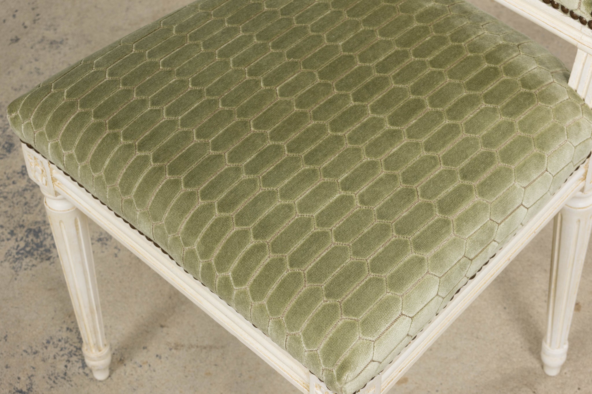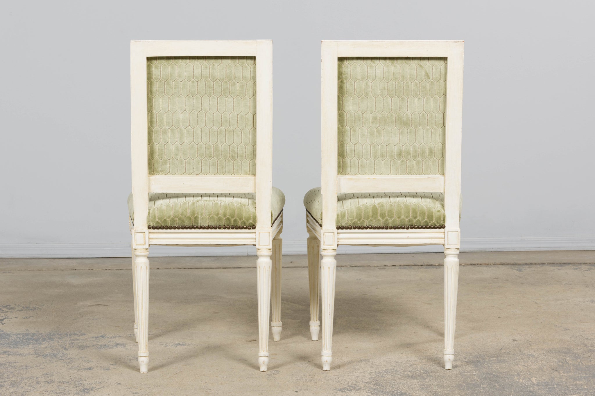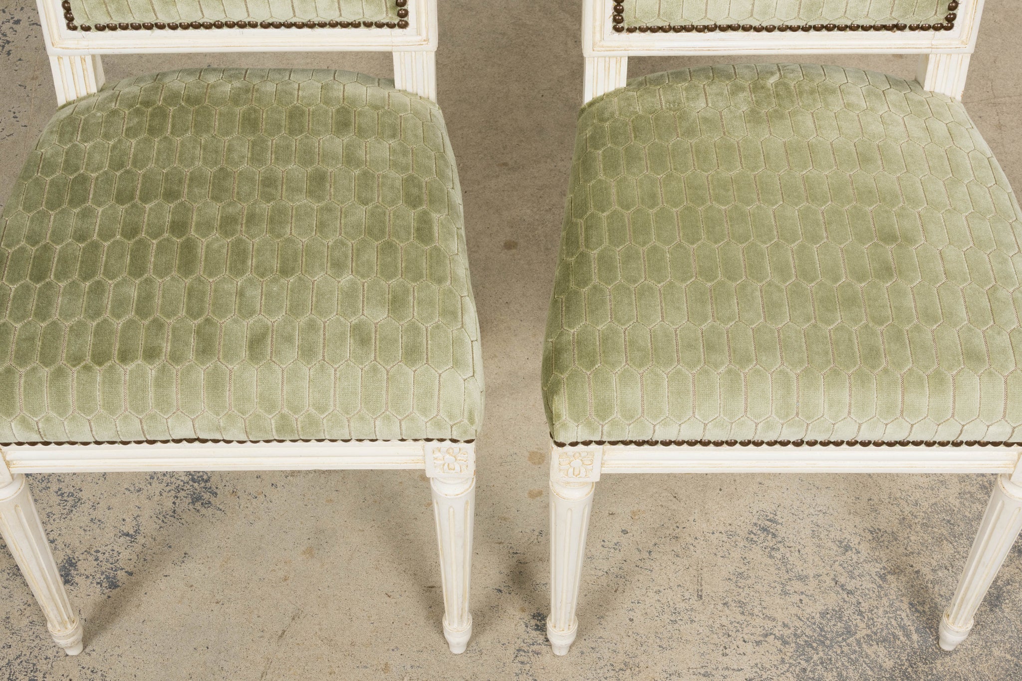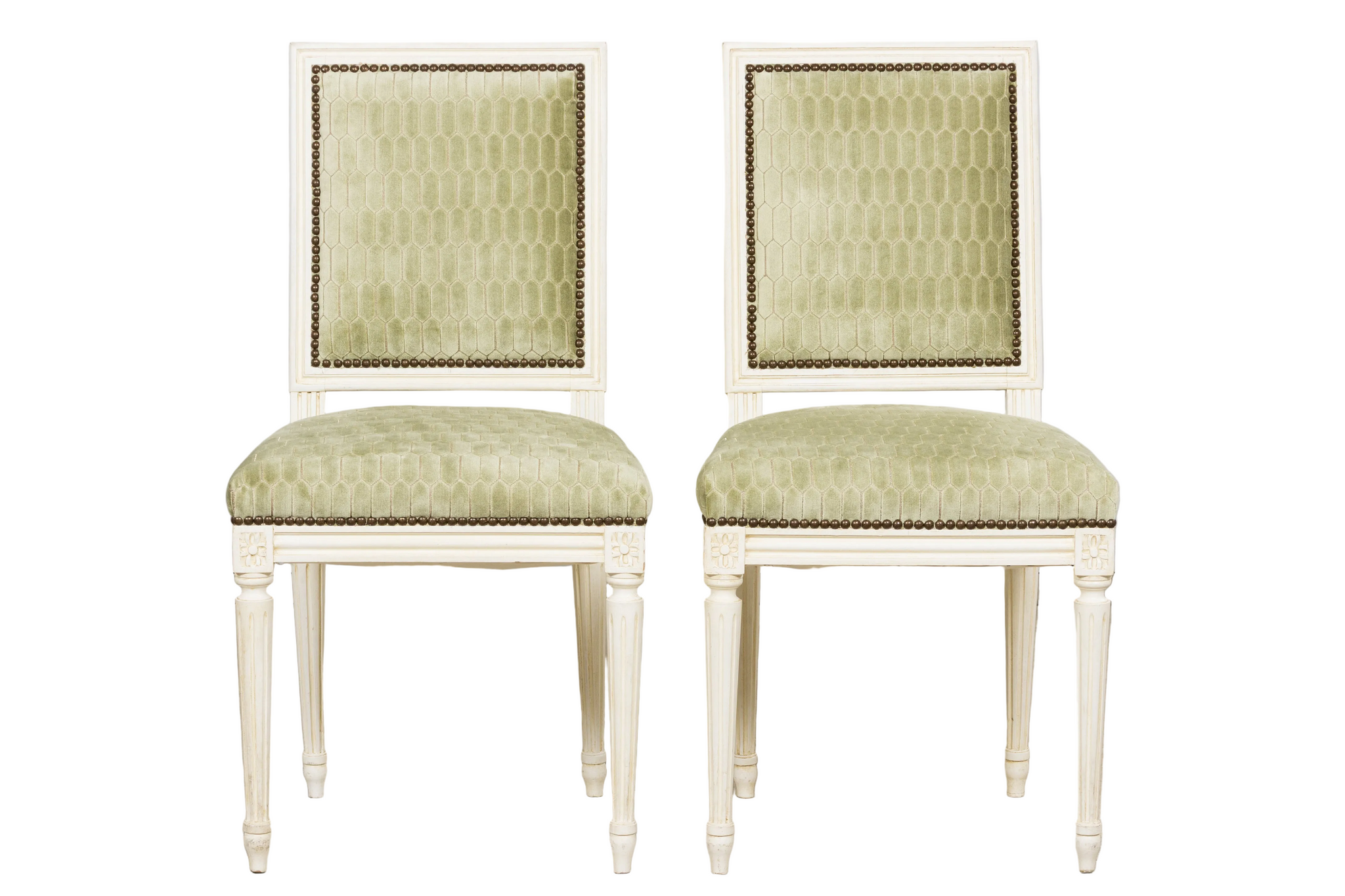 A refined pair of French Louis XVI style side chairs sourced in Paris, dating to the early 20th century. Each chair features a classic rectilinear back with molded framing, fluted tapering legs, and carved rosette corner blocks, all hallmarks of the Louis XVI neoclassical canon. The frames retain a softly aged painted finish with warm undertones and natural patina, highlighting the carved details and linear fluting throughout. Intentional wear, minor rubs, and surface variation are consistent with age and contribute to the chairs’ authentic character. The chairs have been structurally revised in our design studio and are solid and stable for daily use. They have been newly upholstered in a luxurious geometric cut velvet by Stout Textiles in a muted green tone. The fabric features a subtle vertical and horizontal repeat that adds depth and texture while remaining elegant and restrained. Upholstery is finished with hand-applied decorative nailhead trim along the seat and back. Tailored proportions and generous seat depth make these chairs well suited for dining, desk, or accent use in both traditional and transitional interiors.