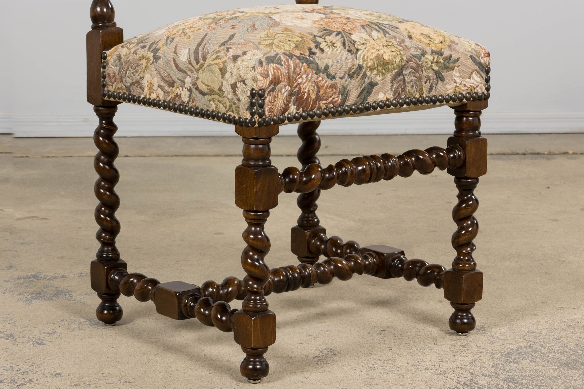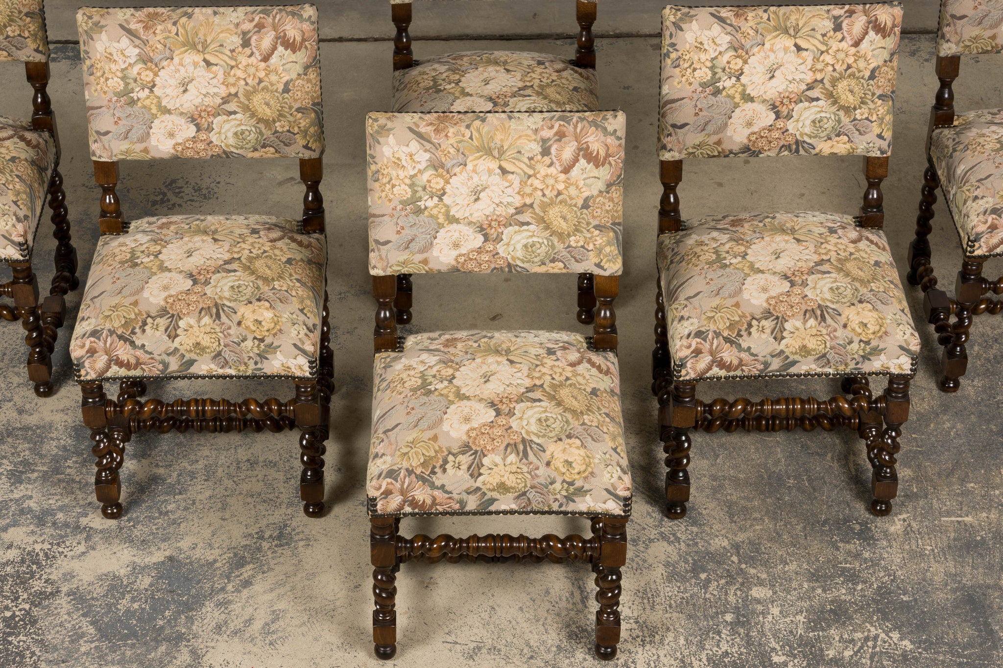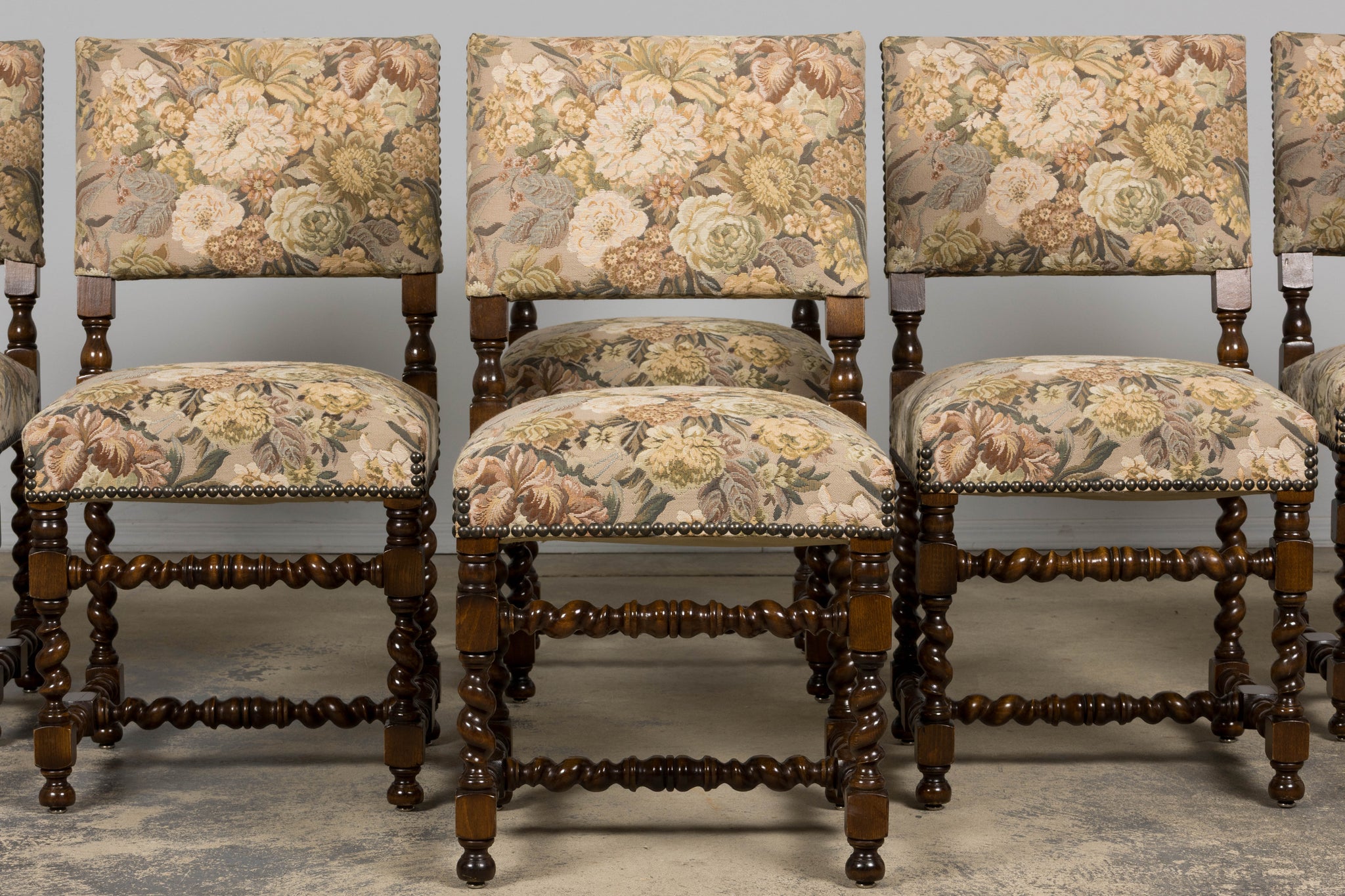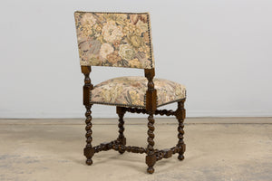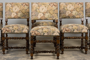 Set of 8 antique French Louis XIII style walnut dining chairs, sourced in Provence, France and dating to the early 20th century. The chairs feature classic barley twist legs and stretchers with square block joints and turned elements, characteristic of the Louis XIII revival style. The chairs retain their original floral tapestry upholstery, woven on a warm neutral ground with a traditional floral pattern in muted green, golden, and brown tones. The upholstery is finished with traditional cat-eye nailhead trim along the seat and back edges.Seats are comfortably padded and suitable for everyday dining use. The oak frames have been structurally revised and tightened to ensure stability. The wood has been carefully polished, preserving a warm patina while highlighting the depth and detail of the turned elements. A strong, architectural set well suited for a traditional dining room, country house, or layered interior with classical or provincial influence.