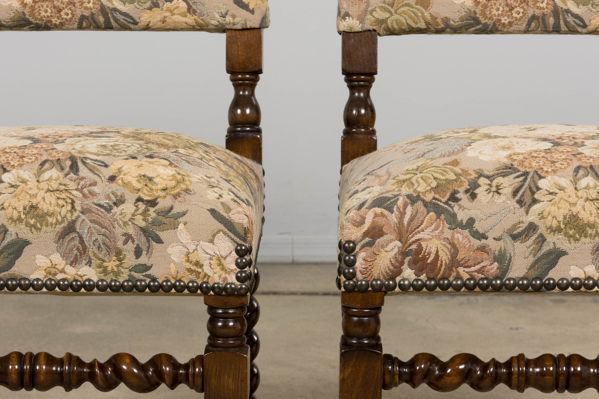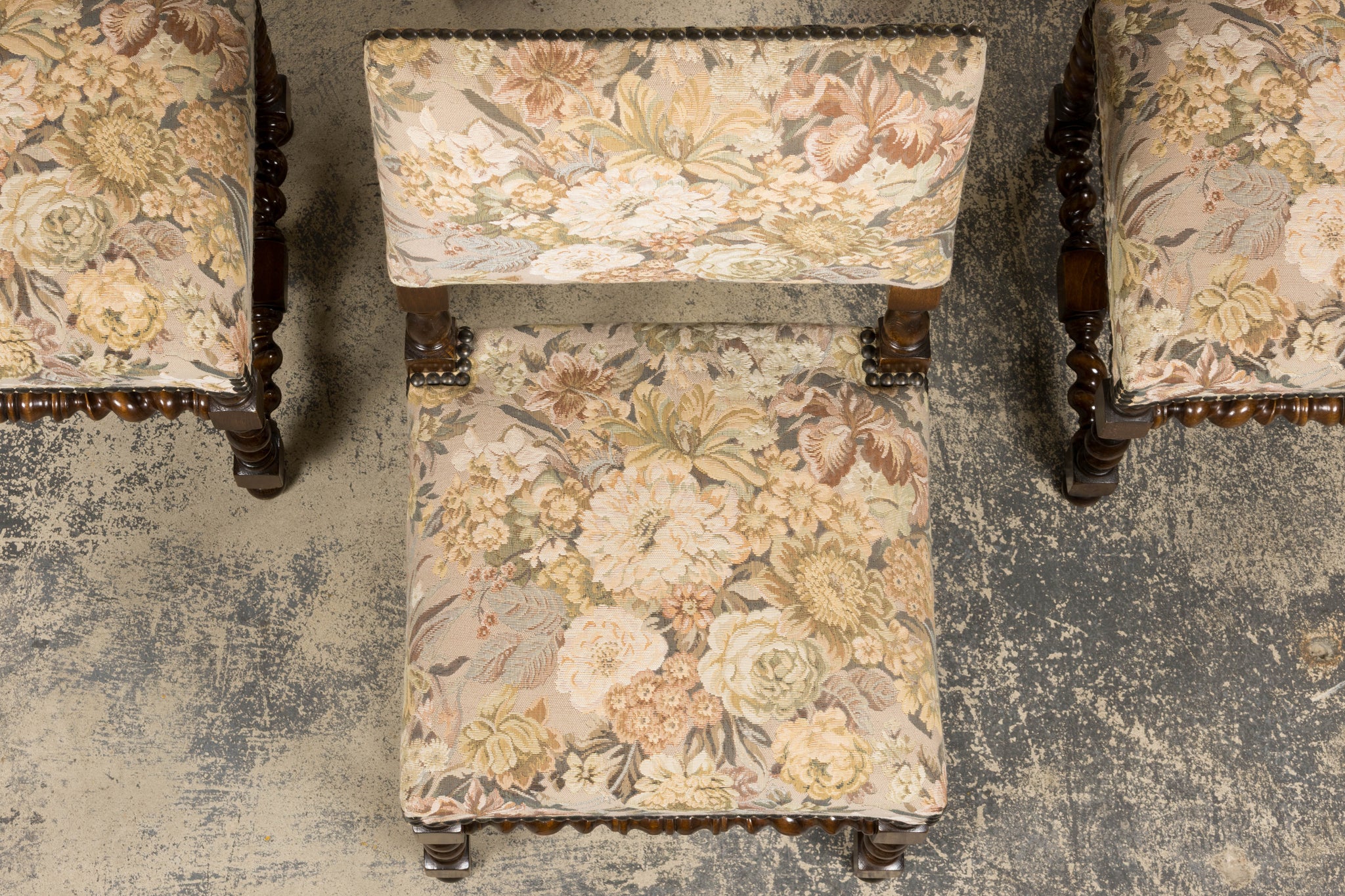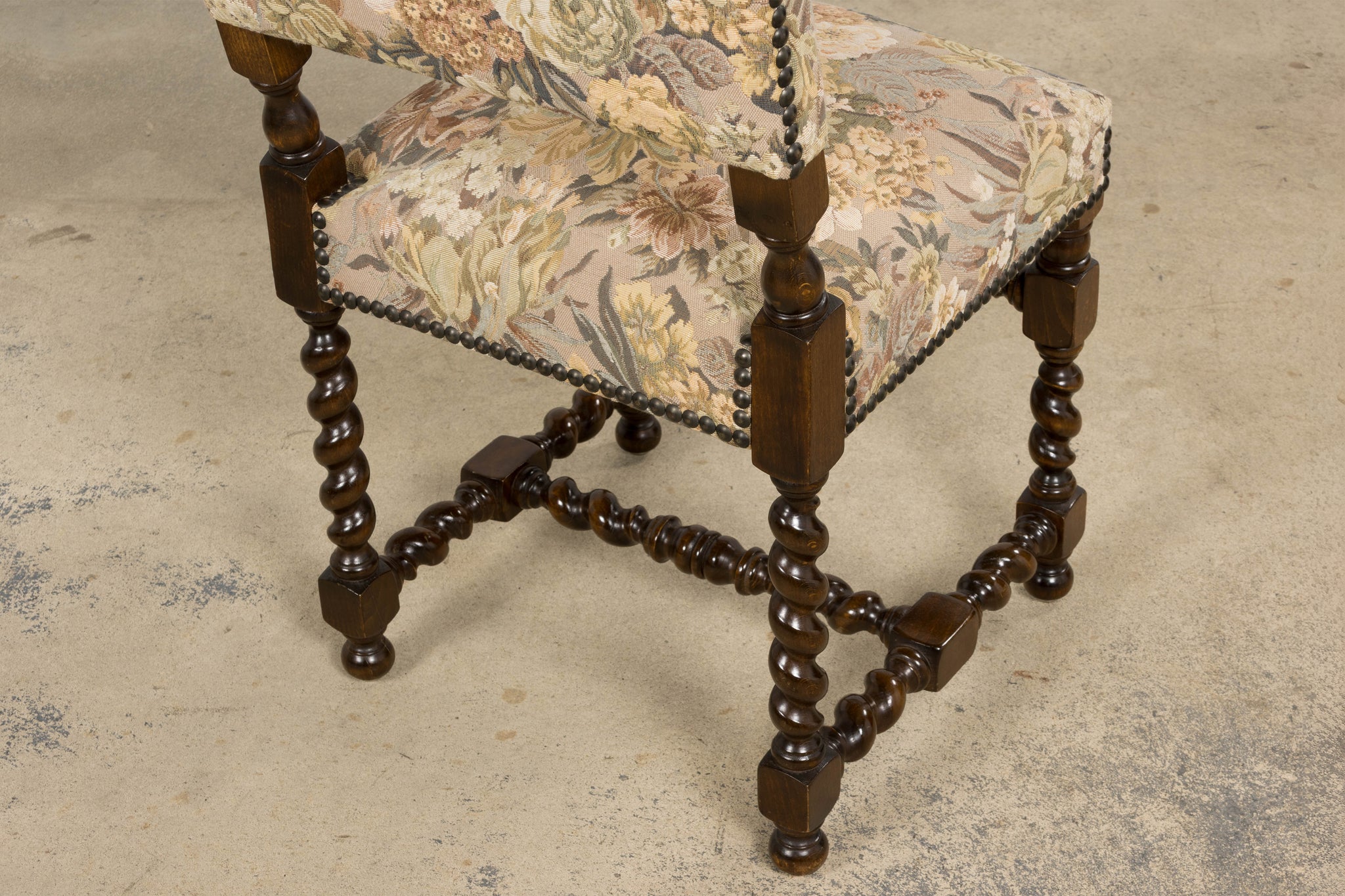 Set of 8 antique French Louis XIII style walnut dining chairs, sourced in Provence, France and dating to the early 20th century. The chairs feature classic barley twist legs and stretchers with square block joints and turned elements, characteristic of the Louis XIII revival style. The chairs retain their original floral tapestry upholstery, woven on a warm neutral ground with a traditional floral pattern in muted green, golden, and brown tones. The upholstery is finished with traditional cat-eye nailhead trim along the seat and back edges.Seats are comfortably padded and suitable for everyday dining use. The oak frames have been structurally revised and tightened to ensure stability. The wood has been carefully polished, preserving a warm patina while highlighting the depth and detail of the turned elements. A strong, architectural set well suited for a traditional dining room, country house, or layered interior with classical or provincial influence.