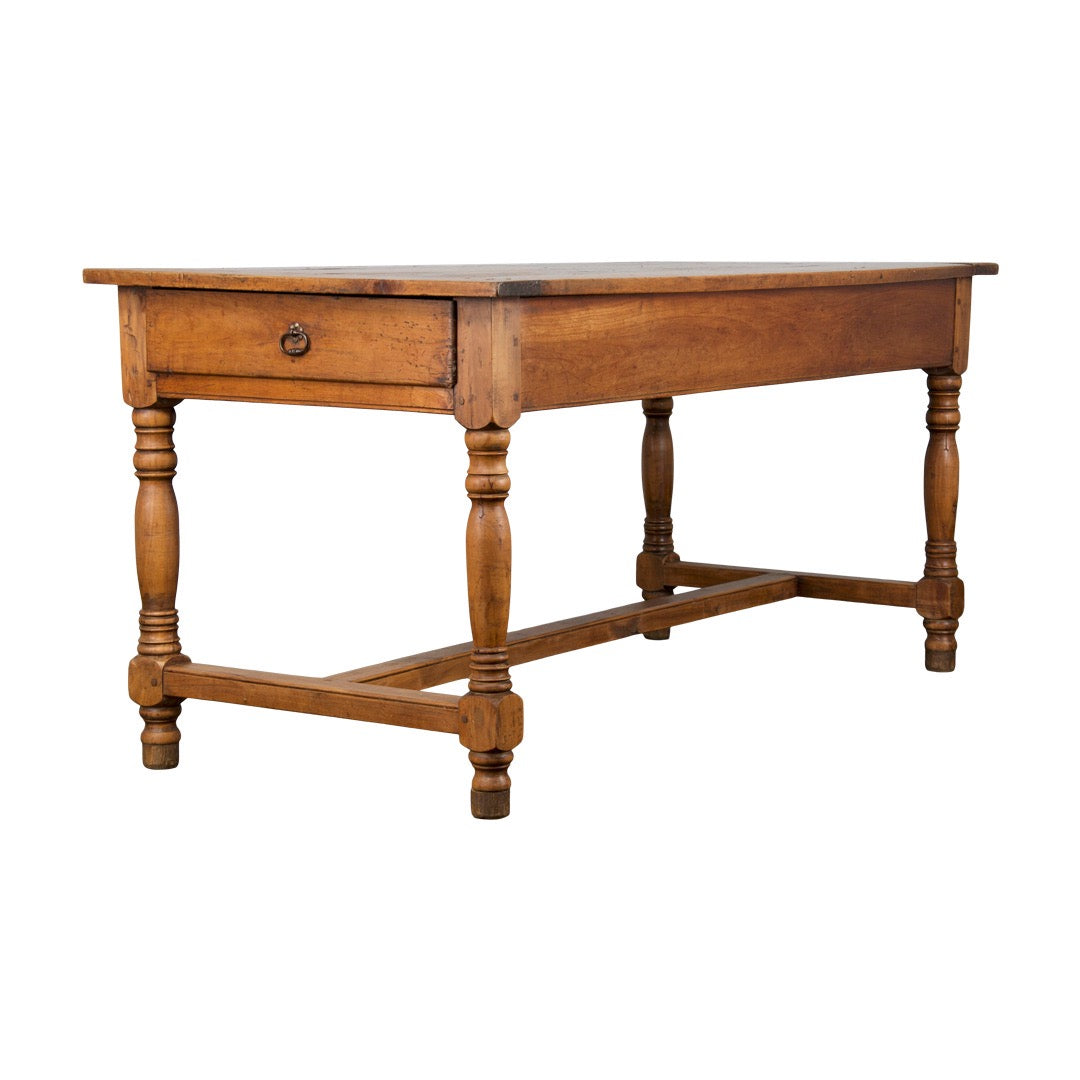 A traditional set of six mid-20th century French Country dining chairs, crafted in the Louis XV style and sourced from Provence, France. Expertly hand-crafted from solid maple, the chairs have been structurally restored for stability and gently polished, revealing a rich brown tone with a beautifully aged natural patina. The chairs retain their original brown leather upholstery, finished with gold leaf trim and classic nailhead detailing. The leather displays its original character, with visible signs of age including natural cracking and areas of tasteful distress—adding to the set’s authentic charm. The serpentine curves along the front and sides of the seat enhance the silhouette, while hand-carved cabriole legs ending in scroll toes echo the timeless Louis XV influence. Solid and stable with excellent joinery, this set reflects traditional French Country elegance and craftsmanship.