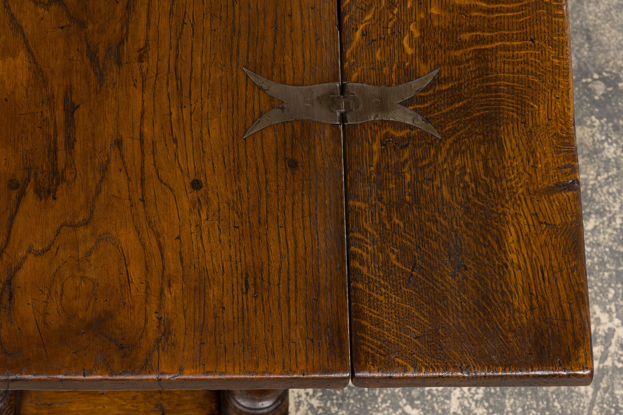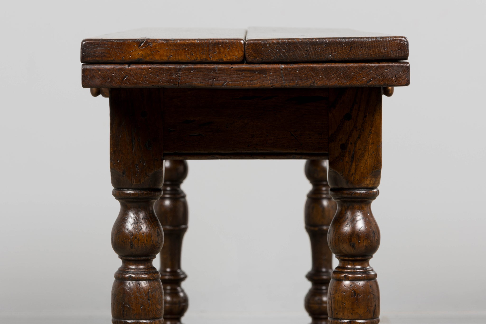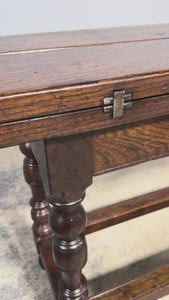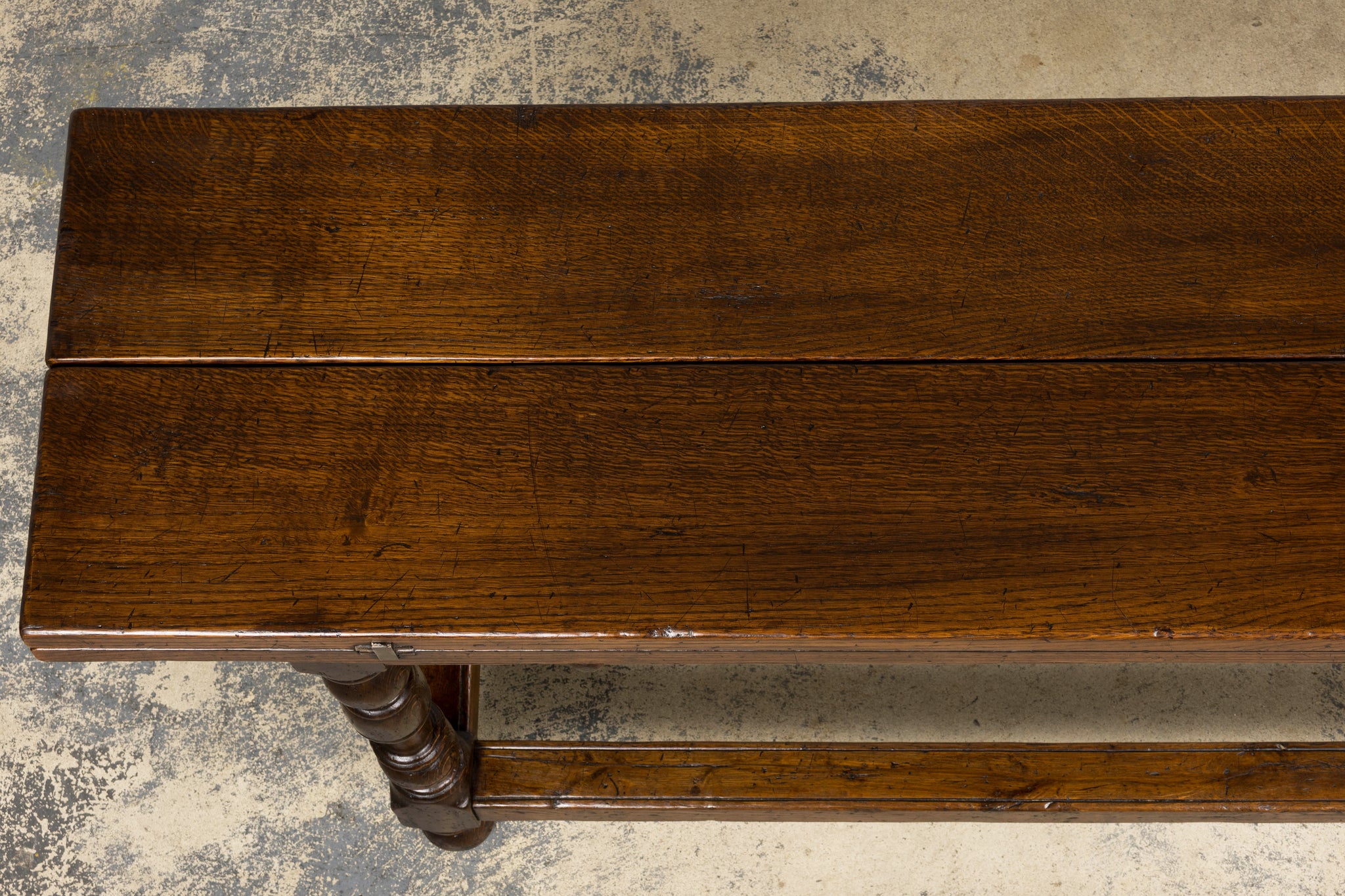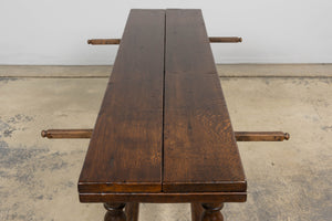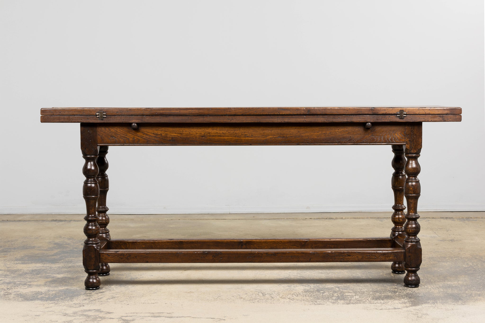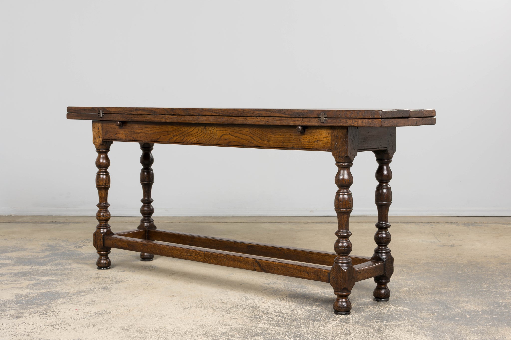 This antique French oak folding table was sourced in the French Alps and dates to the early 19th century. Crafted from solid oak throughout, the piece reflects the honest, utilitarian craftsmanship of provincial French furniture, designed for everyday use and built to last. The long, narrow top is formed from two wide oak planks with a central seam, reinforced by inset iron butterfly (bow-tie) braces - a traditional structural detail that adds both stability and visual interest. The surface showcases a beautifully aged patina, with expressive grain, subtle undulation, and surface wear developed over generations of use, giving the table warmth and character without feeling rustic or heavy. Raised on turned baluster legs joined by a low stretcher, the base provides excellent stability and a strong architectural presence. Its proportions make it especially versatile: when closed, it works effortlessly as a console or serving table; when opened, it offers a generous surface ideal for kitchen prep, casual dining, or use as a work table. The table has been structurally restored in our workshop to ensure solidity and everyday functionality, then carefully polished and finished with wax to preserve the natural color, depth, and patina of the oak. A highly adaptable antique with soulful presence, this piece integrates beautifully into kitchens, dining spaces, entry halls, or layered modern interiors that benefit from contrast, texture, and history.