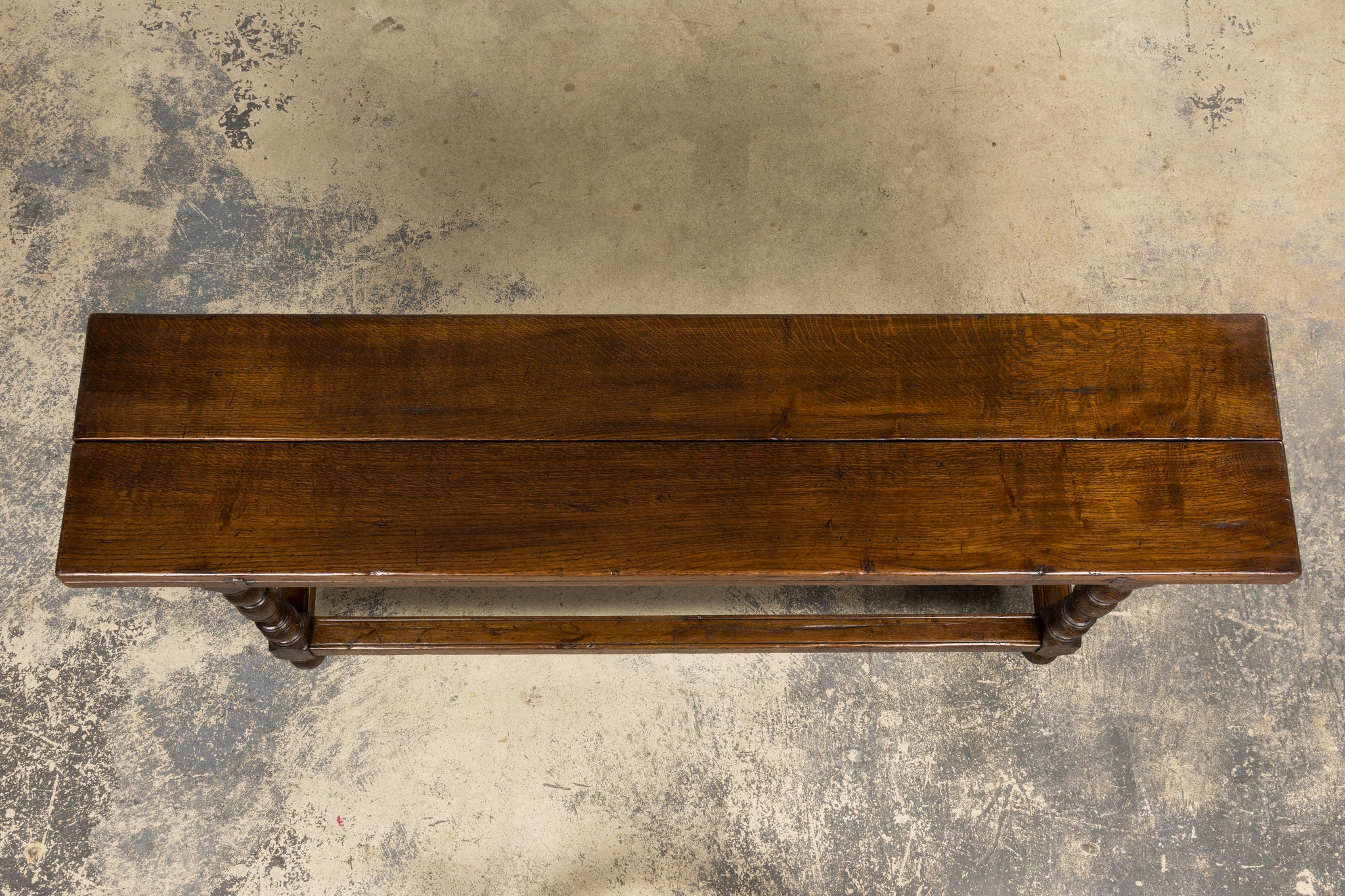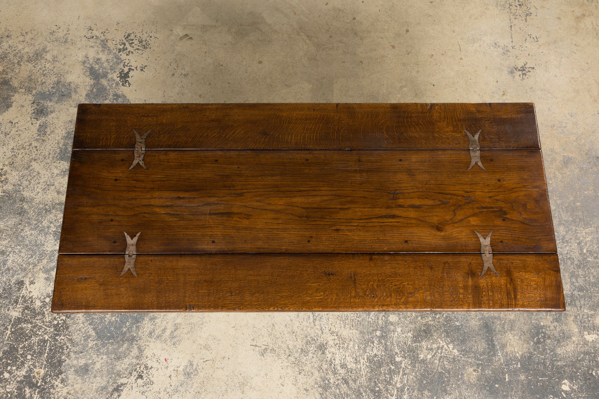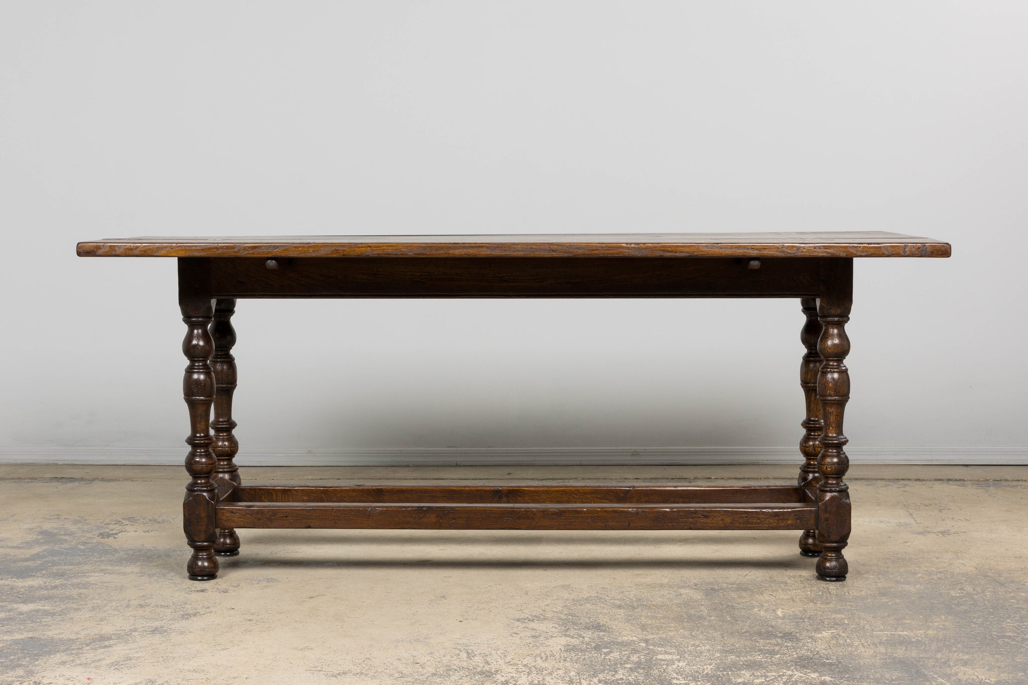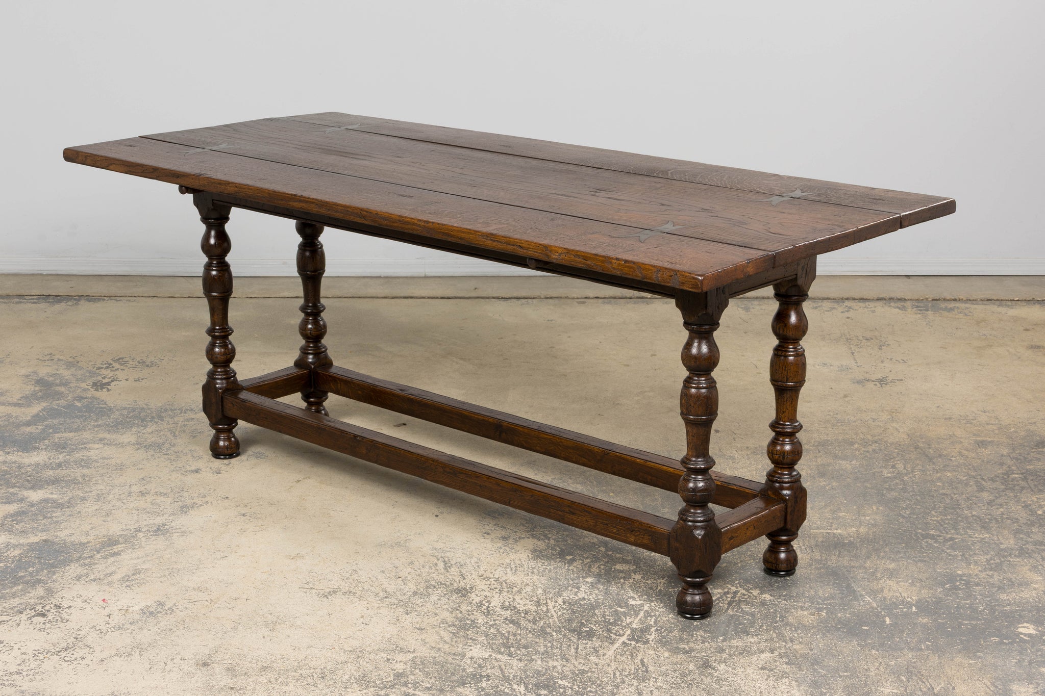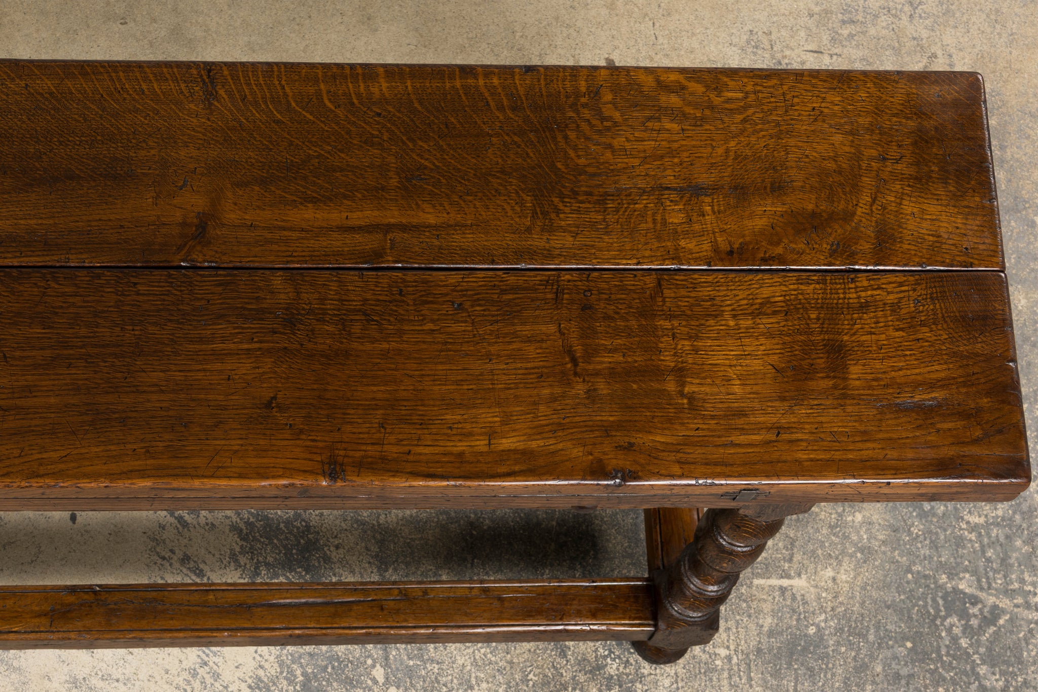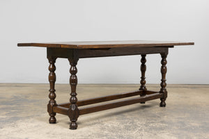 This antique French oak folding table was sourced in the French Alps and dates to the early 19th century. Crafted from solid oak throughout, the piece reflects the honest, utilitarian craftsmanship of provincial French furniture, designed for everyday use and built to last. The long, narrow top is formed from two wide oak planks with a central seam, reinforced by inset iron butterfly (bow-tie) braces - a traditional structural detail that adds both stability and visual interest. The surface showcases a beautifully aged patina, with expressive grain, subtle undulation, and surface wear developed over generations of use, giving the table warmth and character without feeling rustic or heavy. Raised on turned baluster legs joined by a low stretcher, the base provides excellent stability and a strong architectural presence. Its proportions make it especially versatile: when closed, it works effortlessly as a console or serving table; when opened, it offers a generous surface ideal for kitchen prep, casual dining, or use as a work table. The table has been structurally restored in our workshop to ensure solidity and everyday functionality, then carefully polished and finished with wax to preserve the natural color, depth, and patina of the oak. A highly adaptable antique with soulful presence, this piece integrates beautifully into kitchens, dining spaces, entry halls, or layered modern interiors that benefit from contrast, texture, and history.