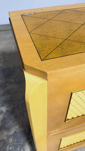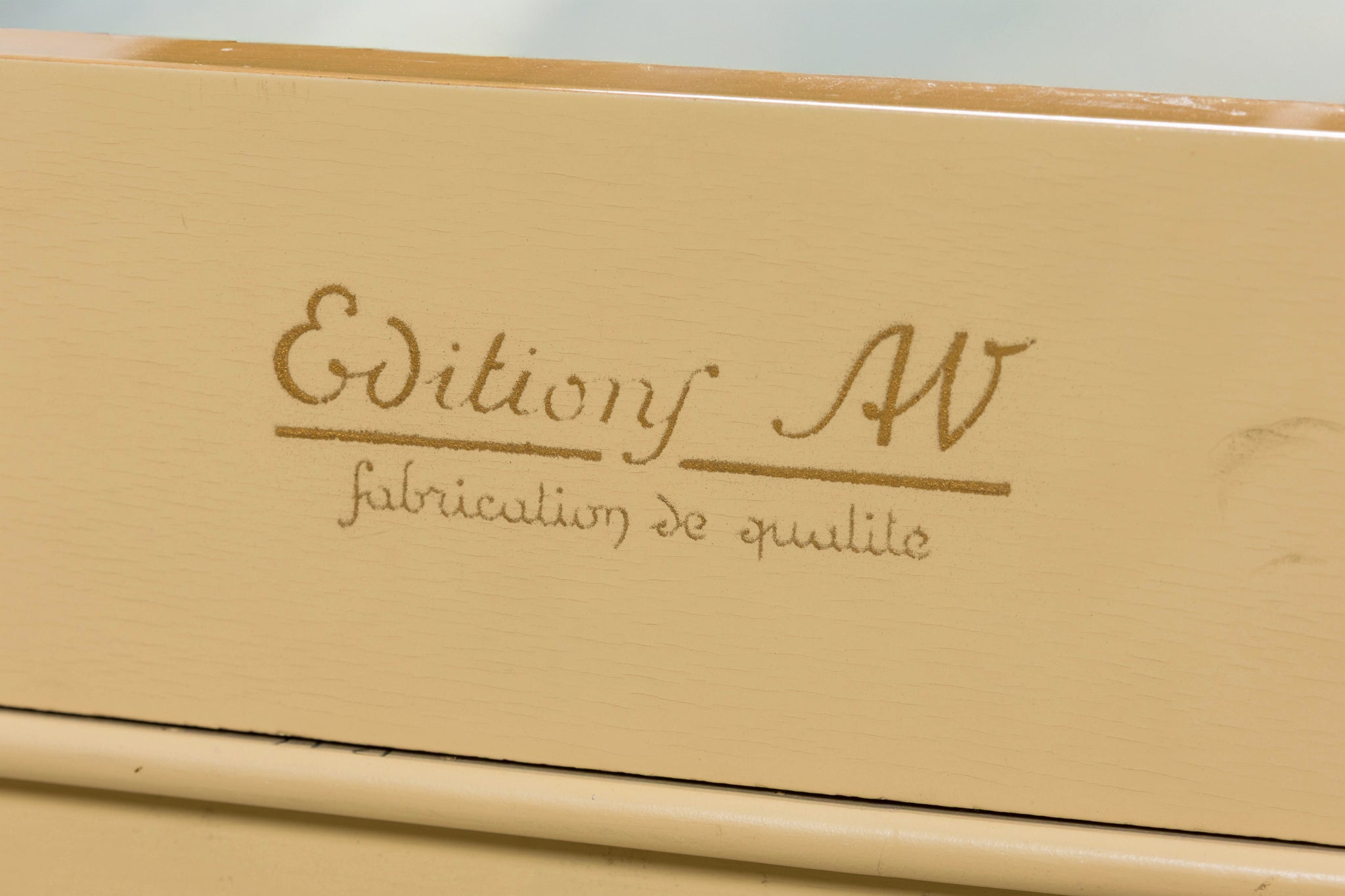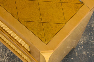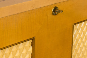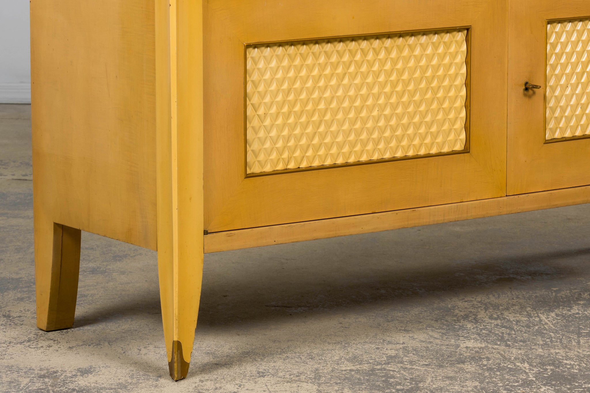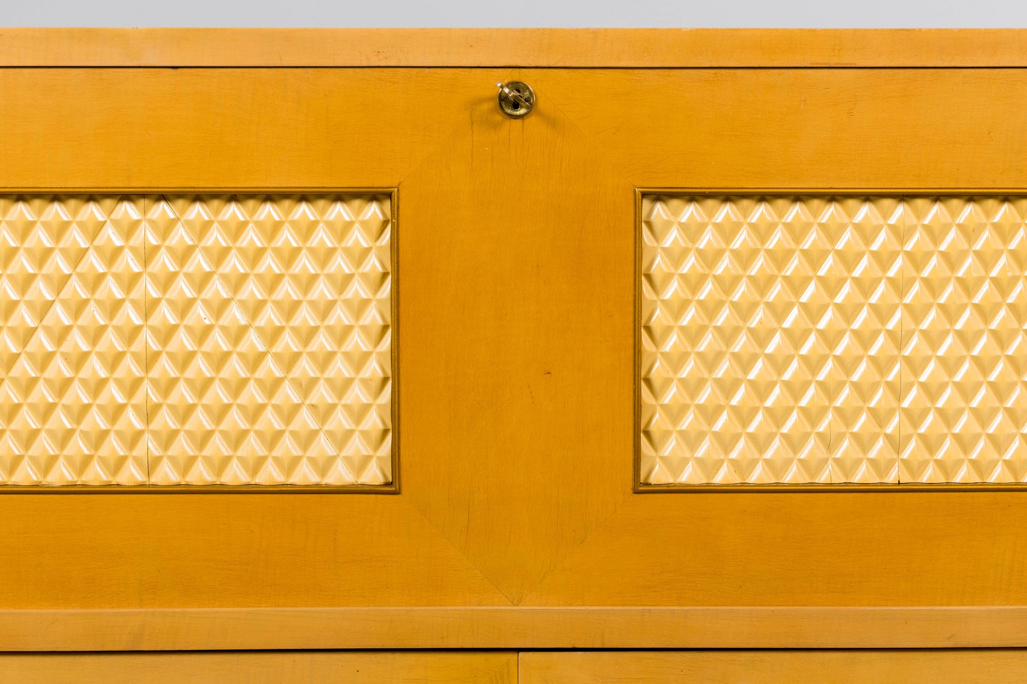 French Art Deco bar cabinet or buffet sourced in Paris, dating to the late 1930s. Finished in its original warm blond lacquer with subtle metallic inclusions that give the surface a soft luminosity in changing light. The top retains its original geometric decoration with fine metallic speckling, a period detail characteristic of high-quality French Art Deco lacquer work. The cabinet has been structurally revised to ensure stability while preserving its original finishes and character.The façade features four inset panels with a repeating geometric relief motif, highlighted with gilt-toned lacquer accents and set within a softly architectural case with rounded vertical edges. The cabinet stands on tapered legs with original gilt-accented feet. The upper section opens to a fitted bar interior with mirrored back, glass base, integrated brass rails for glassware, shaped display shelves, and two small drawers with brass pulls. The lower cabinet offers divided storage compartments suitable for bottles or serving pieces. Original brass hardware throughout. The interior bears a stamped maker’s mark reading “Édition AV – fabrication de qualité,” indicating French workshop production. Wear and patina are consistent with age and use, and contribute to the piece’s authentic character.