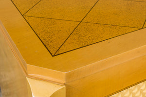 - Condition: Wear consistent with age and use. Structurally revised and sound. Original blond lacquer with metallic inclusions and gilt accents at the feet, showing minor surface wear, small scuffs, and natural patina.