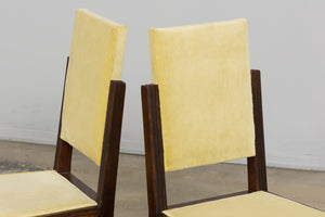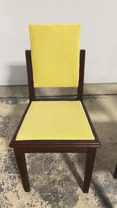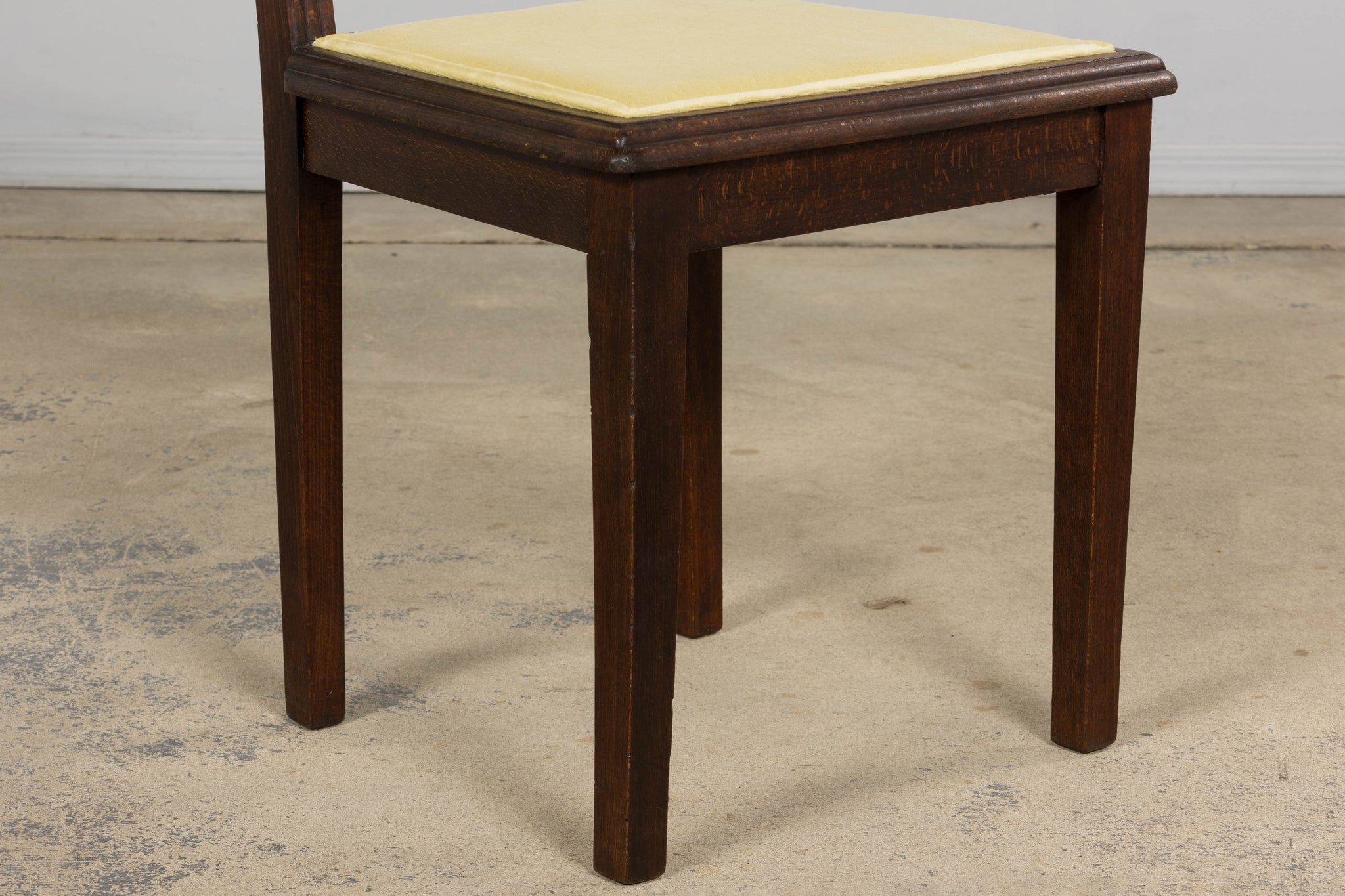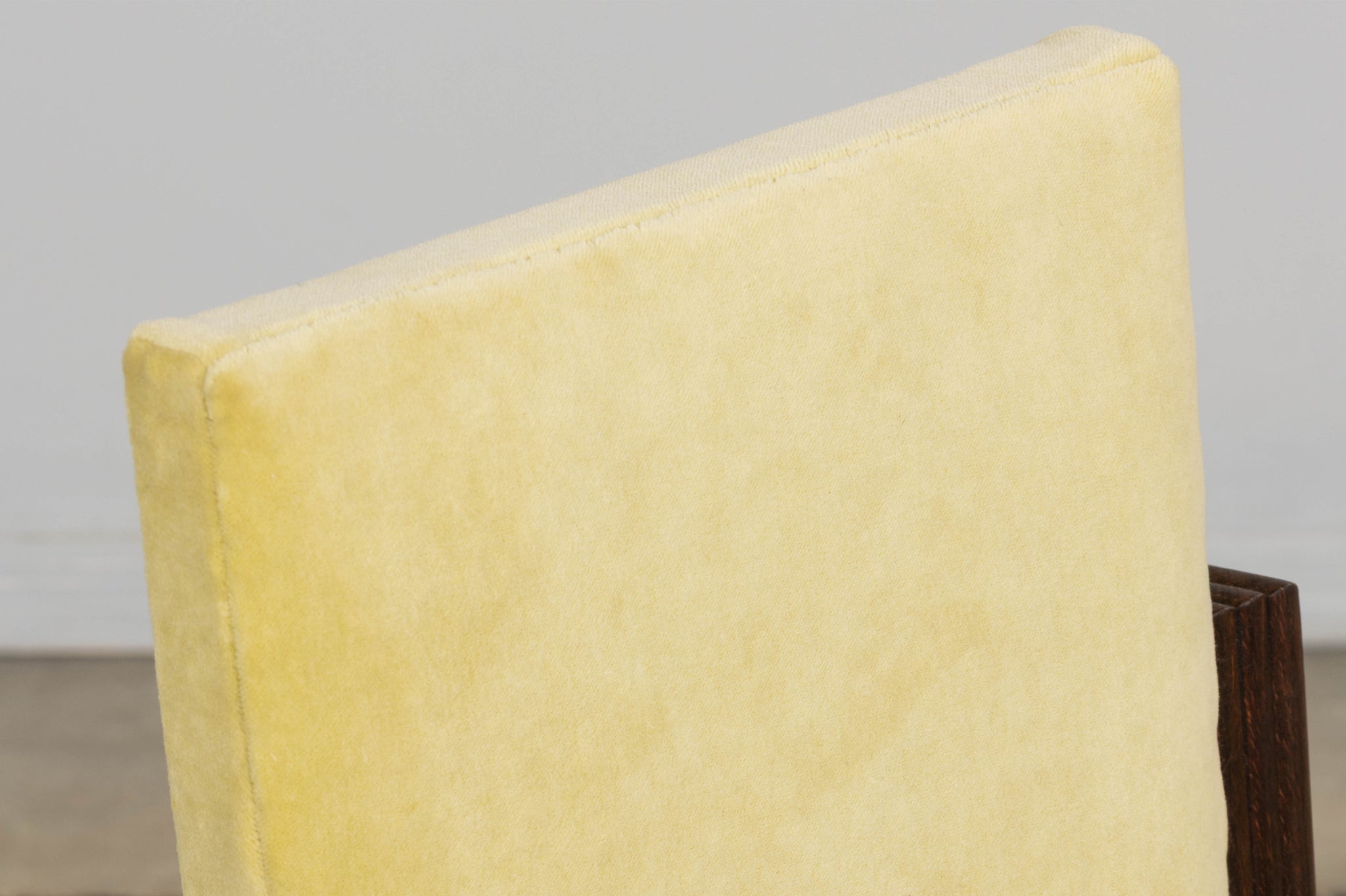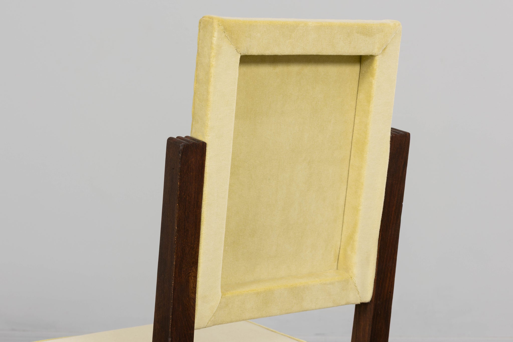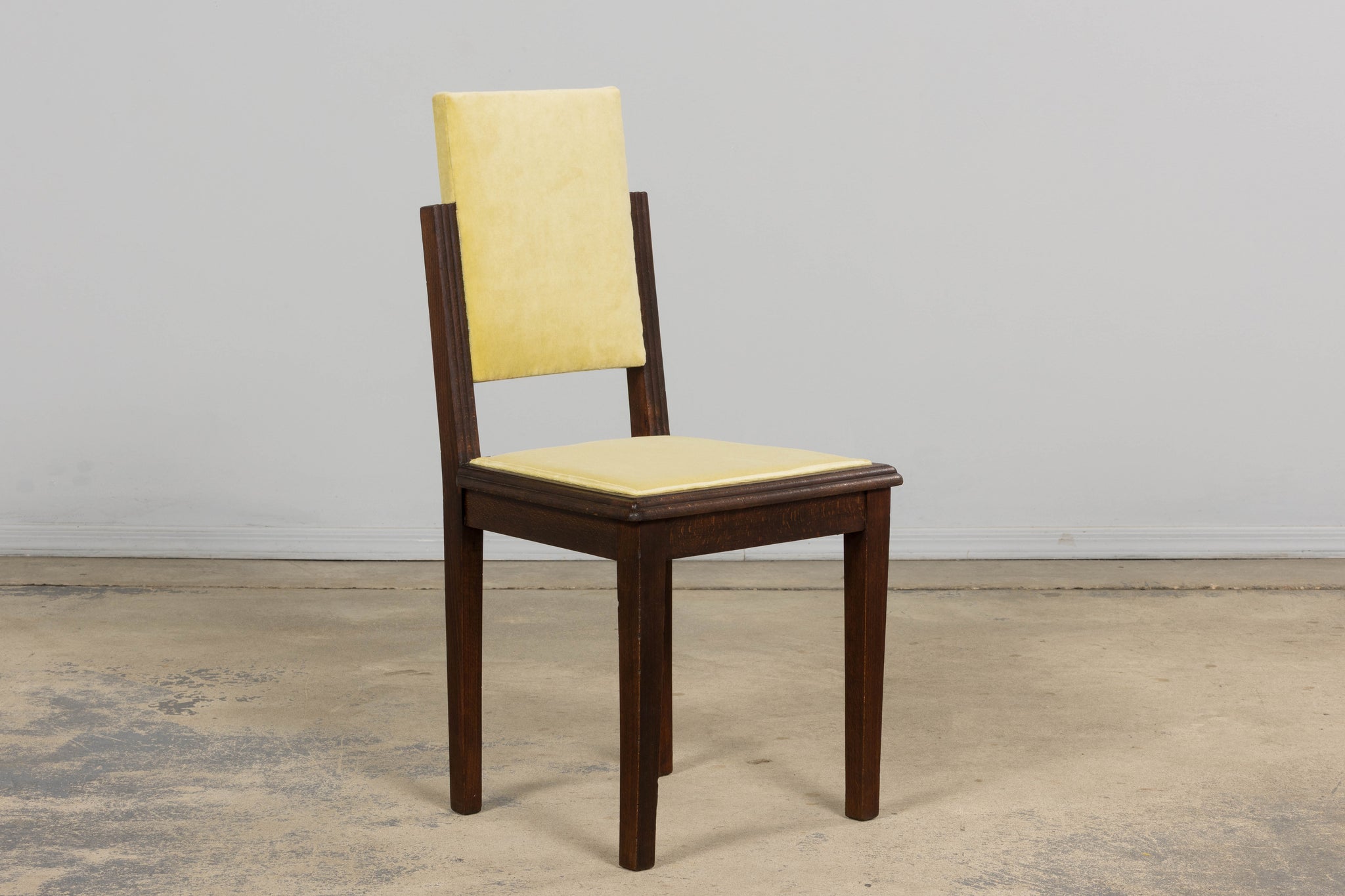 Sourced in Paris, this set of eight French Art Deco dining chairs dates to the 1930s. The chairs feature a clean, rectilinear form with straight legs, square seats, and fully upholstered rectangular backs set between exposed vertical uprights. The frames are constructed in solid oak and have been fully restored in our workshop. All frames were structurally reinforced and the wood carefully refinished. The seats and backs were completely rebuilt and newly upholstered in a light yellow velvet. The upholstery has a soft, even finish and presents cleanly across the set. The chairs are solid, well-proportioned, and comfortable for dining use.