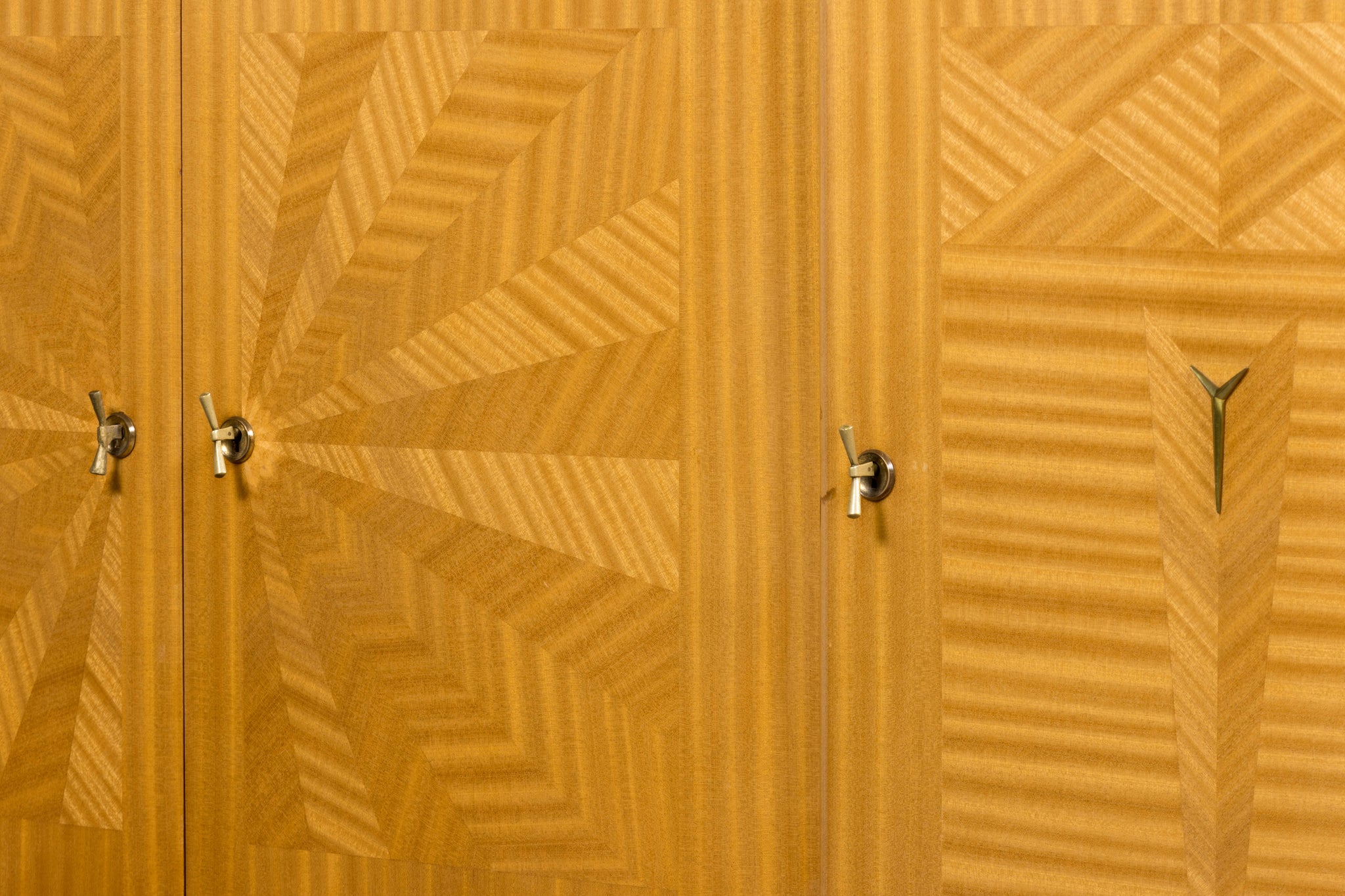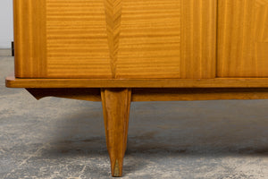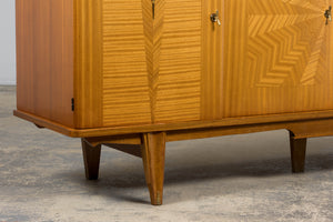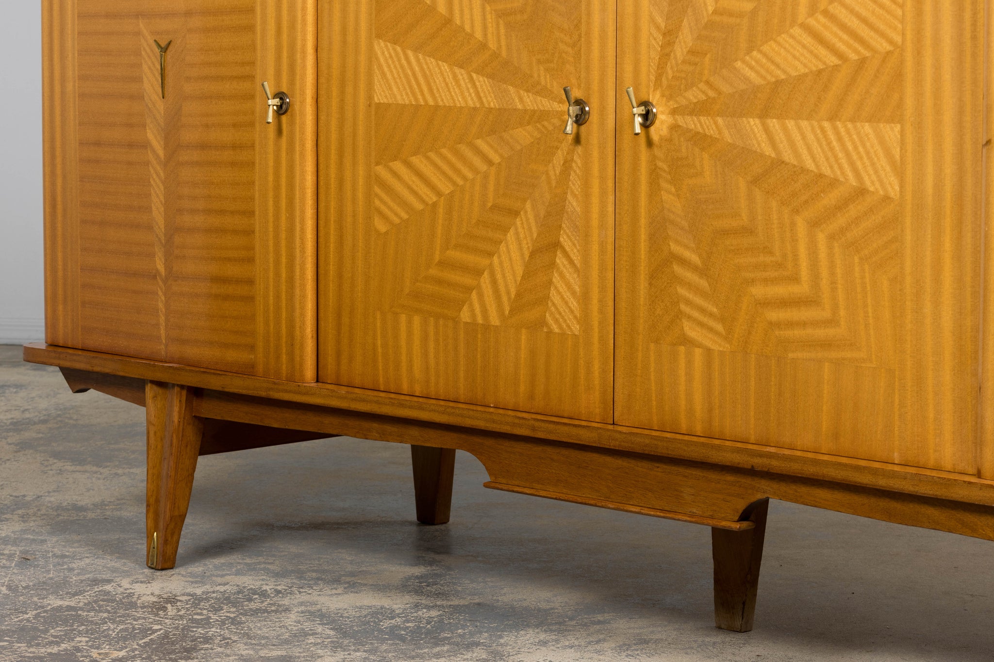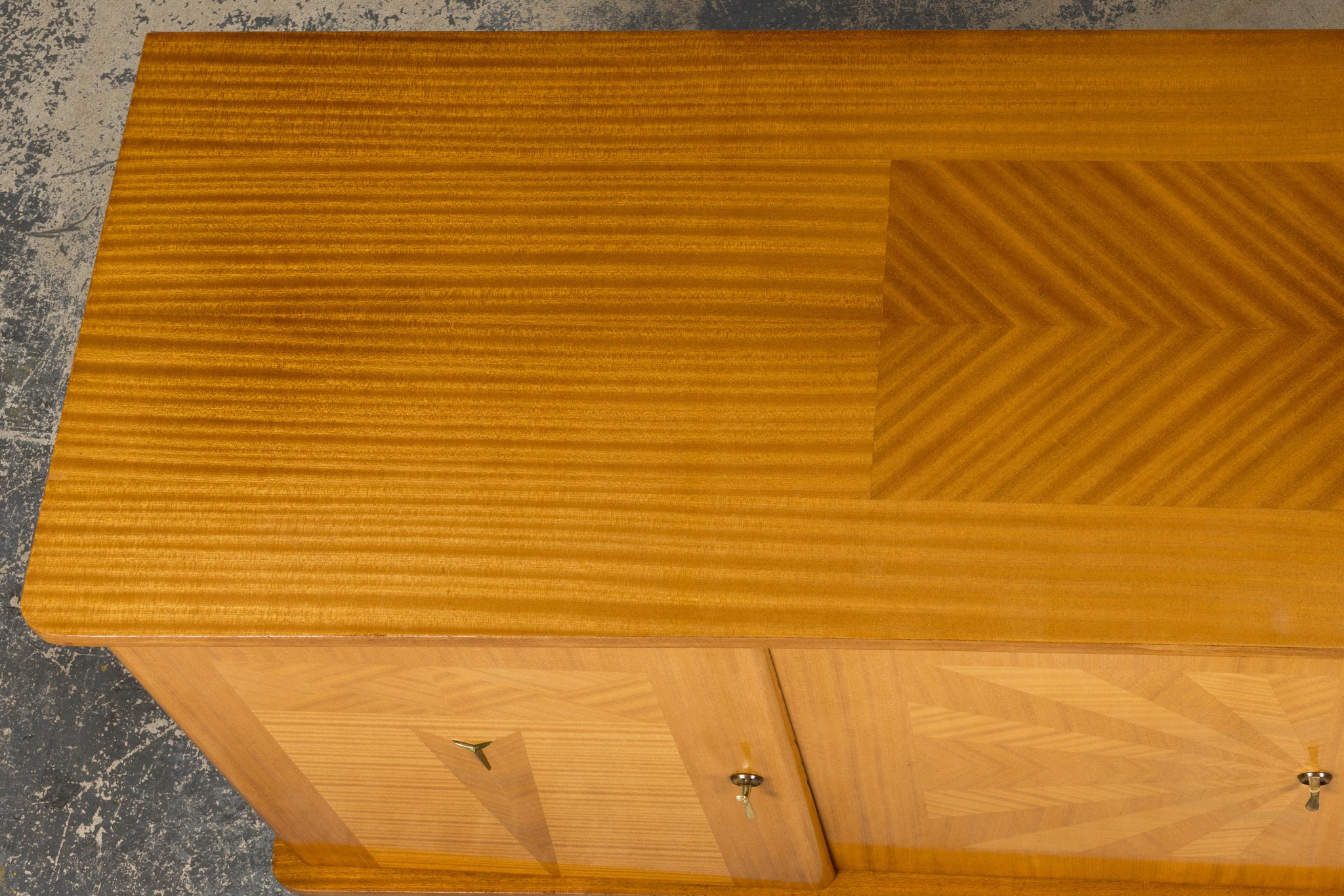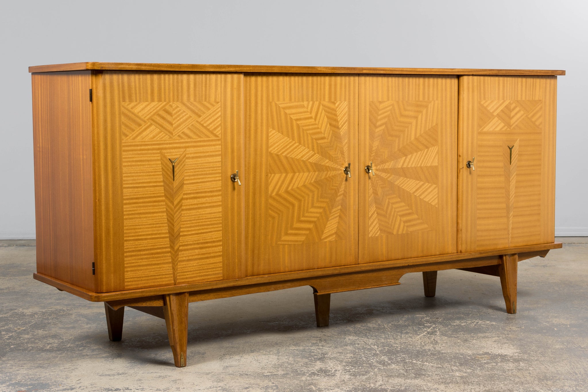 French Art Deco sideboard dating to the 1940s, sourced in Provence. The piece is veneered in blond sycamore maple and features refined chevron and starburst veneer compositions across the doors and top, framed by linear-grain panels. The cabinet is raised on tapered legs with original brass sabots and retains its original brass toggle hardware. The façade is organized with four doors, including a central mirrored pair with starburst veneer. The interior offers generous storage, with shelving throughout and two upper drawers lined in green felt, one in each outer compartment. The interior construction is solid and well executed, with adjustable shelves and clean joinery. The proportions are balanced and architectural, characteristic of late French Art Deco furniture, with an emphasis on veneer craftsmanship and restrained decorative detail.