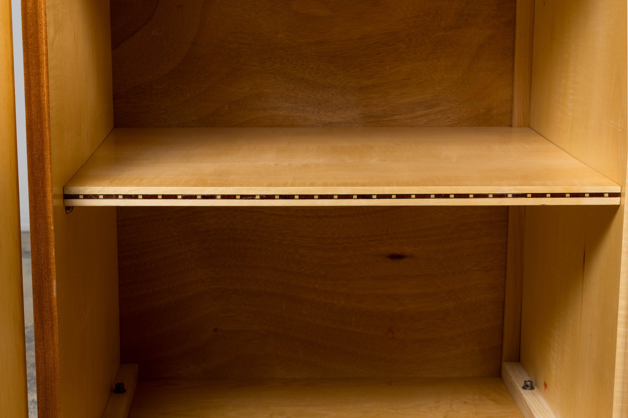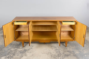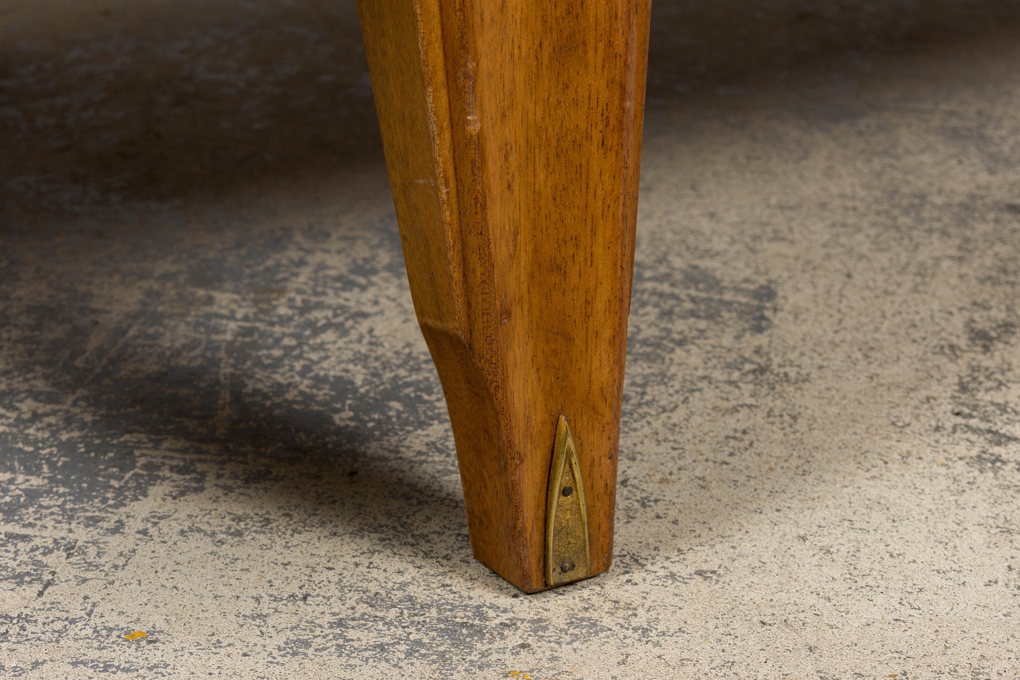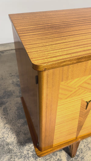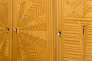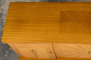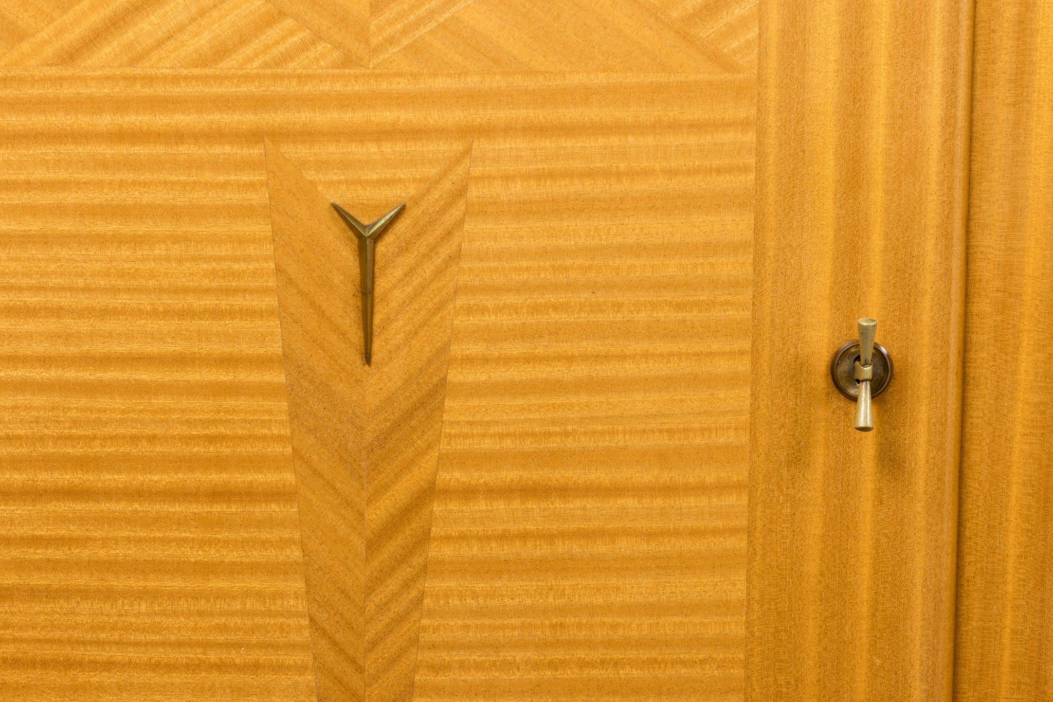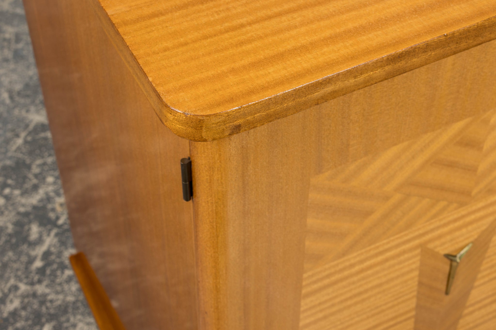 French Art Deco sideboard dating to the 1940s, sourced in Provence. The piece is veneered in blond sycamore maple and features refined chevron and starburst veneer compositions across the doors and top, framed by linear-grain panels. The cabinet is raised on tapered legs with original brass sabots and retains its original brass toggle hardware. The façade is organized with four doors, including a central mirrored pair with starburst veneer. The interior offers generous storage, with shelving throughout and two upper drawers lined in green felt, one in each outer compartment. The interior construction is solid and well executed, with adjustable shelves and clean joinery. The proportions are balanced and architectural, characteristic of late French Art Deco furniture, with an emphasis on veneer craftsmanship and restrained decorative detail.