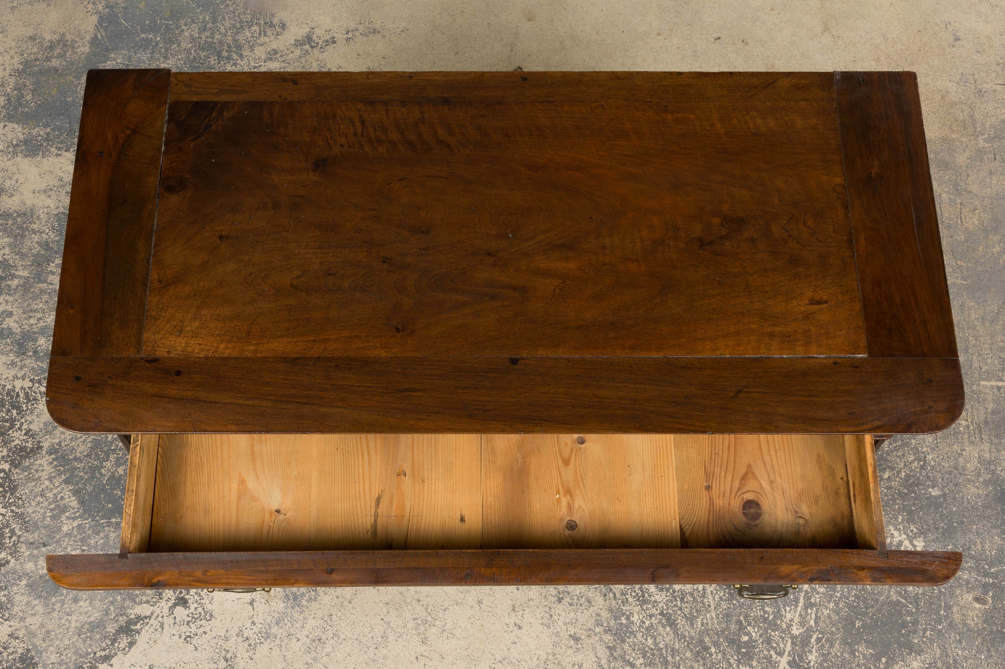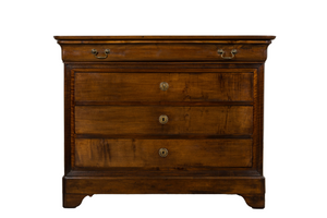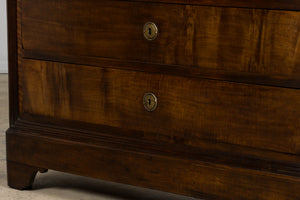 An elegant mid-19th century French Louis Philippe commode, sourced in Provence, France. Hand-crafted from solid walnut, the piece has been structurally revised and fully refinished. The surface shows a rich brown tone with striking grain, subtle sheen, and preserved character marks that speak to its age. The rectangular top with rounded corners and molded edge rests above a discreet frieze drawer fitted with brass pulls, over three full-length drawers framed with simple molding. Each retains its original brass escutcheons and working locks with keys. Raised on short bracket feet, the commode reflects the clean lines and quiet elegance of the Louis Philippe period. Drawer boxes in pine with dovetail joinery further underscore its traditional 19th-century craftsmanship.