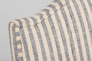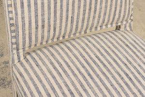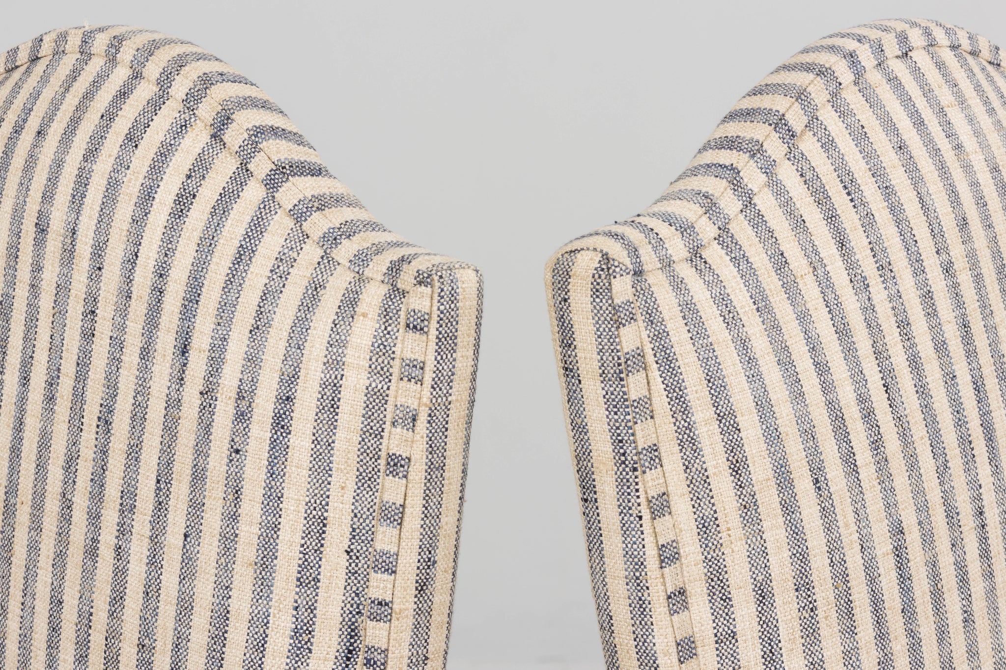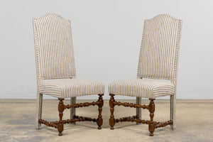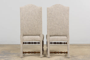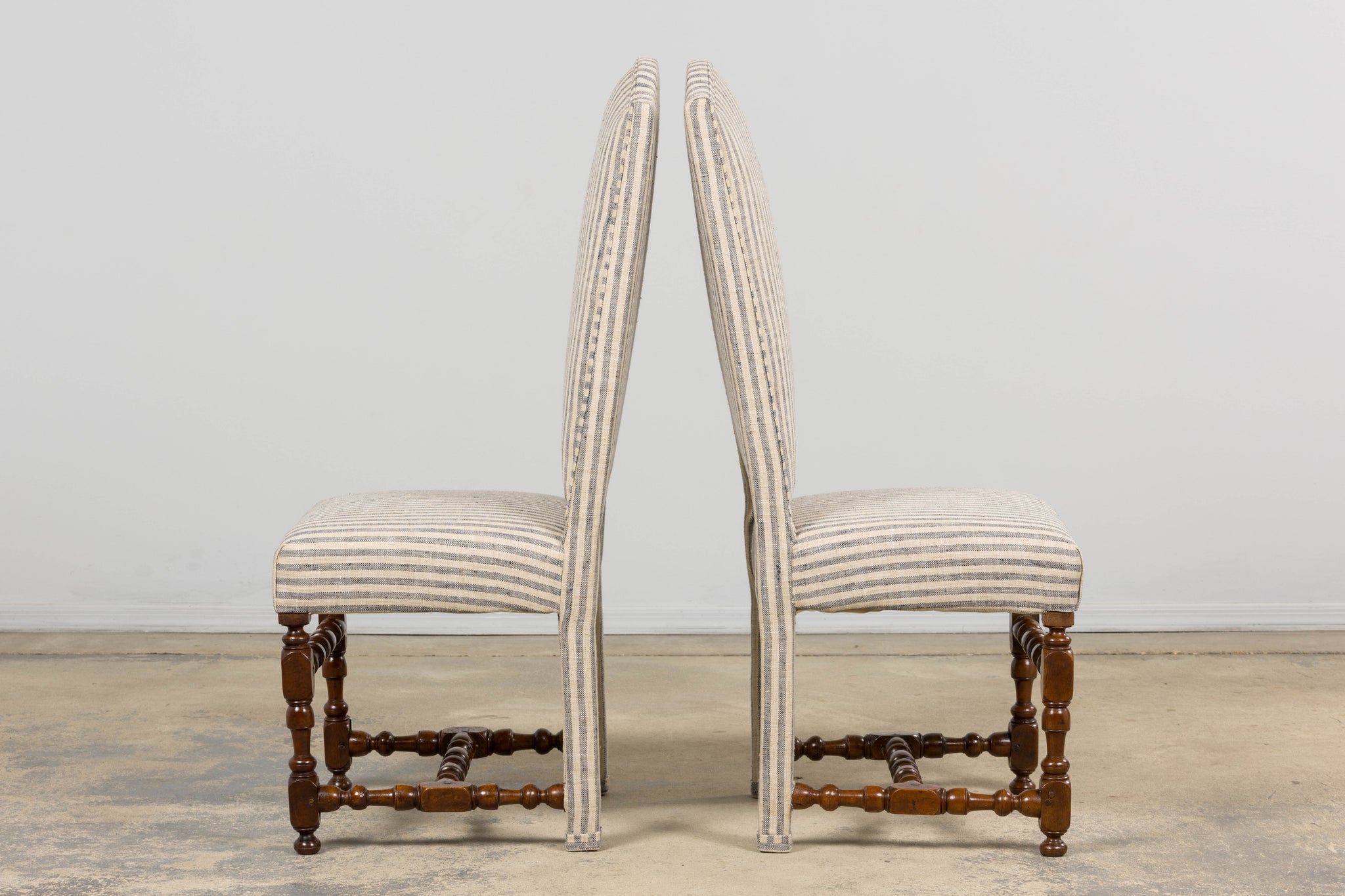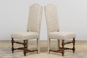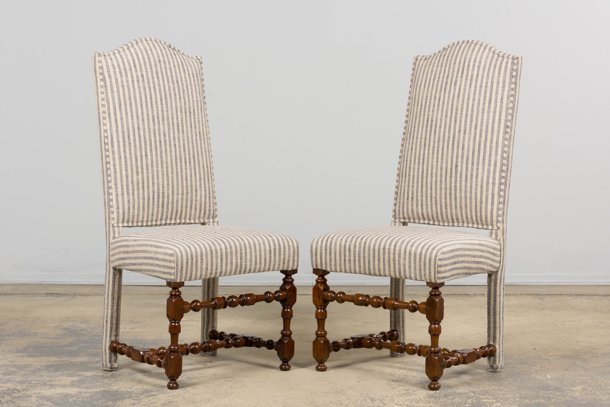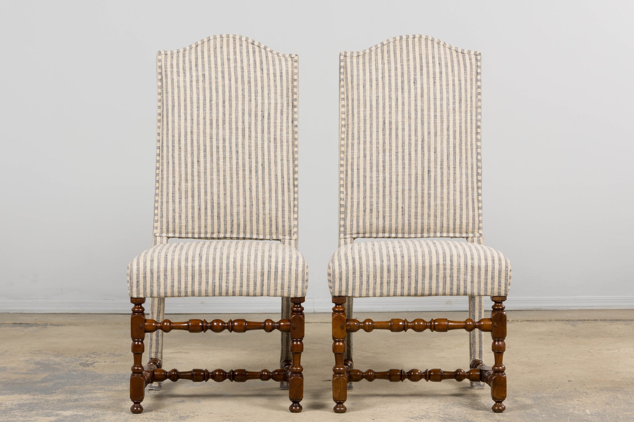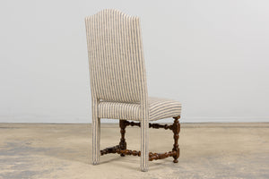 A modern, quietly luxurious interpretation of classic Louis XIII lines, these chairs blend French coastal softness with a refined contemporary sensibility. Sourced in Provence, this stately set of eight high-back dining chairs dates to the late 18th to early 19th century. Crafted from solid walnut with traditional turned legs and cross-stretchers, the frames carry a warm, gently polished patina that has developed over generations. The tall, subtly arched backs lend a strong architectural presence, balanced by generous seats and the robust block-and-baluster bases emblematic of the period. Each frame has been structurally revised for stability while preserving the original character, joinery, and quiet authenticity of the antique wood. The chairs are newly upholstered in a durable, linen-textured performance fabric with natural and washed dark blue vertical stripes. The woven textile has a soft hand and a one-inch repeat that allows the stripes to fall in a clean, tailored rhythm. The upholstery is meticulously executed: each stripe is aligned with precision to elongate the silhouette, while a custom welt-band trim - cut from the fabric’s contrasting stripe - traces the curved crest and sides, giving the backs a crisp architectural outline. The back legs are fully wrapped and finished with a matching welt-band cuff at the base, taken from the darker stripe to anchor the form and highlight the level of craftsmanship. Every hem and corner is shaped with hand-finished accuracy, allowing the fabric to drape smoothly over the sculptural walnut bases. The seats are comfortably contoured and balanced, offering a contemporary softness that complements the quiet richness of the antique wood. Comfortable and beautifully refined, the set pairs its period authenticity with a tailored modern ease - suited as naturally to classic European settings as to softer, coastal-inspired interiors.