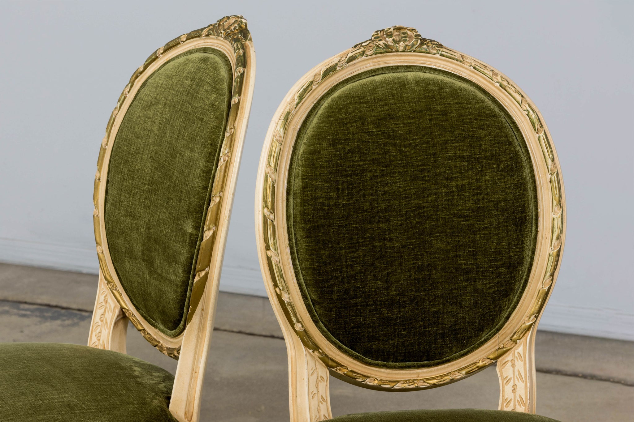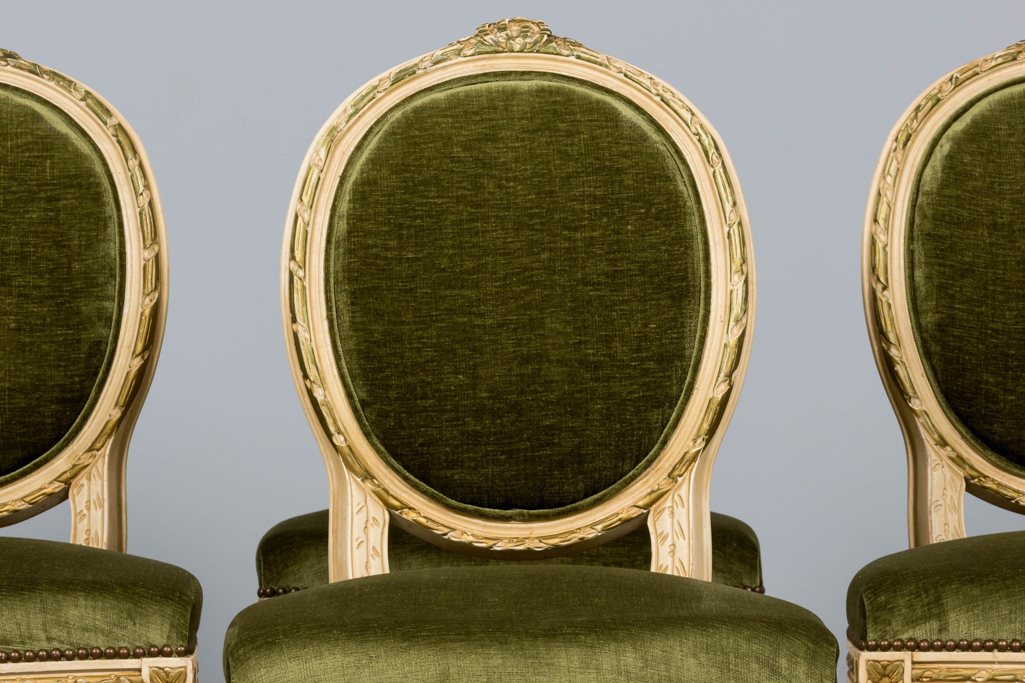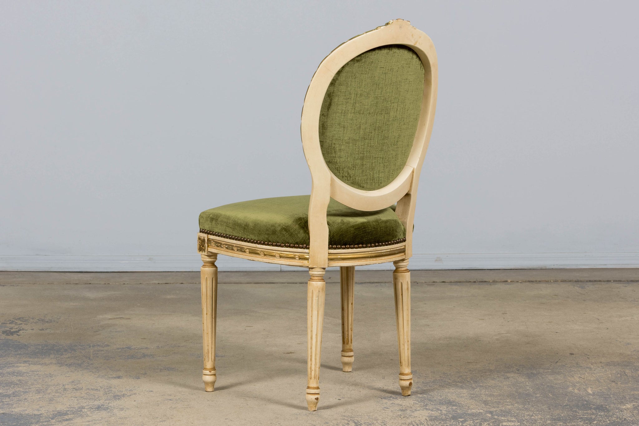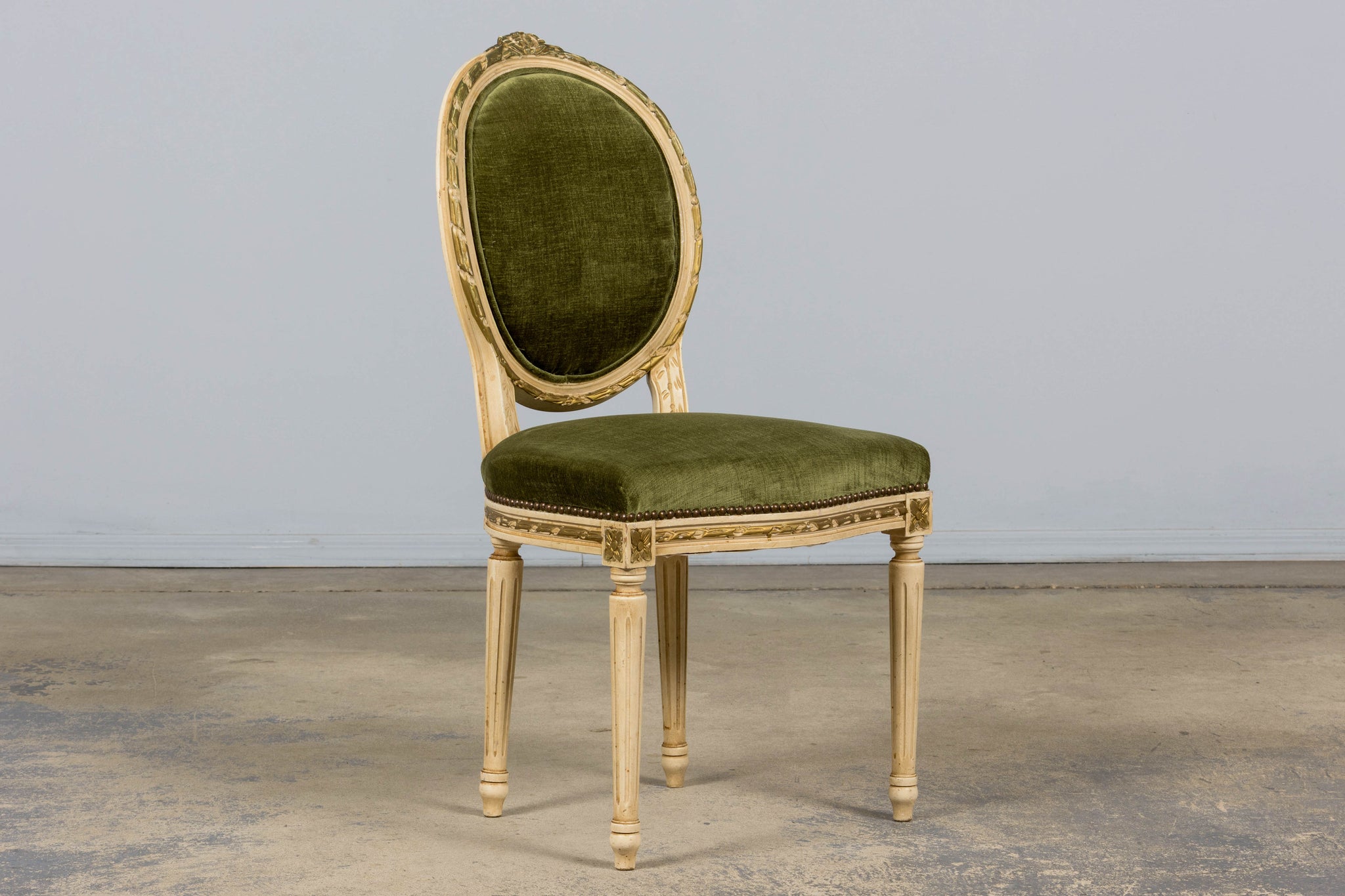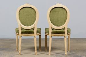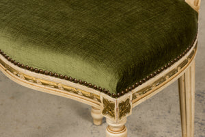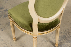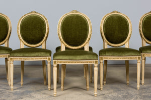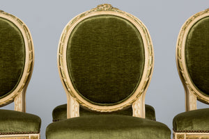 An exquisite set of eight early 20th-century French Louis XVI style dining chairs, sourced in Provence, France. The frames retain their original creamy white painted finish with subtle gilt accents and visible traces of the earlier green paint layer within the carving, creating a naturally layered patina that reflects their age and provenance. Classic Louis XVI details include shaped oval backs with ribbon and laurel carving, fluted legs, rosette corner blocks, and elegant toupie feet. The proportions are generous and well-balanced, consistent with early 20th-century French workmanship. The chairs have been newly upholstered in a rich olive green performance velvet, chosen for durability and a soft hand. The upholstery is finished with matching single piping trim outlining the backs and a line of nailhead trim along the seat rails, keeping the presentation clean and traditional while echoing the original French detailing.The entire set has been structurally revised in our workshop, ensuring stability and everyday functionality while preserving the authentic surface character of the painted frames and carved details.