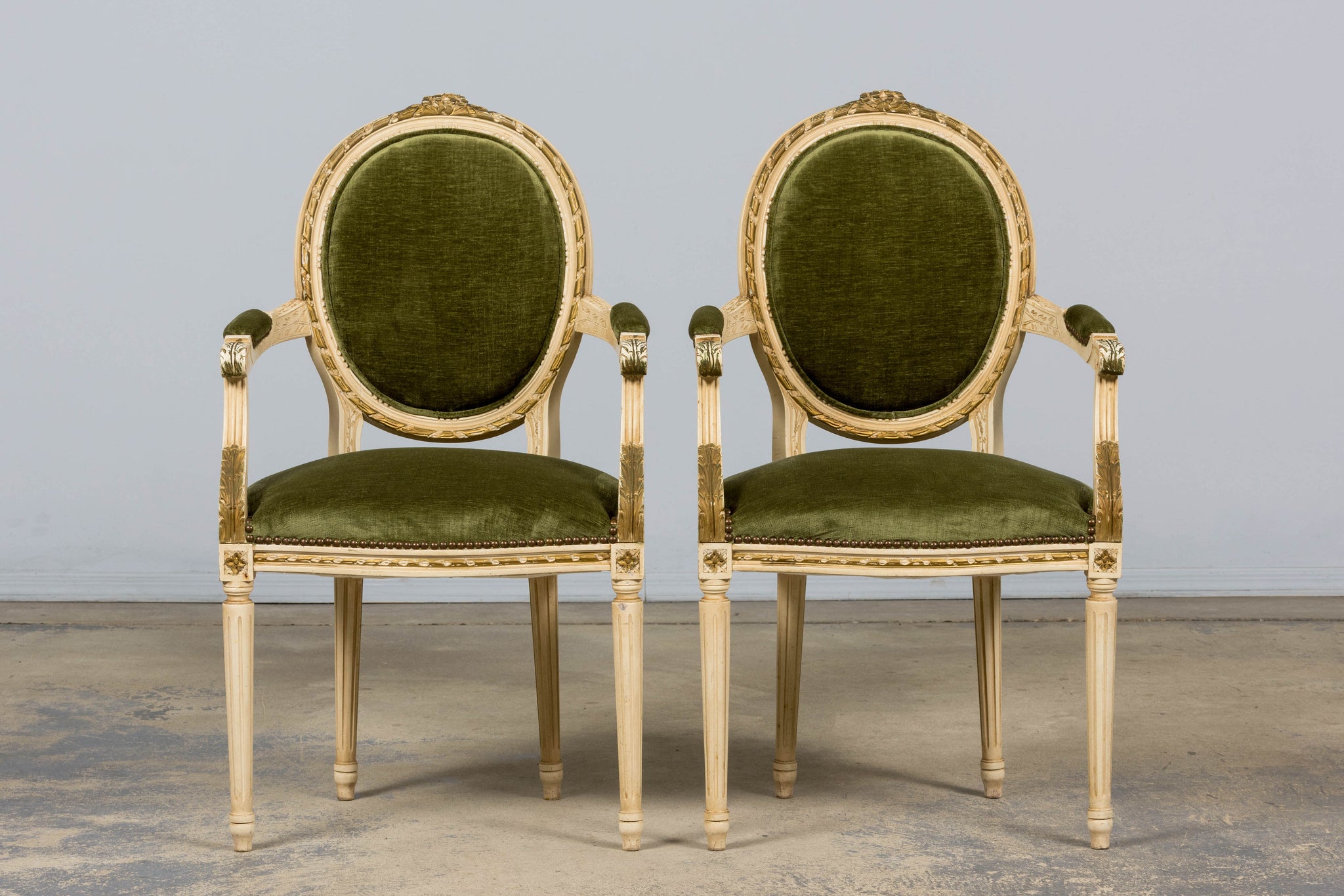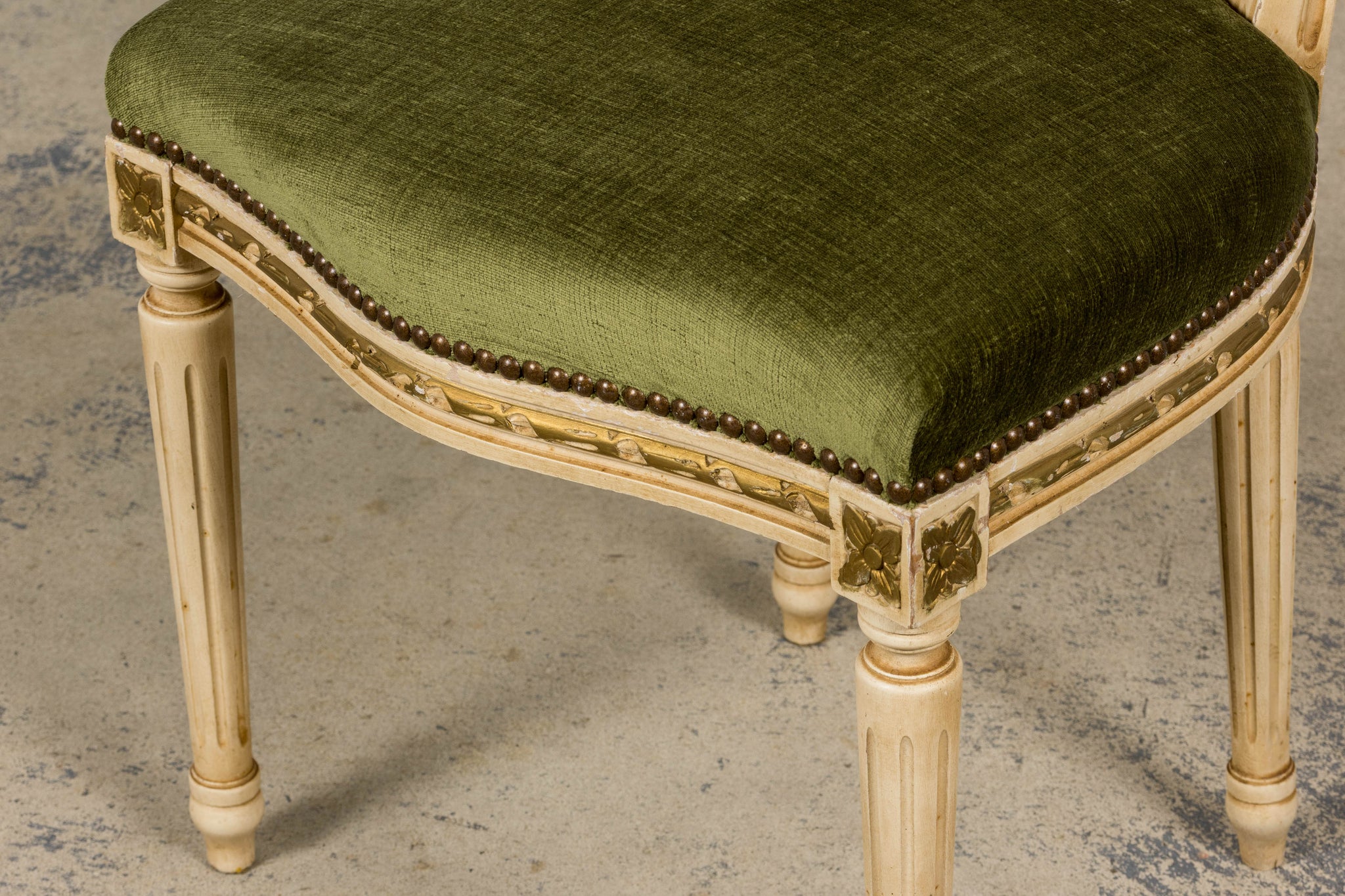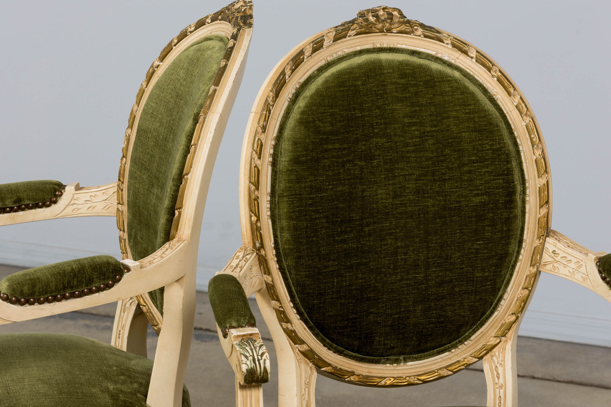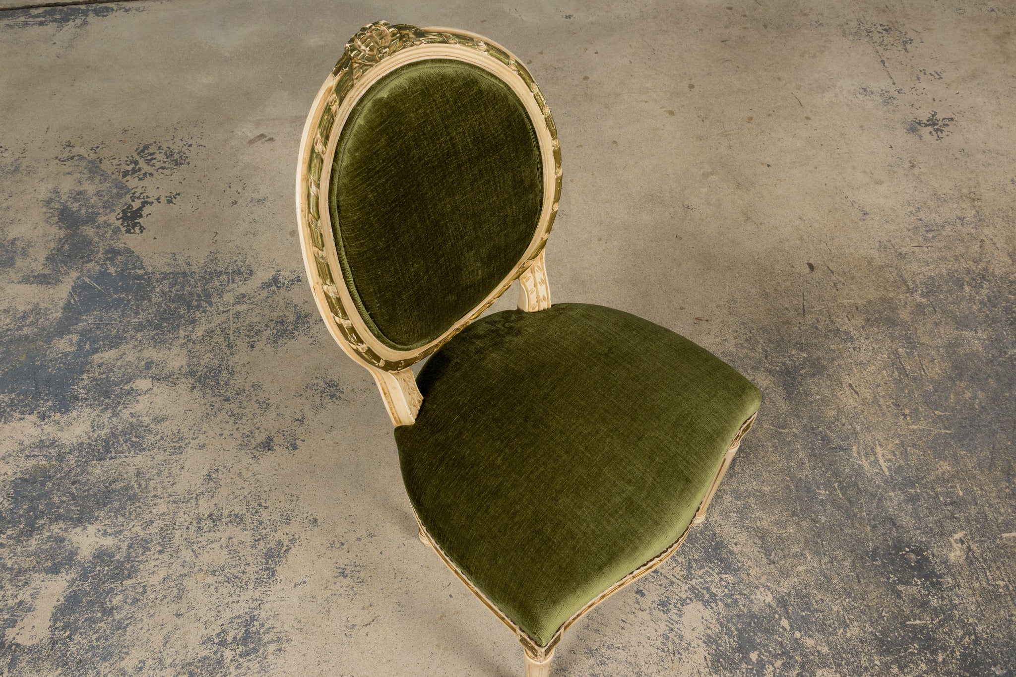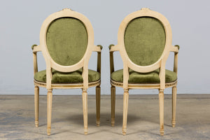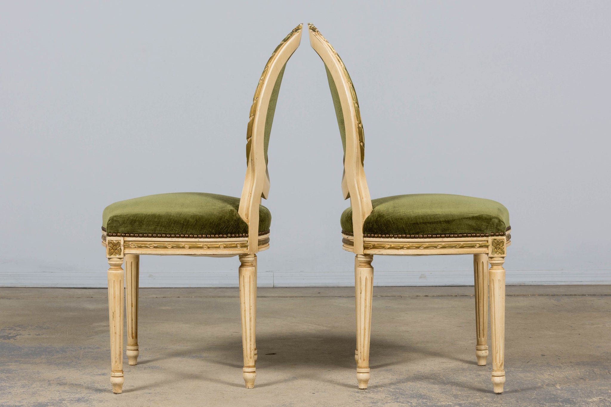 An exquisite set of eight early 20th-century French Louis XVI style dining chairs, sourced in Provence, France. The frames retain their original creamy white painted finish with subtle gilt accents and visible traces of the earlier green paint layer within the carving, creating a naturally layered patina that reflects their age and provenance. Classic Louis XVI details include shaped oval backs with ribbon and laurel carving, fluted legs, rosette corner blocks, and elegant toupie feet. The proportions are generous and well-balanced, consistent with early 20th-century French workmanship. The chairs have been newly upholstered in a rich olive green performance velvet, chosen for durability and a soft hand. The upholstery is finished with matching single piping trim outlining the backs and a line of nailhead trim along the seat rails, keeping the presentation clean and traditional while echoing the original French detailing.The entire set has been structurally revised in our workshop, ensuring stability and everyday functionality while preserving the authentic surface character of the painted frames and carved details.