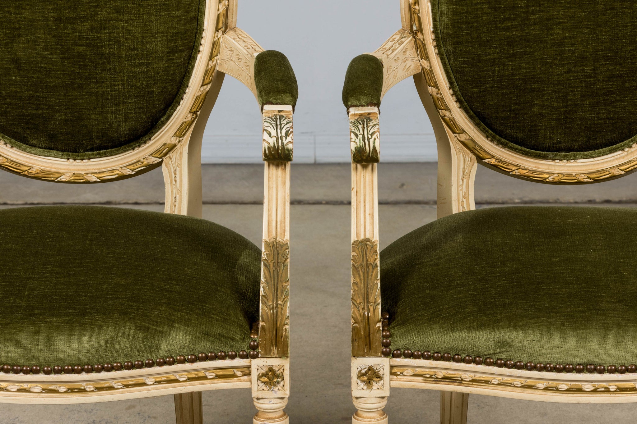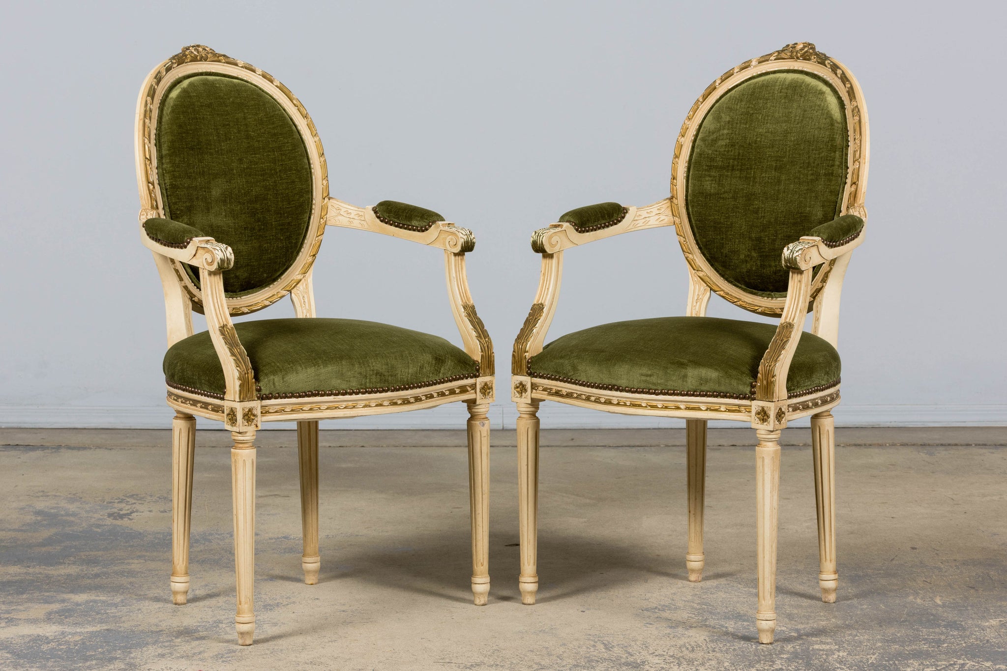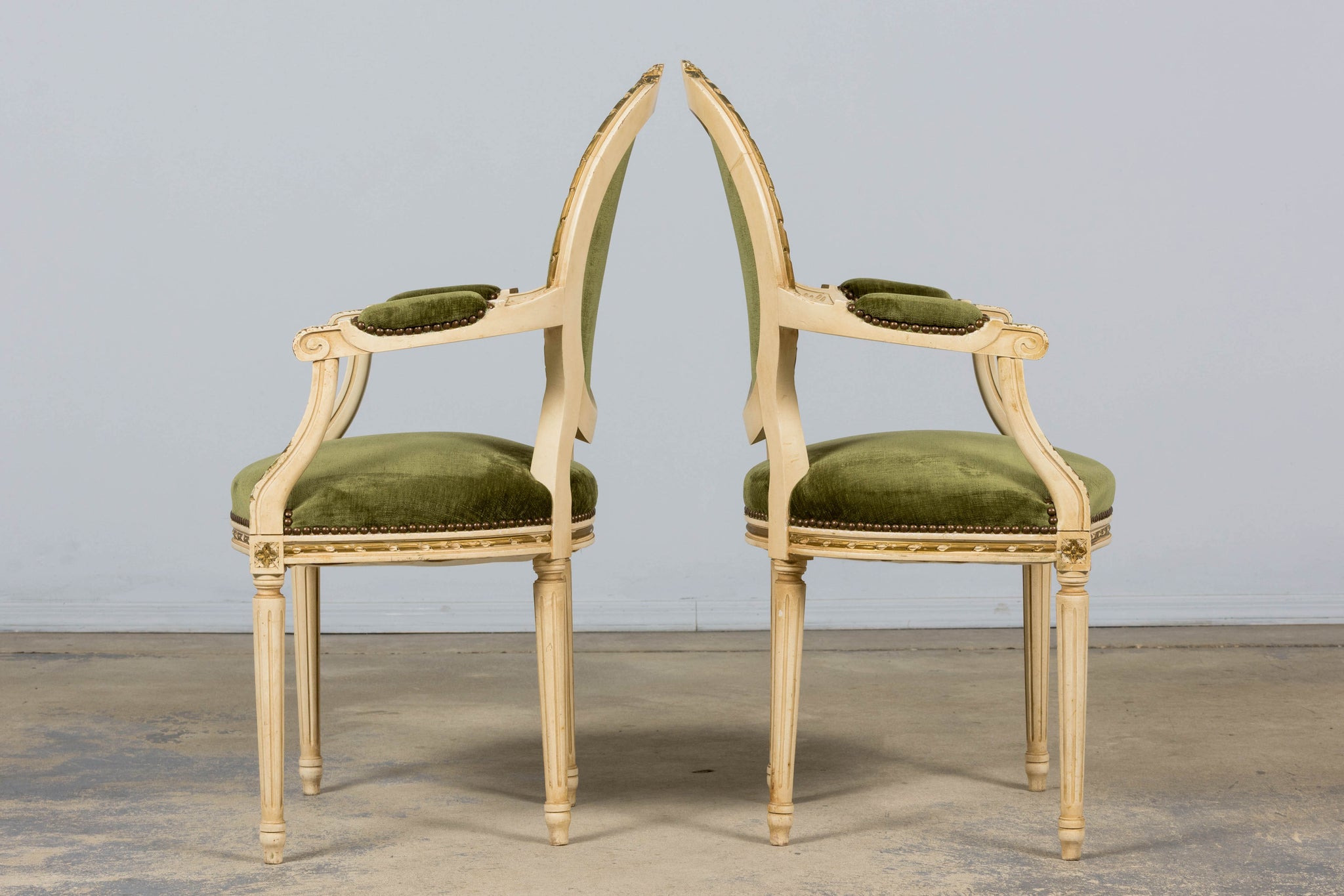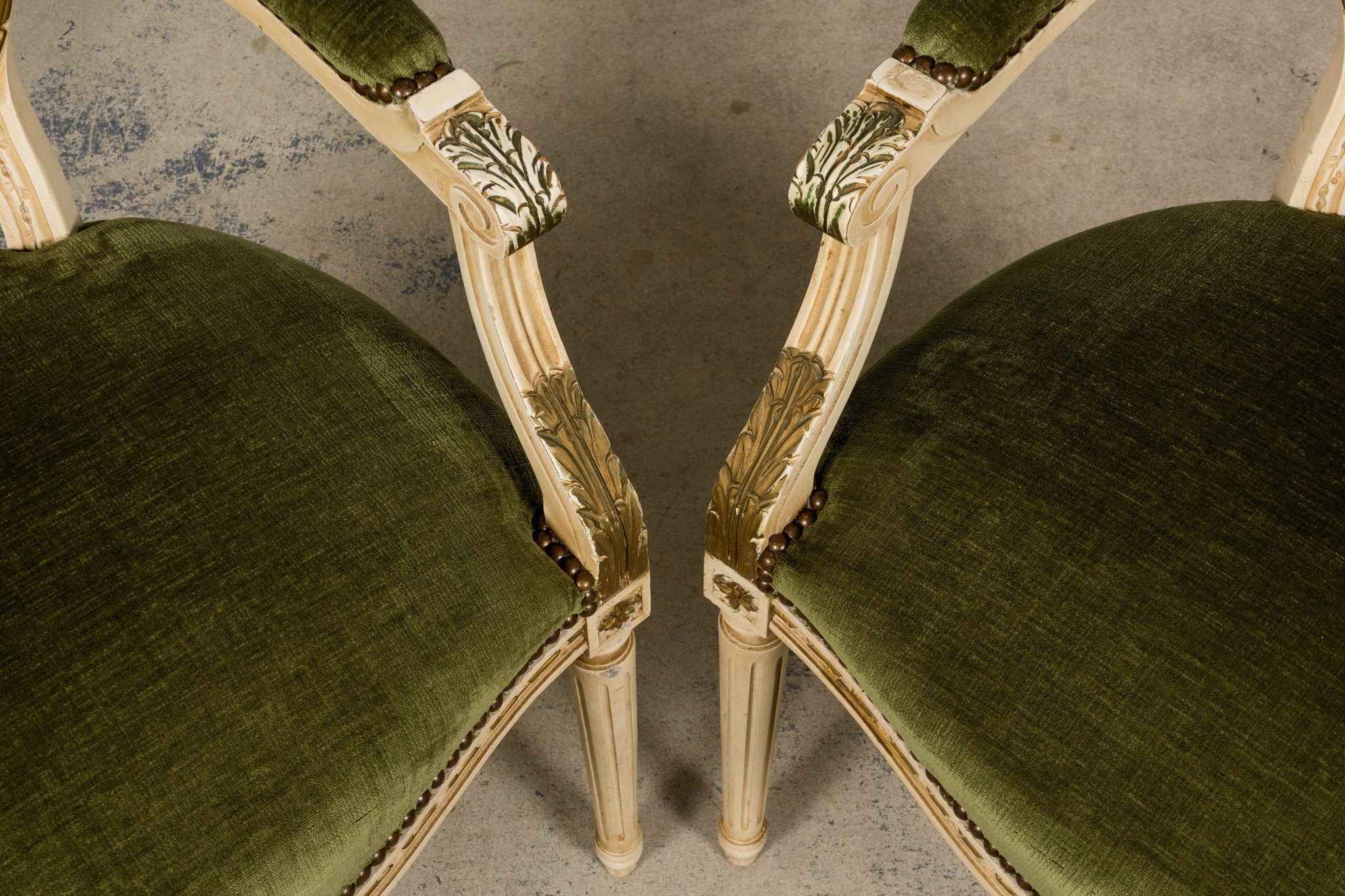 An exquisite set of eight early 20th-century French Louis XVI style dining chairs, sourced in Provence, France. The frames retain their original creamy white painted finish with subtle gilt accents and visible traces of the earlier green paint layer within the carving, creating a naturally layered patina that reflects their age and provenance. Classic Louis XVI details include shaped oval backs with ribbon and laurel carving, fluted legs, rosette corner blocks, and elegant toupie feet. The proportions are generous and well-balanced, consistent with early 20th-century French workmanship. The chairs have been newly upholstered in a rich olive green performance velvet, chosen for durability and a soft hand. The upholstery is finished with matching single piping trim outlining the backs and a line of nailhead trim along the seat rails, keeping the presentation clean and traditional while echoing the original French detailing.The entire set has been structurally revised in our workshop, ensuring stability and everyday functionality while preserving the authentic surface character of the painted frames and carved details.
