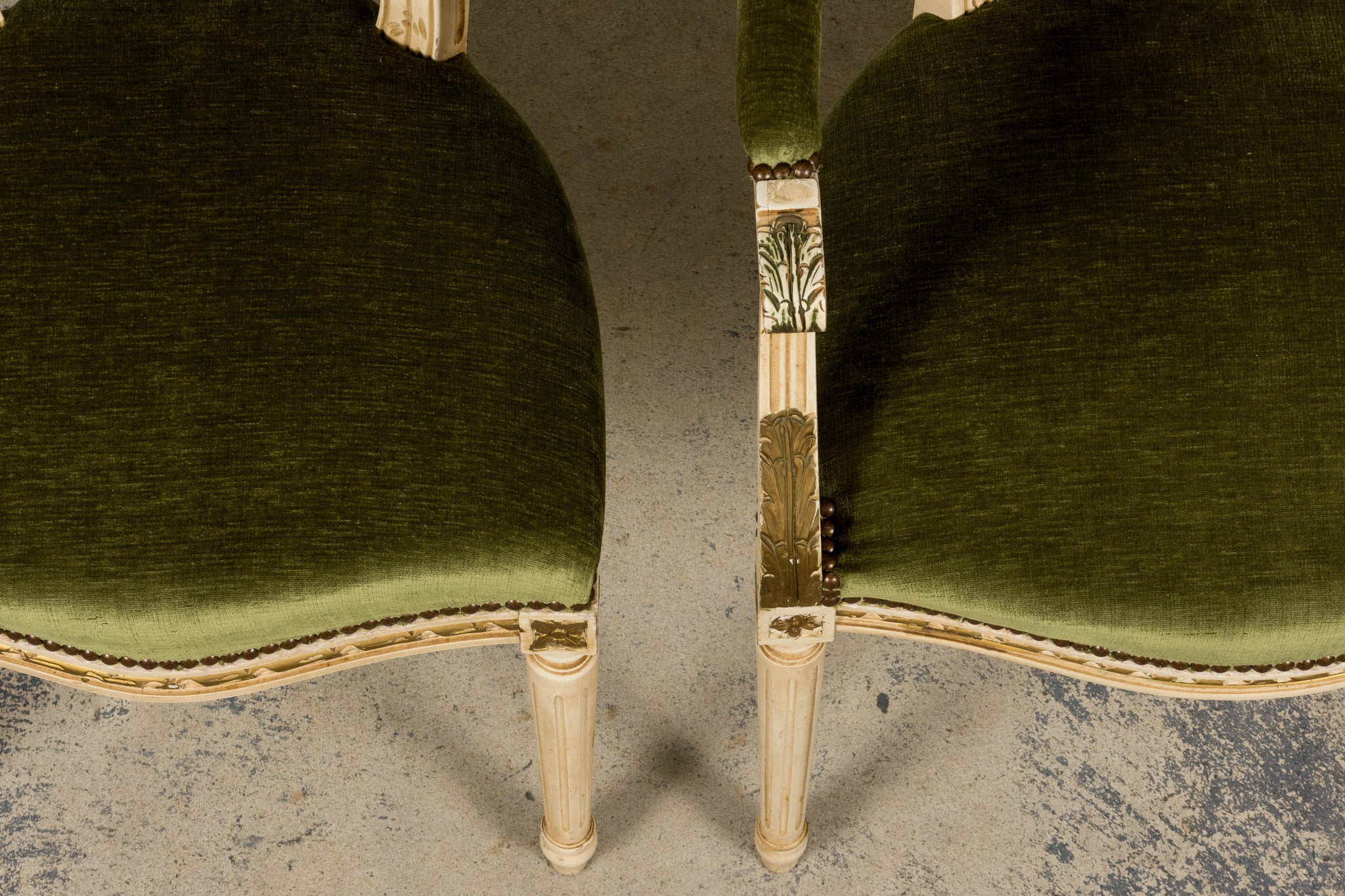 - Condition: Structurally sound. Original painted finish with naturally aged patina, gilt traces, and remnants of green paint. Newly upholstered in performance velvet.