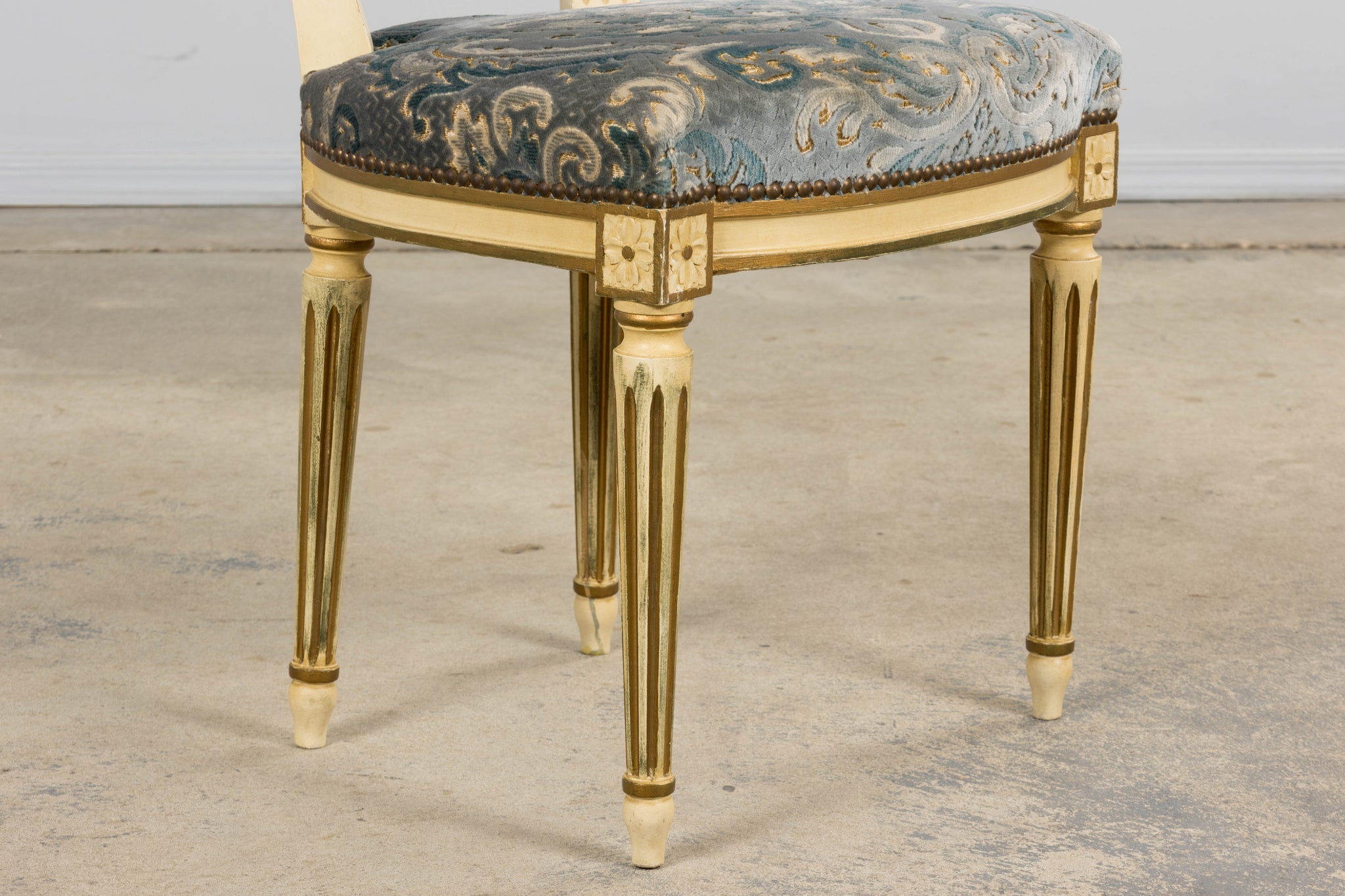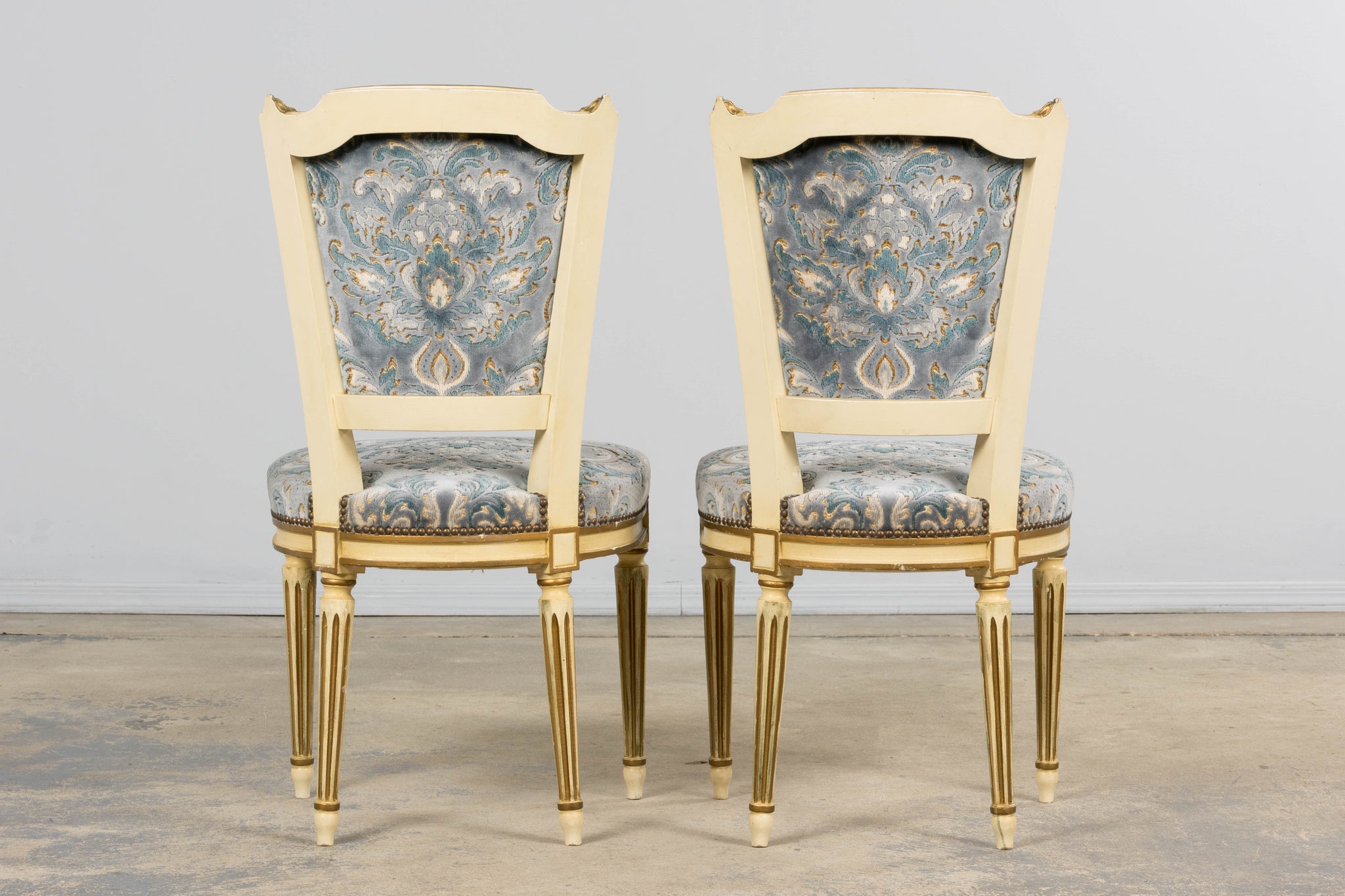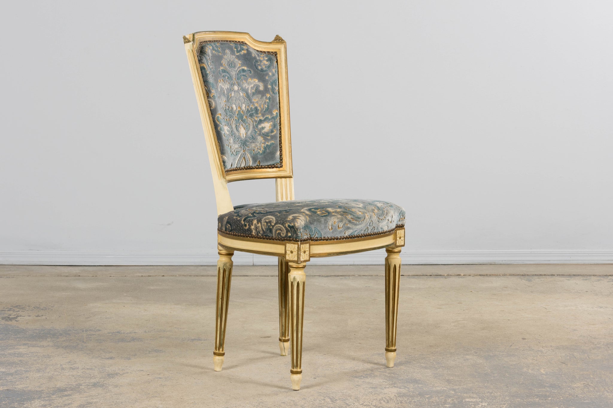 A refined pair of early 20th-century French Louis XVI-style side chairs, sourced in Provence, France. The chairs feature shaped rectangular backs with gently curved crest rails, carved detailing throughout, and classic tapered, fluted legs terminating in toupie feet. The frames retain their original painted finish in a soft antique white with gilt accents and areas of wear consistent with age and use. This pair retains its original upholstered seats and backs, finished in a blue velvet damask with subtle gold accents. The fabric shows light, even wear consistent with age and use, adding depth and character to the overall presentation. Finished with original-style brass nailhead trim. The chairs have been structurally revised in our workshop to ensure stability and proper function. Frames have been reinforced, and joints stabilized, making them solid and suitable for everyday use while preserving their original materials and surface character. A classic Louis XVI silhouette with elegant proportions, well-suited for dining, bedroom, or accent use.