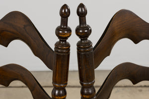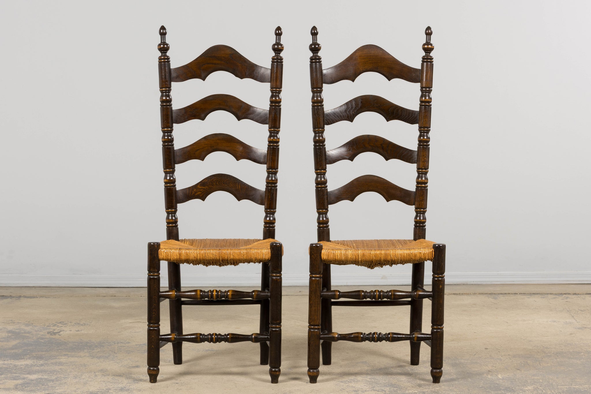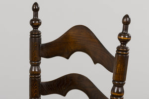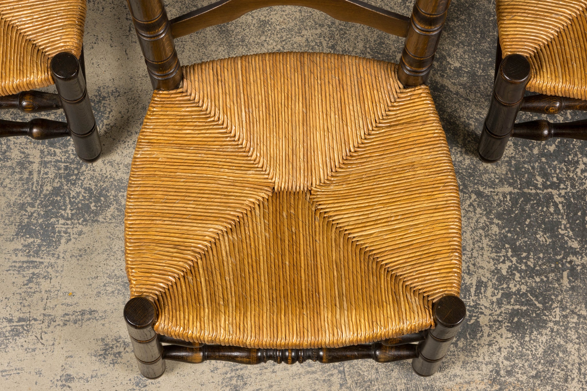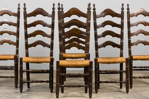 A characterful set of ten early 20th century Spanish Country dining chairs sourced in Provence. Crafted from solid oak, each chair features a tall, architectural back with deeply scalloped ladder slats and turned stiles capped with finials—an iconic detail of Spanish and Basque Provincial design. The chairs have been structurally revised by our workshop to ensure stability and daily usability. The oak frames were gently waxed to refresh the natural warmth and patina of the wood, while the handwoven natural rush seats were cleaned and shellacked for protection and longevity. The tall backs create an elegant vertical line, and the rush seats offer an inviting textural contrast. Beautifully suited for Mediterranean-inspired spaces, farmhouse dining, or any interior seeking an authentic old-world presence. A cohesive and increasingly hard-to-find set of ten.