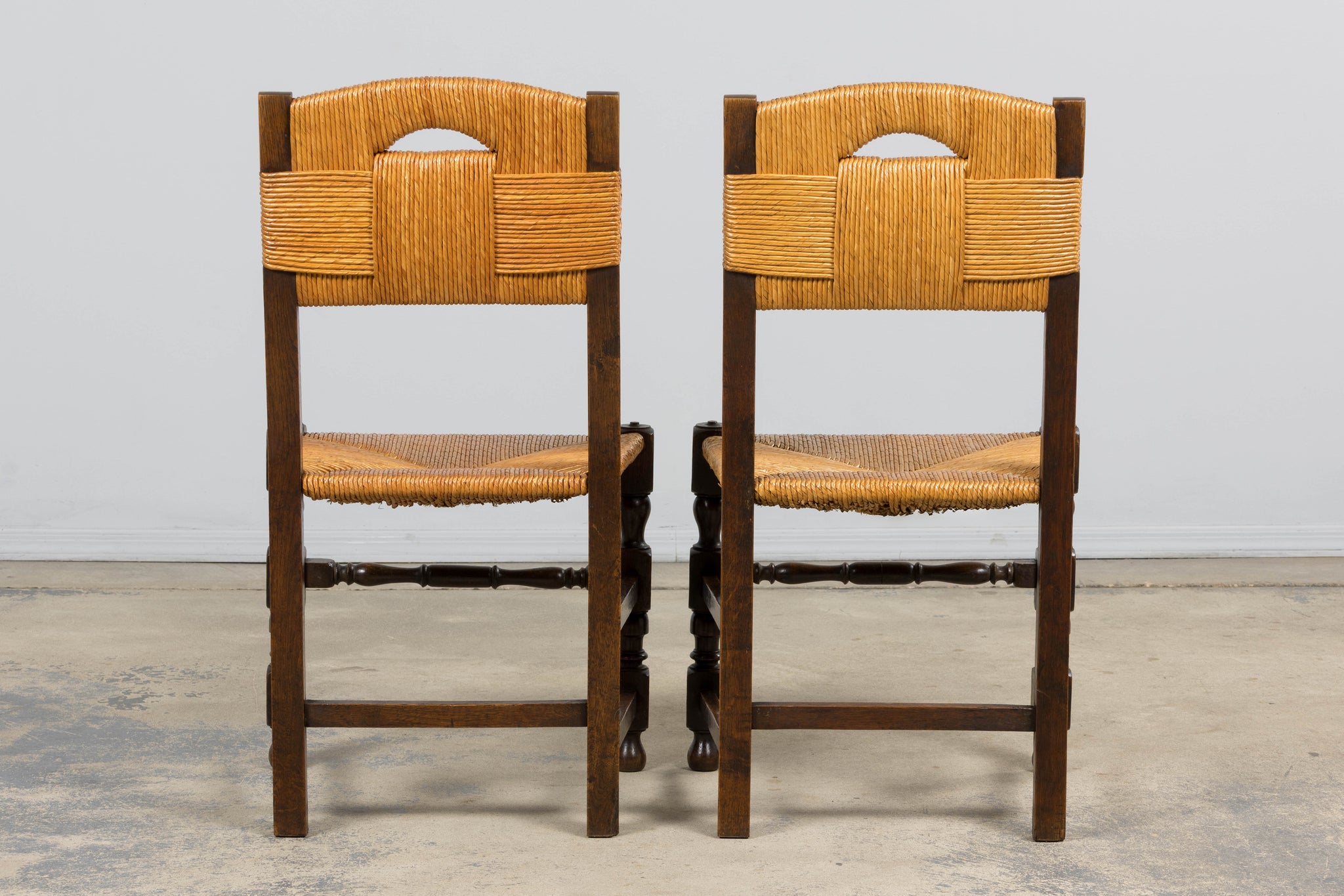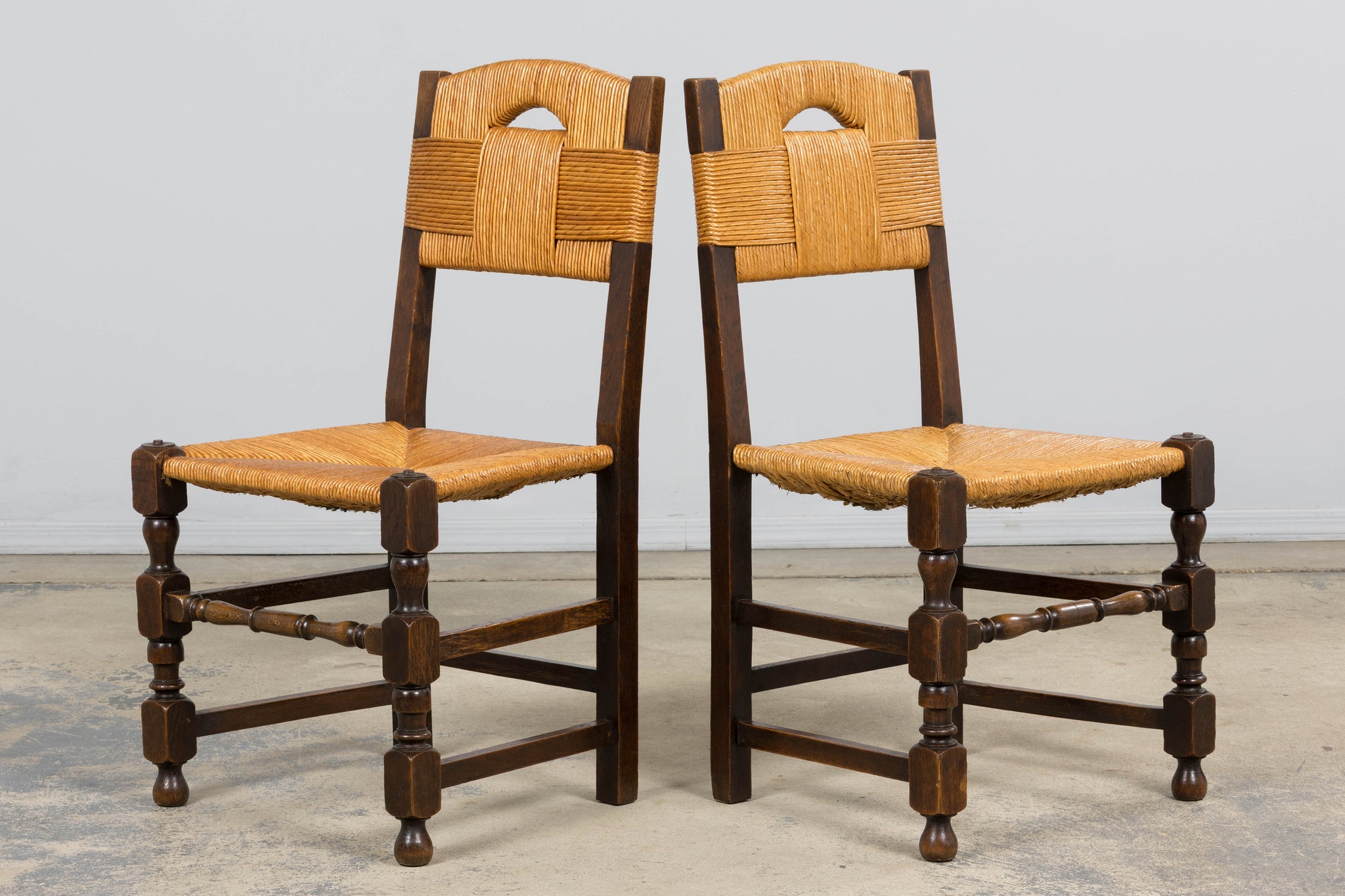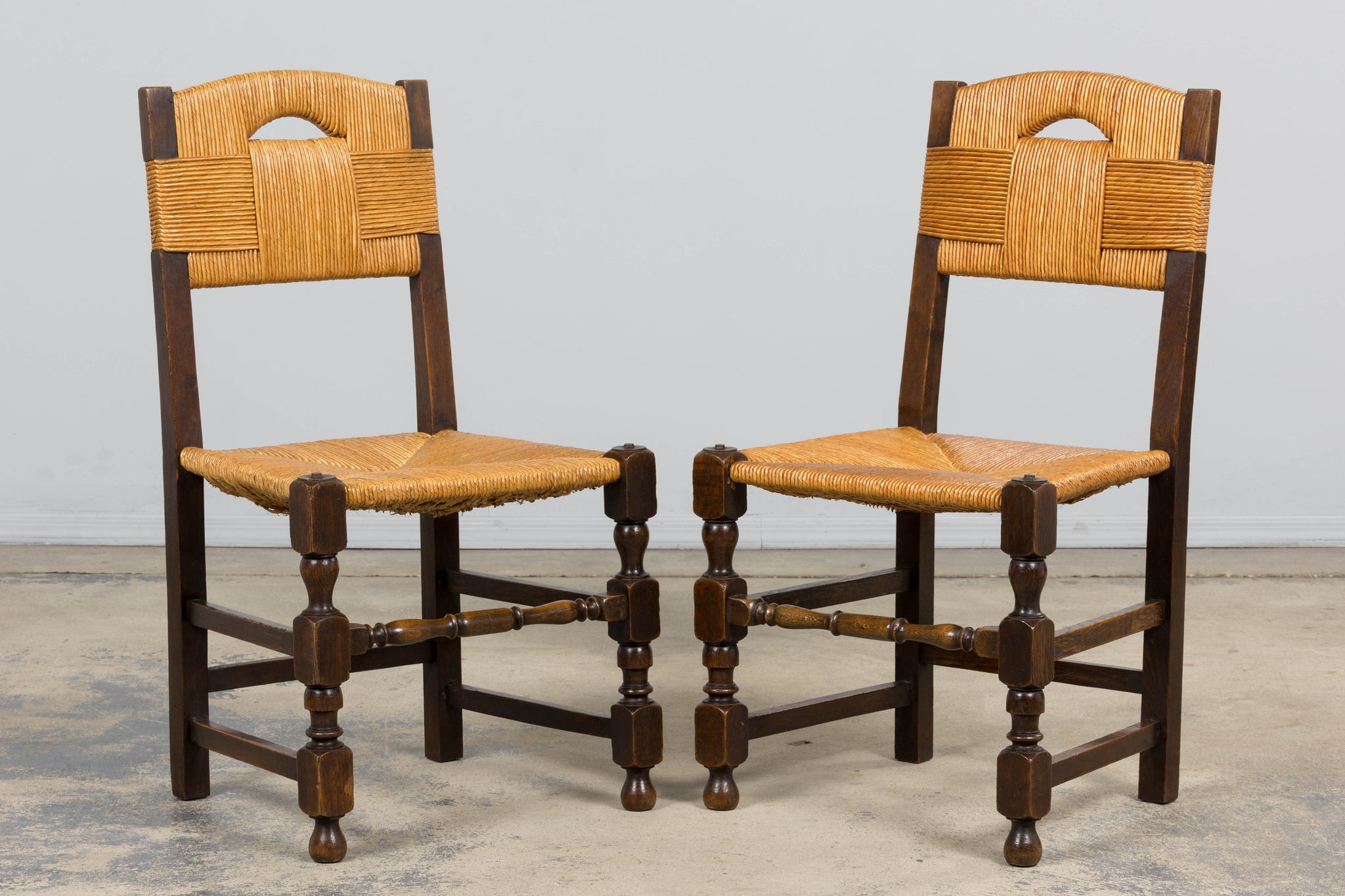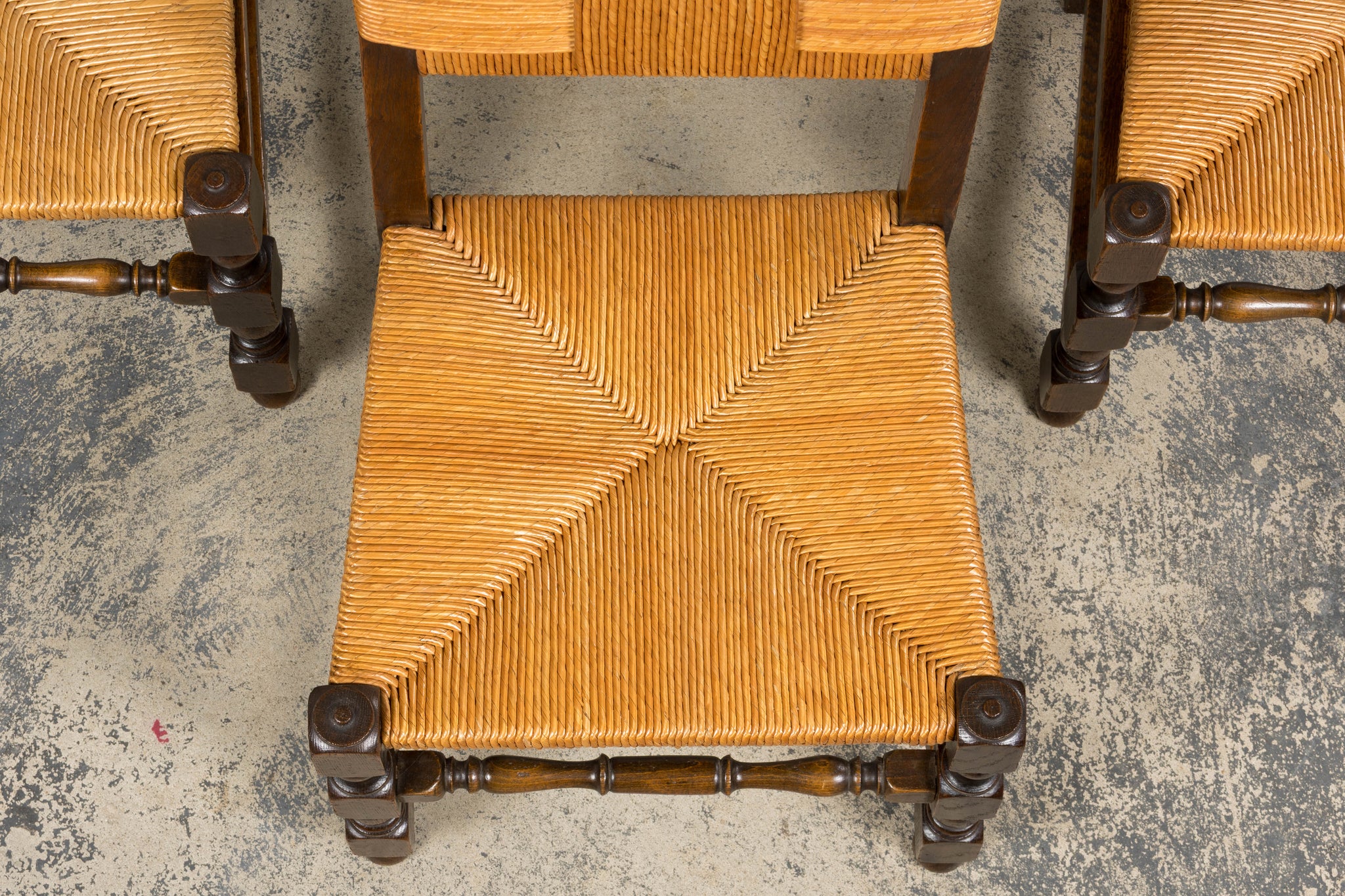Antique set of six French Provincial oak dining chairs sourced in Provence, France, dating to 19th century. The chairs feature classic ladder-back forms with integrated hand-woven rush back panels and arched crest rails, supported by robust square legs with block-and-baluster turning and turned stretchers. The seats retain their traditional four-way star rush weave, executed with tight, even tension and strong craftsmanship. Each chair has been structurally revised in our design studio, with joints tightened and frames stabilized to ensure proper pitch, comfort, and long-term usability. The oak frames have been gently cleaned, polished, and waxed to preserve the original surface while enhancing the natural warmth and depth of the wood. The rush seats and backs have been carefully cleaned and shellacked to reinforce the fibers and extend longevity, while maintaining their authentic patina. A cohesive and well-matched set, these chairs exemplify honest French Provincial craftsmanship, offering both historical integrity and practical functionality suitable for everyday dining use.