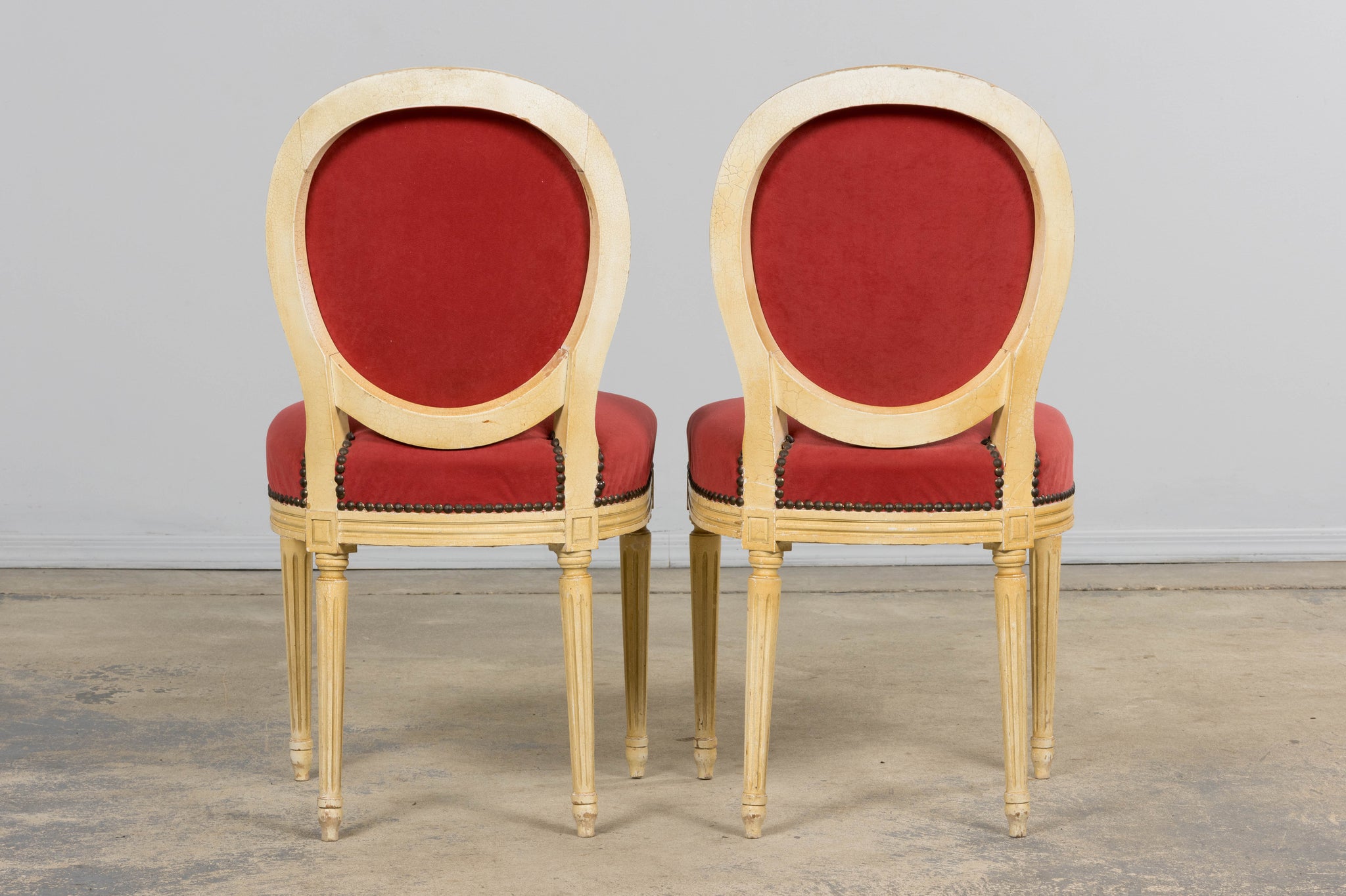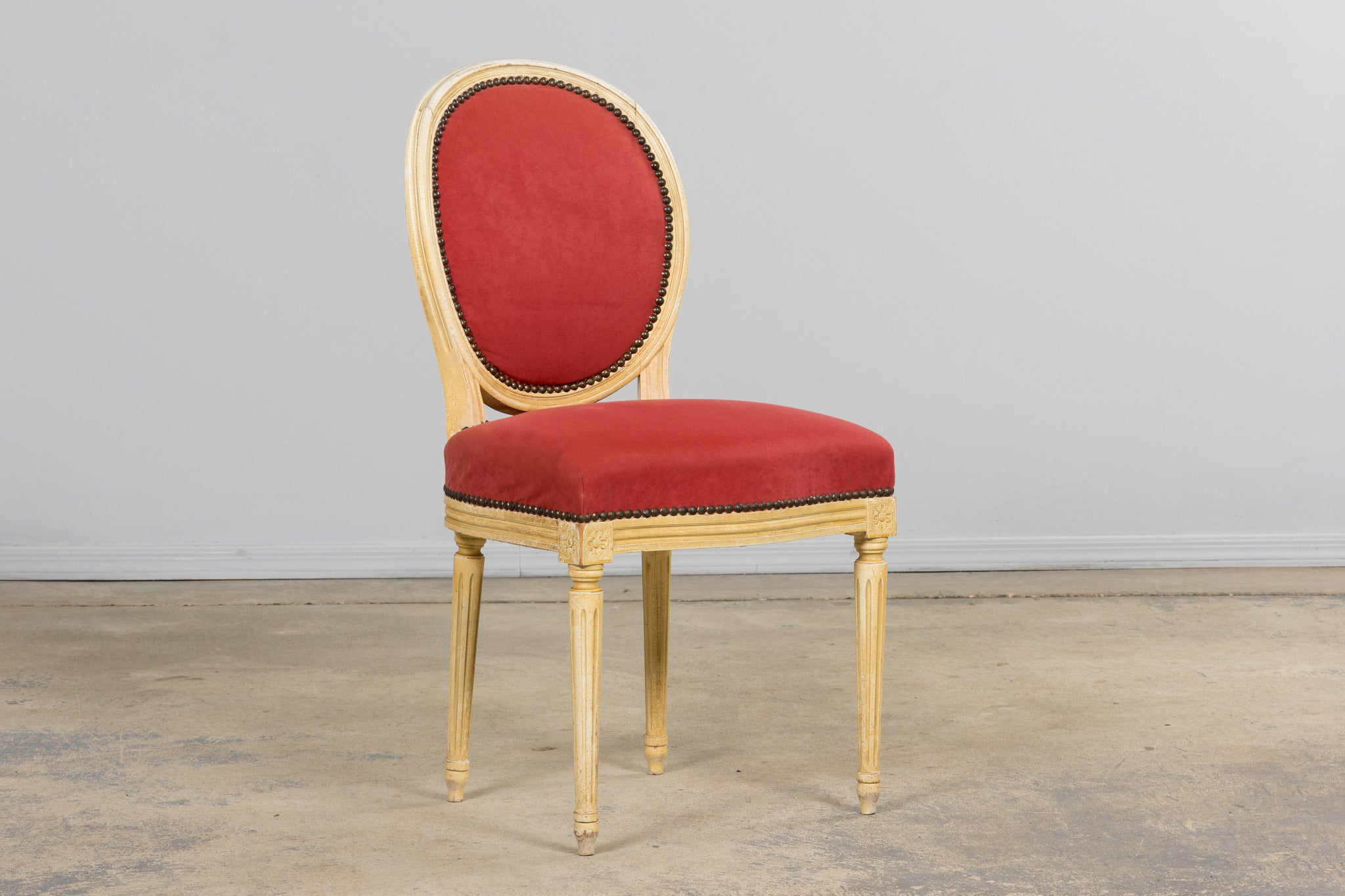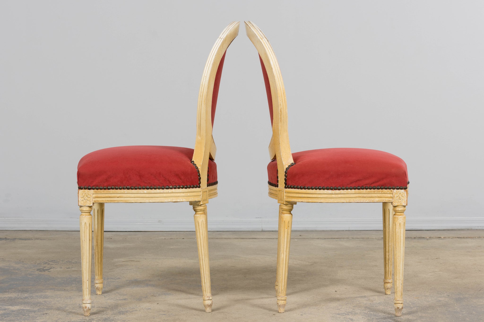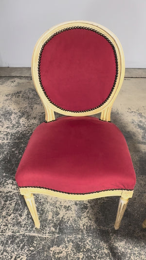 A lovely set of eight early 20th century French Louis XVI style dining chairs, sourced in Provence. Each chair is hand-crafted in solid hardwood and retains its original creamy antique white painted finish, with a naturally aged crackled patina and areas of soft distressing. The shaped oval backs and generous seats are upholstered in the original raspberry velvet, defined by nailhead trim that highlights the silhouette. Raised on turned and fluted legs with carved rosettes, the frames convey both elegance and solidity. We have structurally revised the set, ensuring stability and readiness for daily use while preserving the authentic character of the painted surfaces and velvet. The upholstery shows natural wear consistent with age, adding to the layered history and timeless appeal of the chairs.