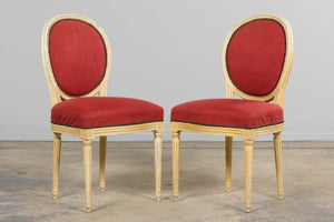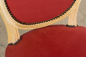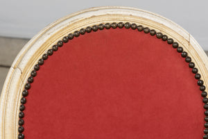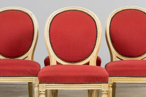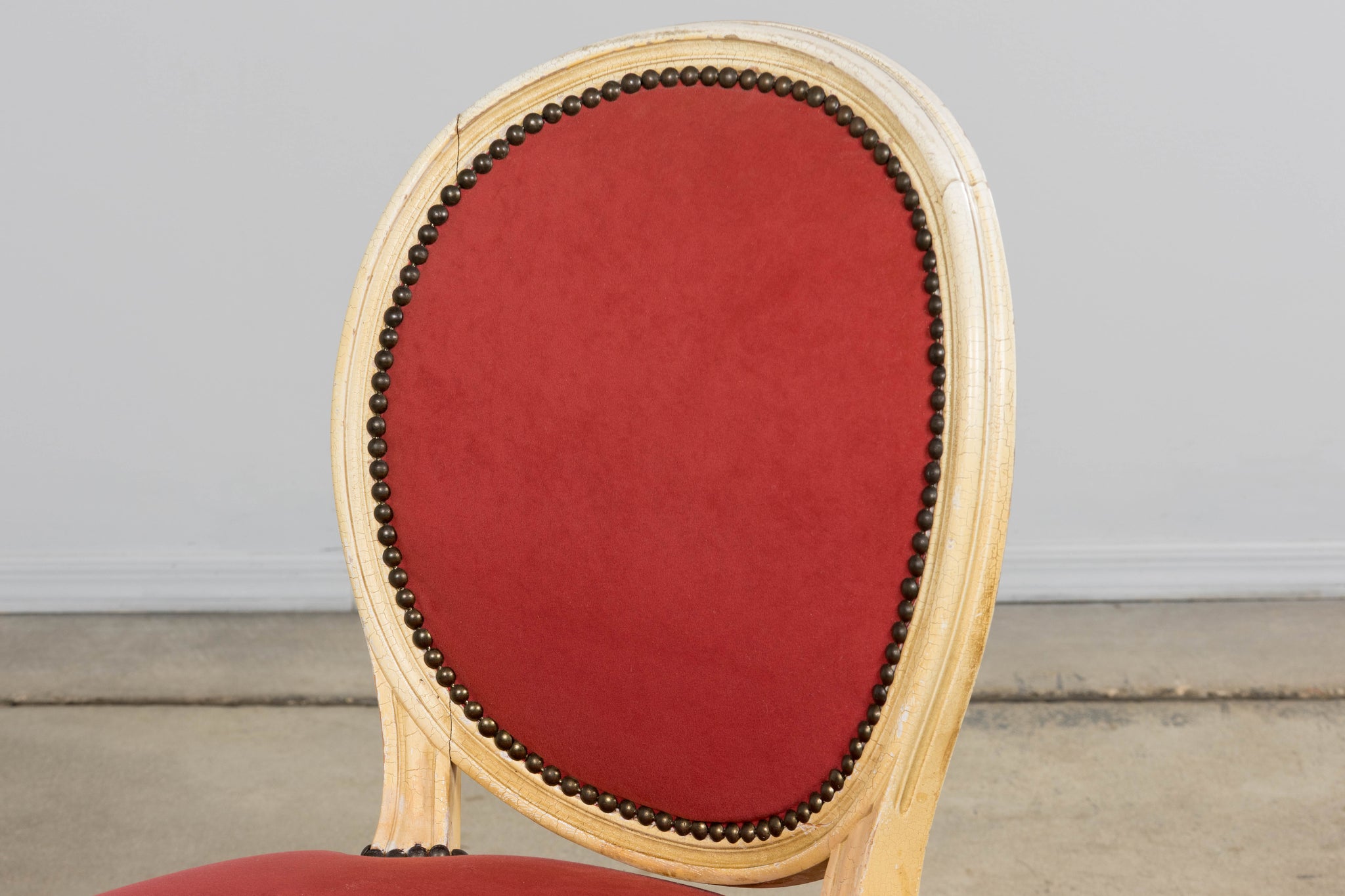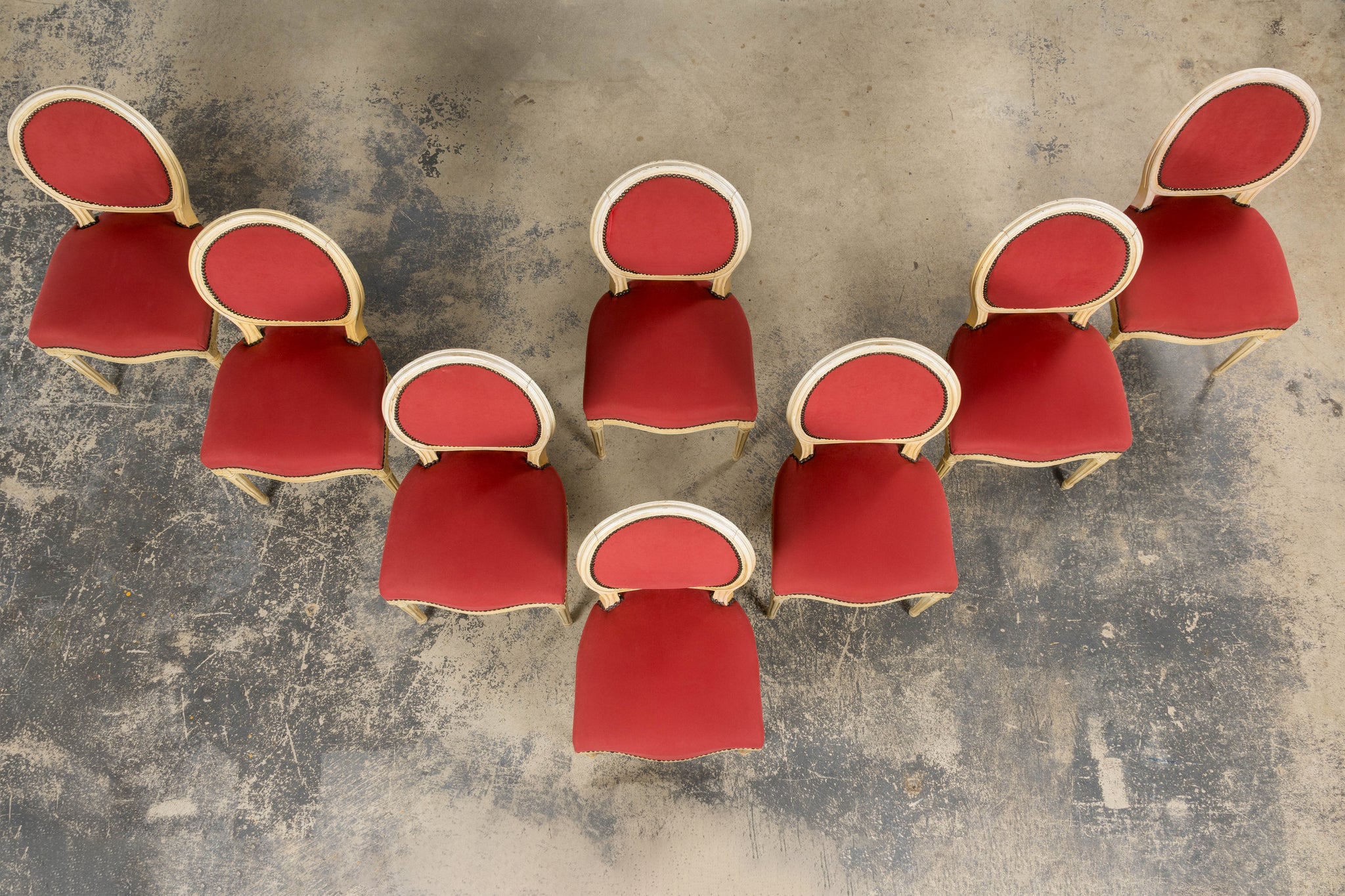 A lovely set of eight early 20th century French Louis XVI style dining chairs, sourced in Provence. Each chair is hand-crafted in solid hardwood and retains its original creamy antique white painted finish, with a naturally aged crackled patina and areas of soft distressing. The shaped oval backs and generous seats are upholstered in the original raspberry velvet, defined by nailhead trim that highlights the silhouette. Raised on turned and fluted legs with carved rosettes, the frames convey both elegance and solidity. We have structurally revised the set, ensuring stability and readiness for daily use while preserving the authentic character of the painted surfaces and velvet. The upholstery shows natural wear consistent with age, adding to the layered history and timeless appeal of the chairs.