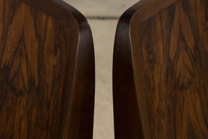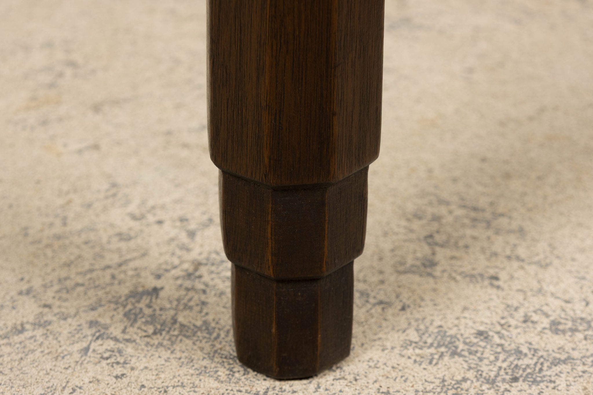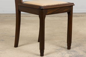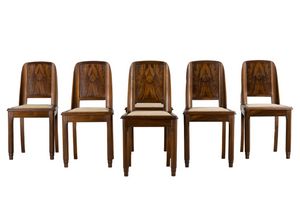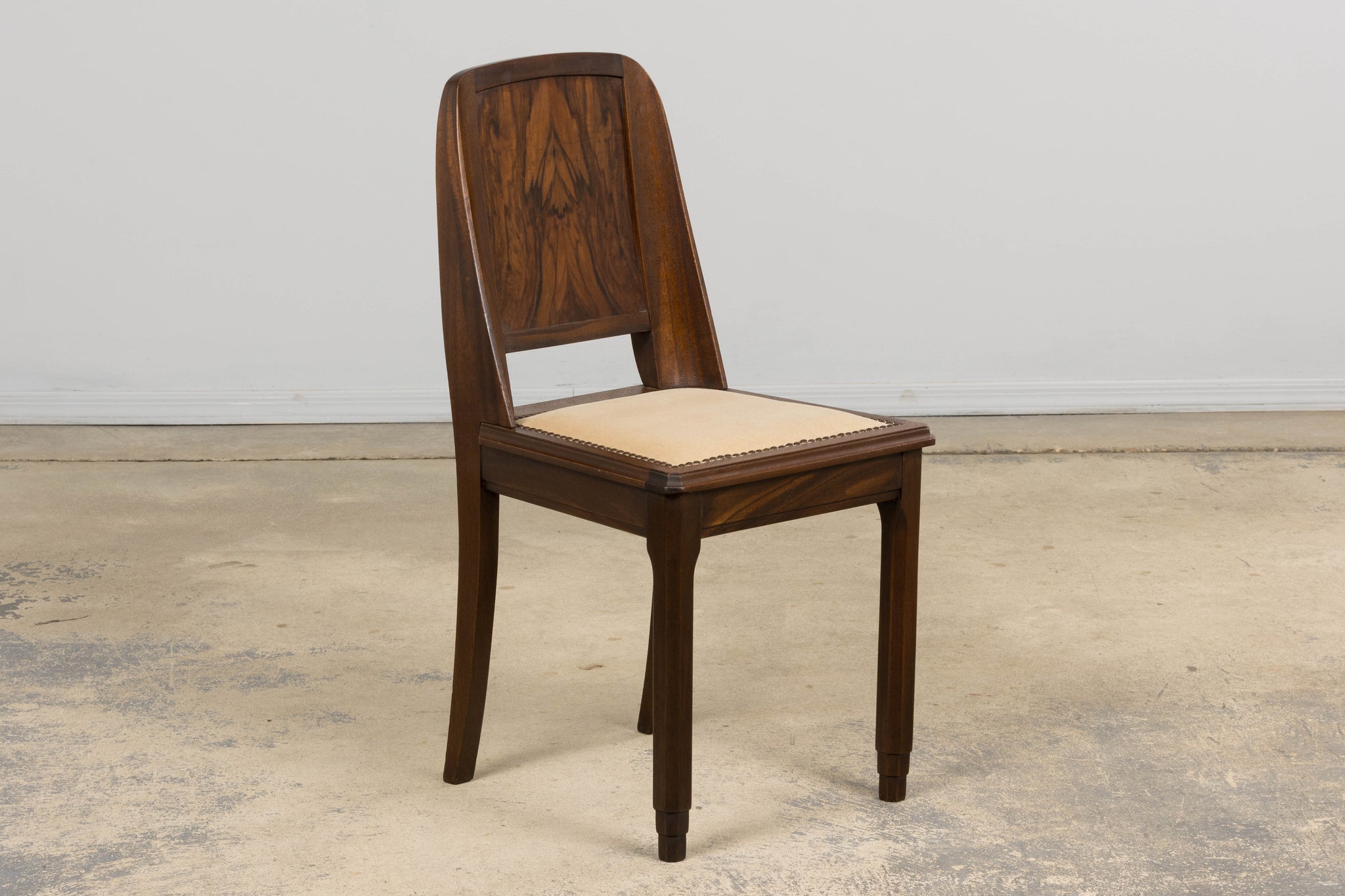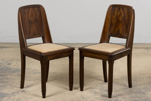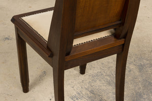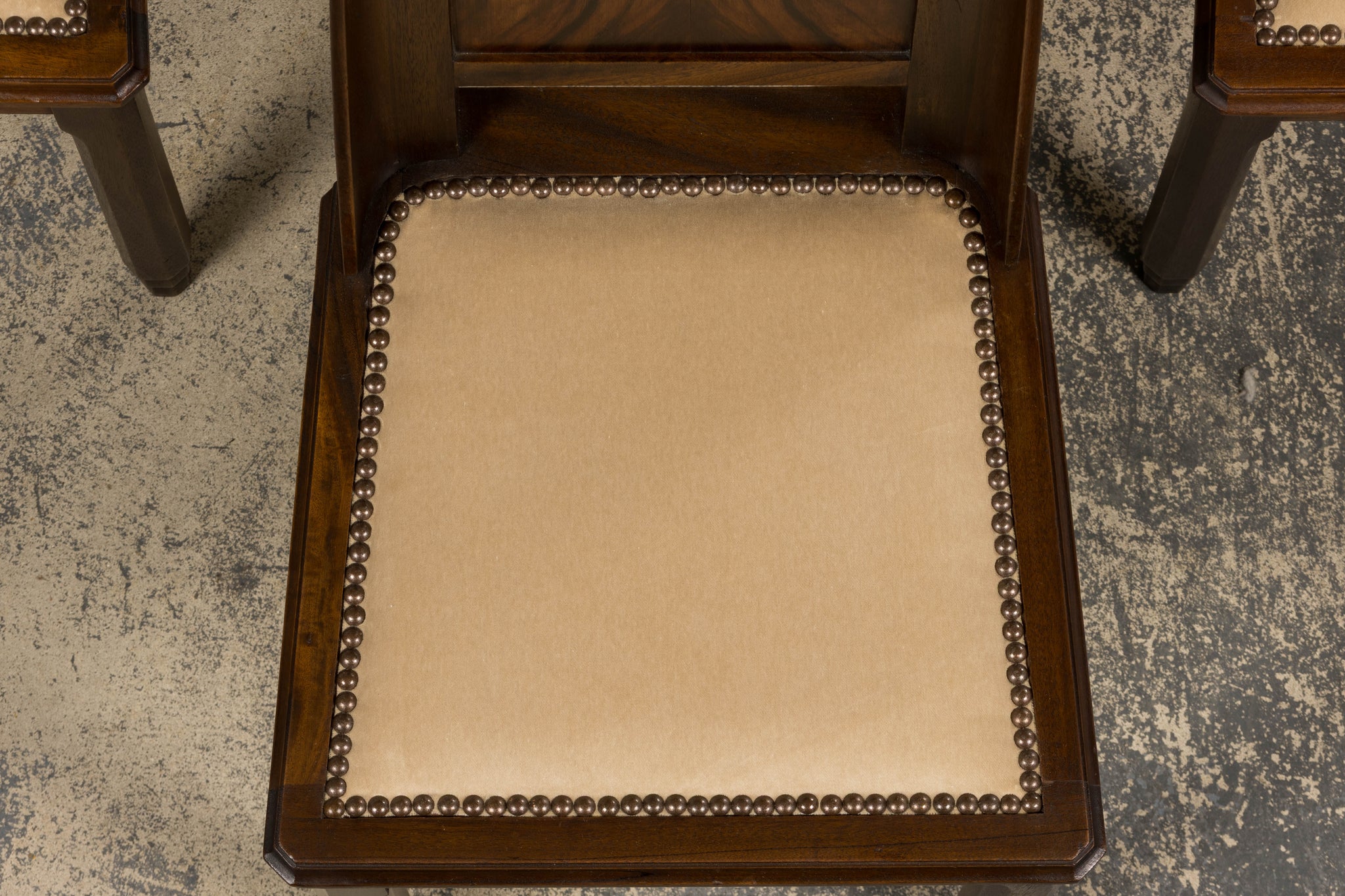 A refined set of six 1930s French Art Deco dining chairs, sourced from Provence. Handcrafted in solid mahogany, each chair features a square backrest with softly rounded edges and a subtly curved profile framed by tapered side panels, lending the design a sculptural Art Deco presence. The back panels are veneered in richly figured, book-matched mahogany, showcasing the bold geometric grain patterns emblematic of the period. Structurally restored and gently refinished, the chairs reveal a deep, warm tone that enhances the natural beauty of the wood. Newly upholstered in soft beige velvet and finished with brass nailhead trim, the seats offer a timeless contrast against the rich frame. The legs are carved with understated chamfered details and terminate in faceted feet, an elegant nod to modernist design. Solid, comfortable, and beautifully crafted, this set reflects the precision and quiet sophistication of early 20th-century French Art Deco craftsmanship.
