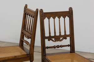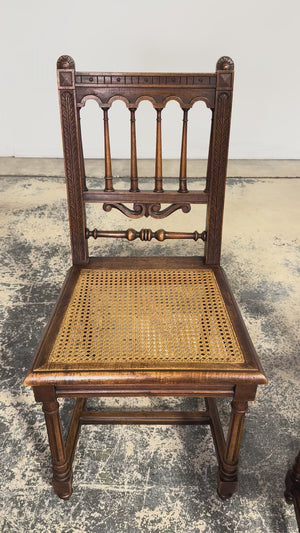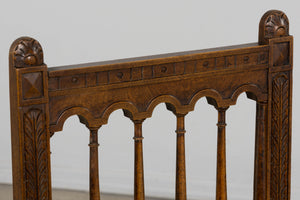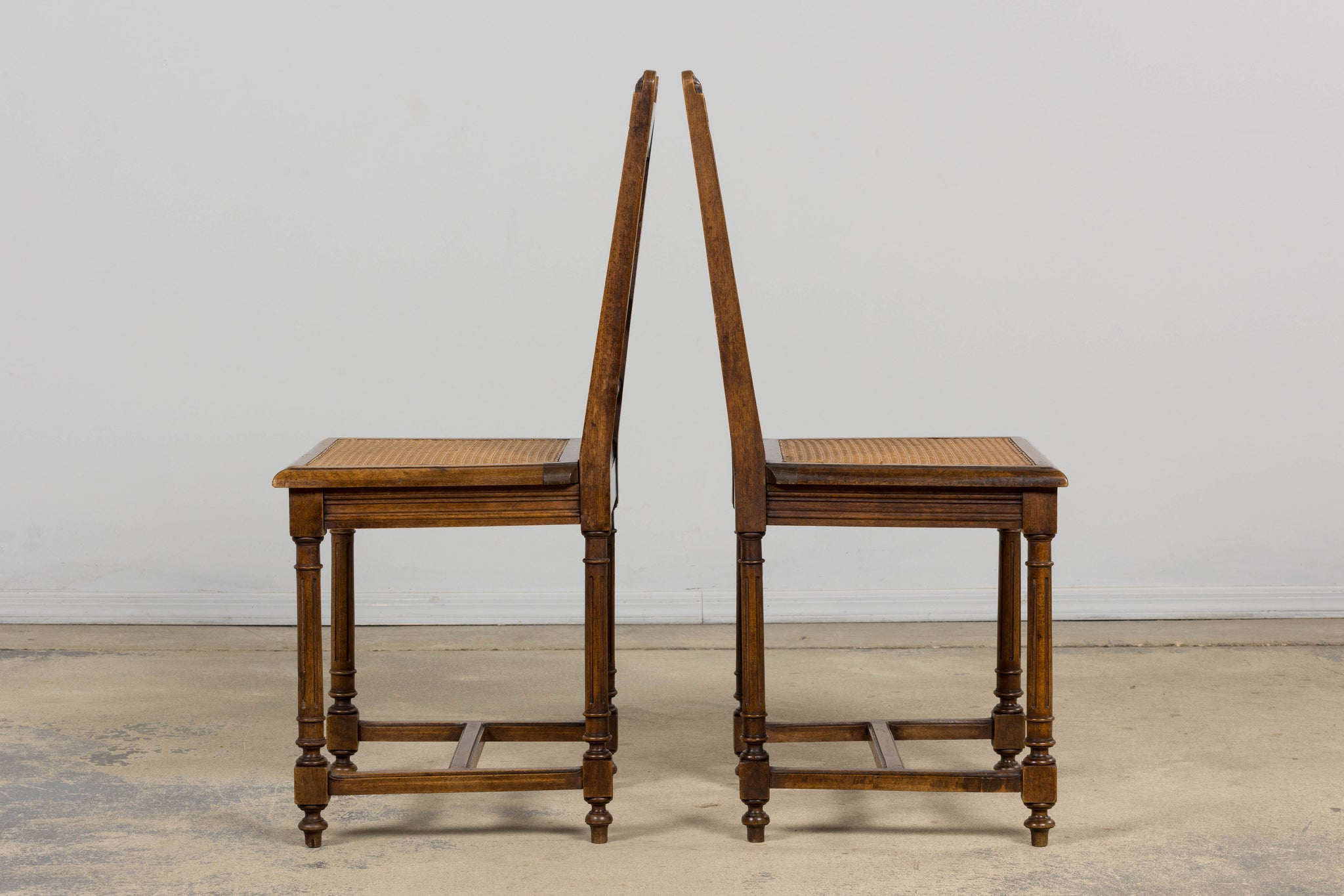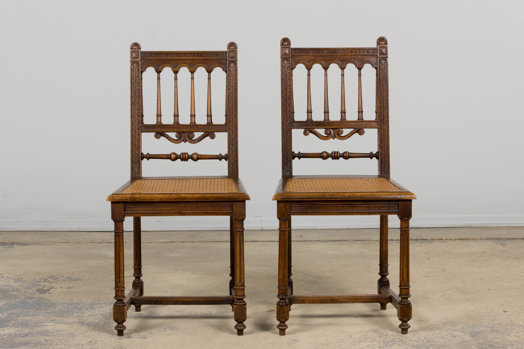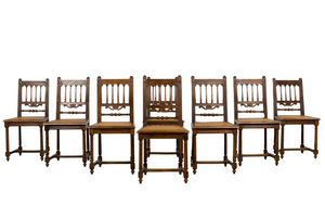A handsome set of eight mid 19th century French dining chairs made in the Louis XIII style, sourced in Provence, France. Crafted in walnut, the chairs feature tall rectilinear backs with turned spindle supports beneath a scalloped crest rail, framed by carved uprights with foliate detailing. The backs are further accented by a carved central scroll motif and a turned horizontal stretcher, giving the set a refined, architectural presence. Each chair is fitted with a woven cane seat set within molded seat rails, and raised on turned legs joined by square stretchers for added stability. The walnut shows a warm, time-softened tone with natural variation that reads beautifully as a cohesive set. The chairs have been fully structurally revised in our workshop to ensure soundness and everyday usability. The wood has been cleaned and finished with a hand-applied wax, enhancing the grain while preserving the original character and patina. The set includes eight chairs of matching design and construction; two chairs are slightly shorter in overall height, a variation consistent with hand-crafted 19th century furniture.A versatile set that works equally well in a traditional interior, a French country setting, or as contrast in a more modern space.