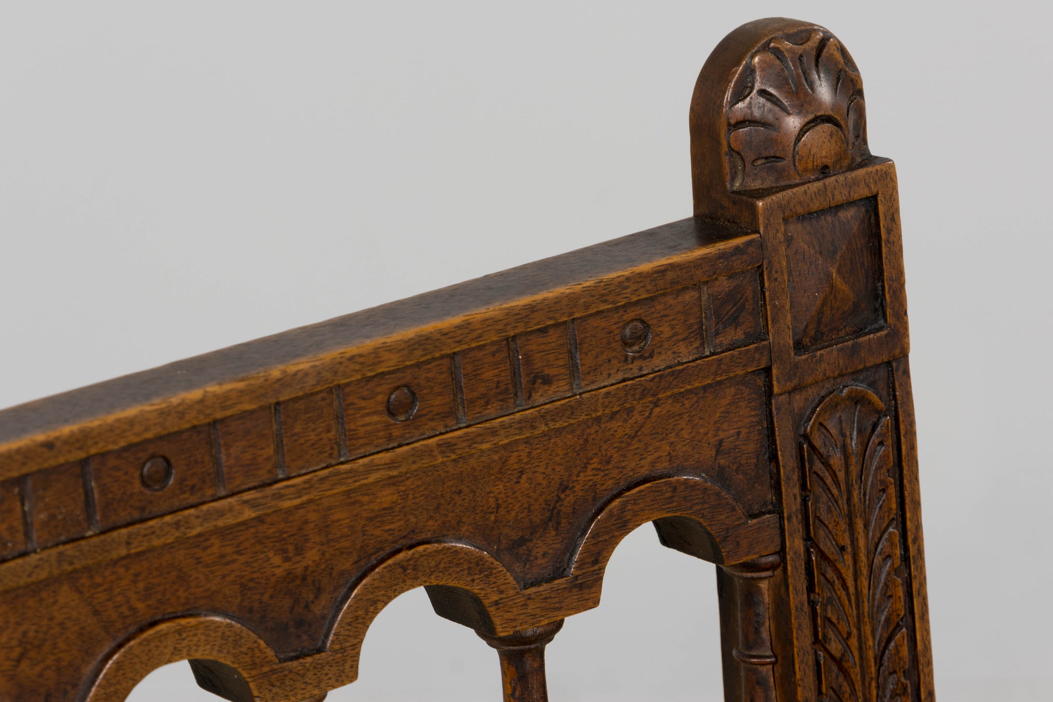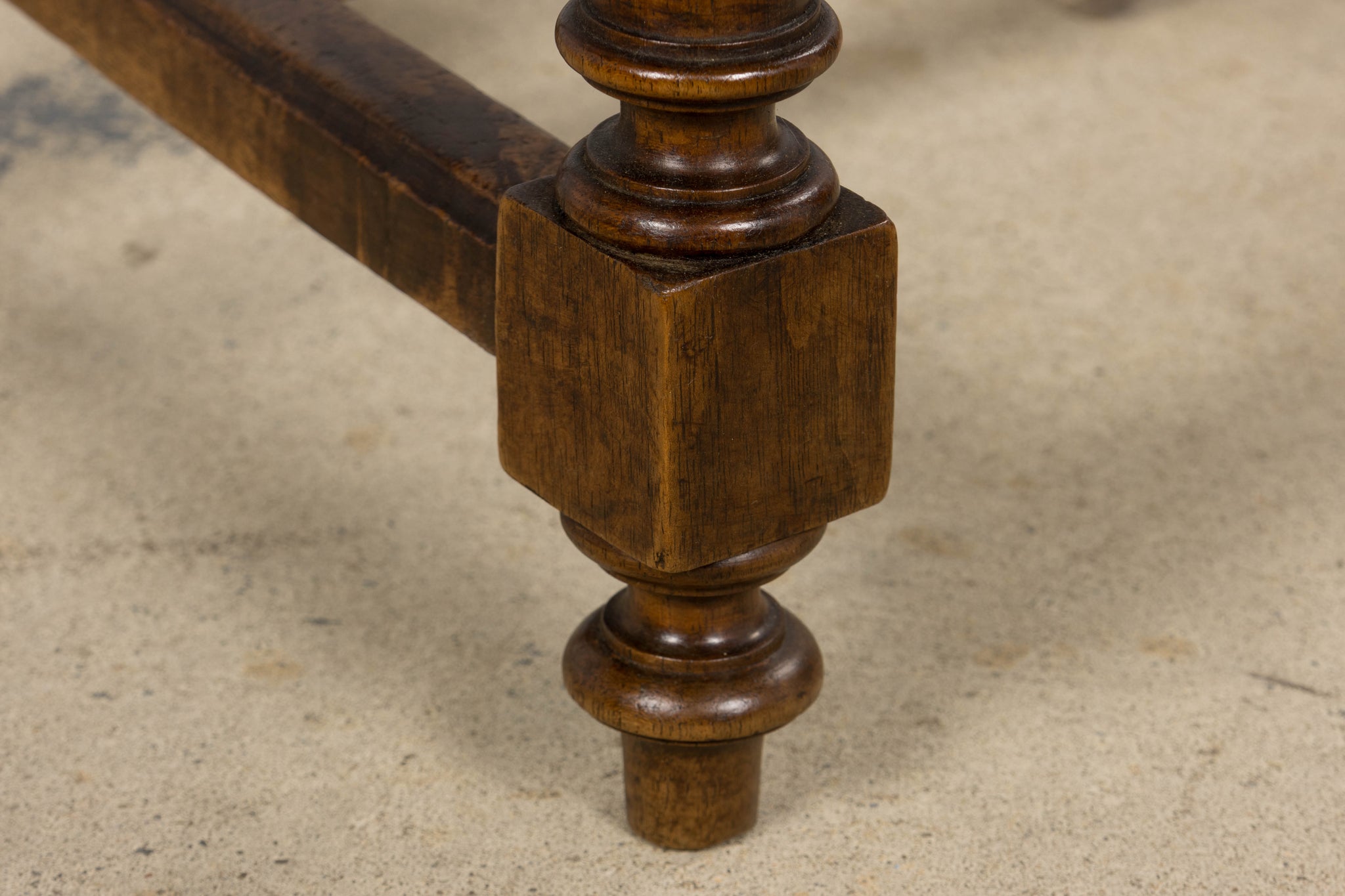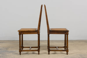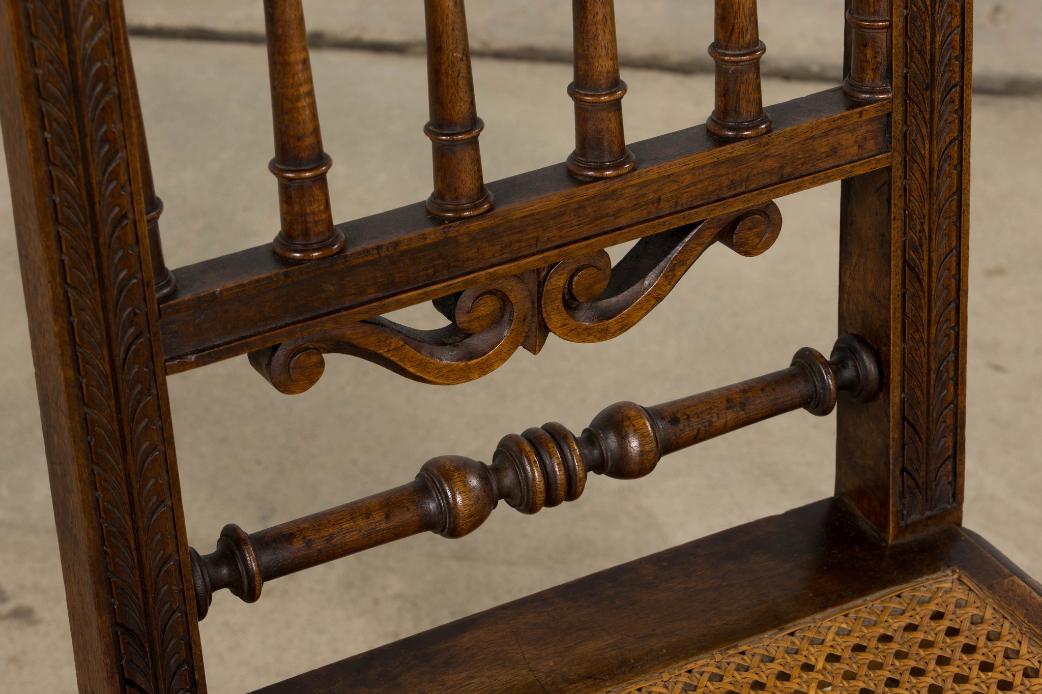 A handsome set of eight mid 19th century French dining chairs made in the Louis XIII style, sourced in Provence, France. Crafted in walnut, the chairs feature tall rectilinear backs with turned spindle supports beneath a scalloped crest rail, framed by carved uprights with foliate detailing. The backs are further accented by a carved central scroll motif and a turned horizontal stretcher, giving the set a refined, architectural presence. Each chair is fitted with a woven cane seat set within molded seat rails, and raised on turned legs joined by square stretchers for added stability. The walnut shows a warm, time-softened tone with natural variation that reads beautifully as a cohesive set. The chairs have been fully structurally revised in our workshop to ensure soundness and everyday usability. The wood has been cleaned and finished with a hand-applied wax, enhancing the grain while preserving the original character and patina. The set includes eight chairs of matching design and construction; two chairs are slightly shorter in overall height, a variation consistent with hand-crafted 19th century furniture.A versatile set that works equally well in a traditional interior, a French country setting, or as contrast in a more modern space.
