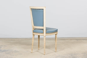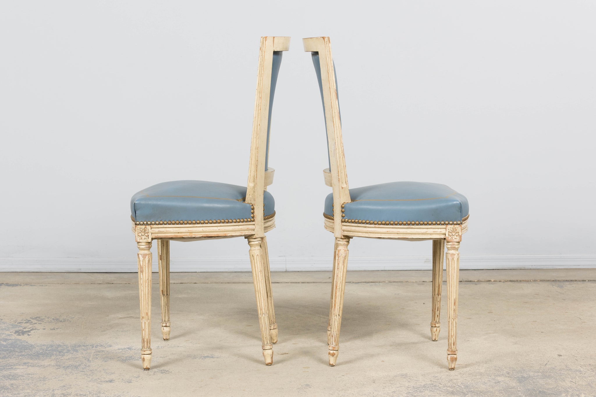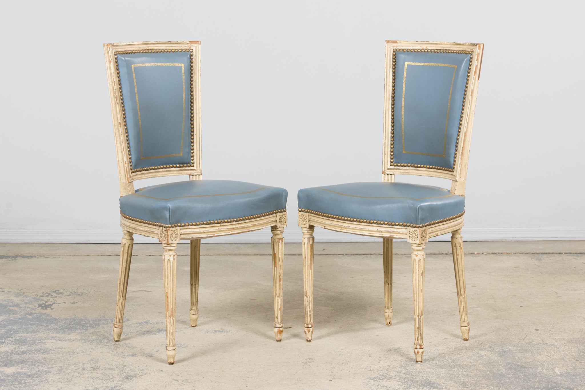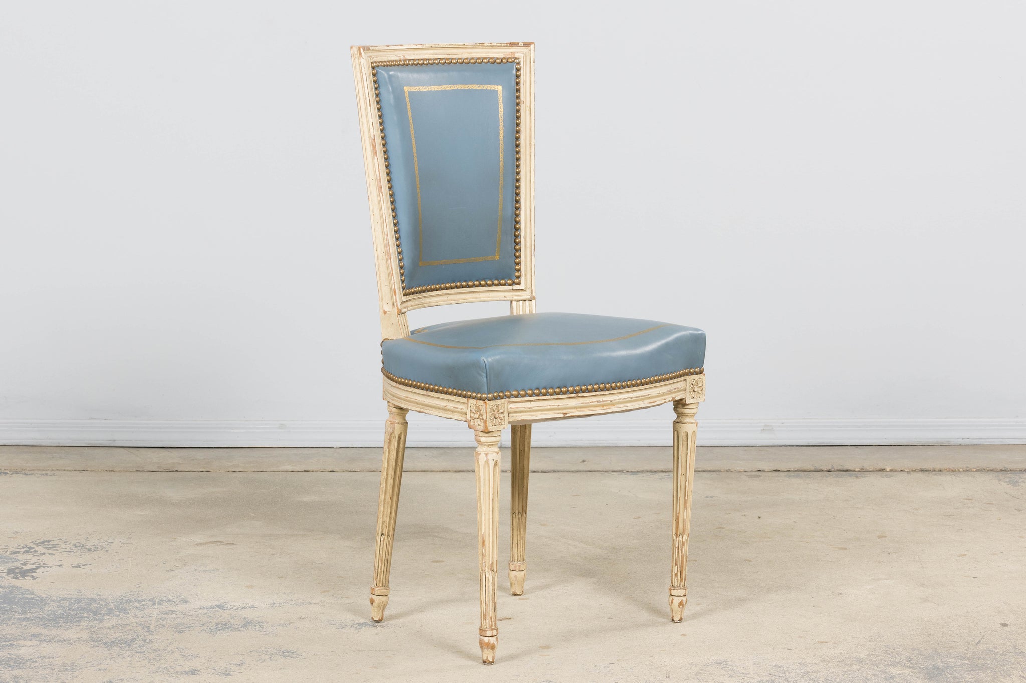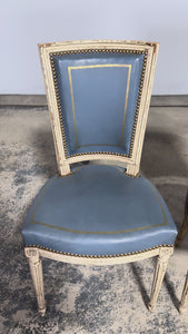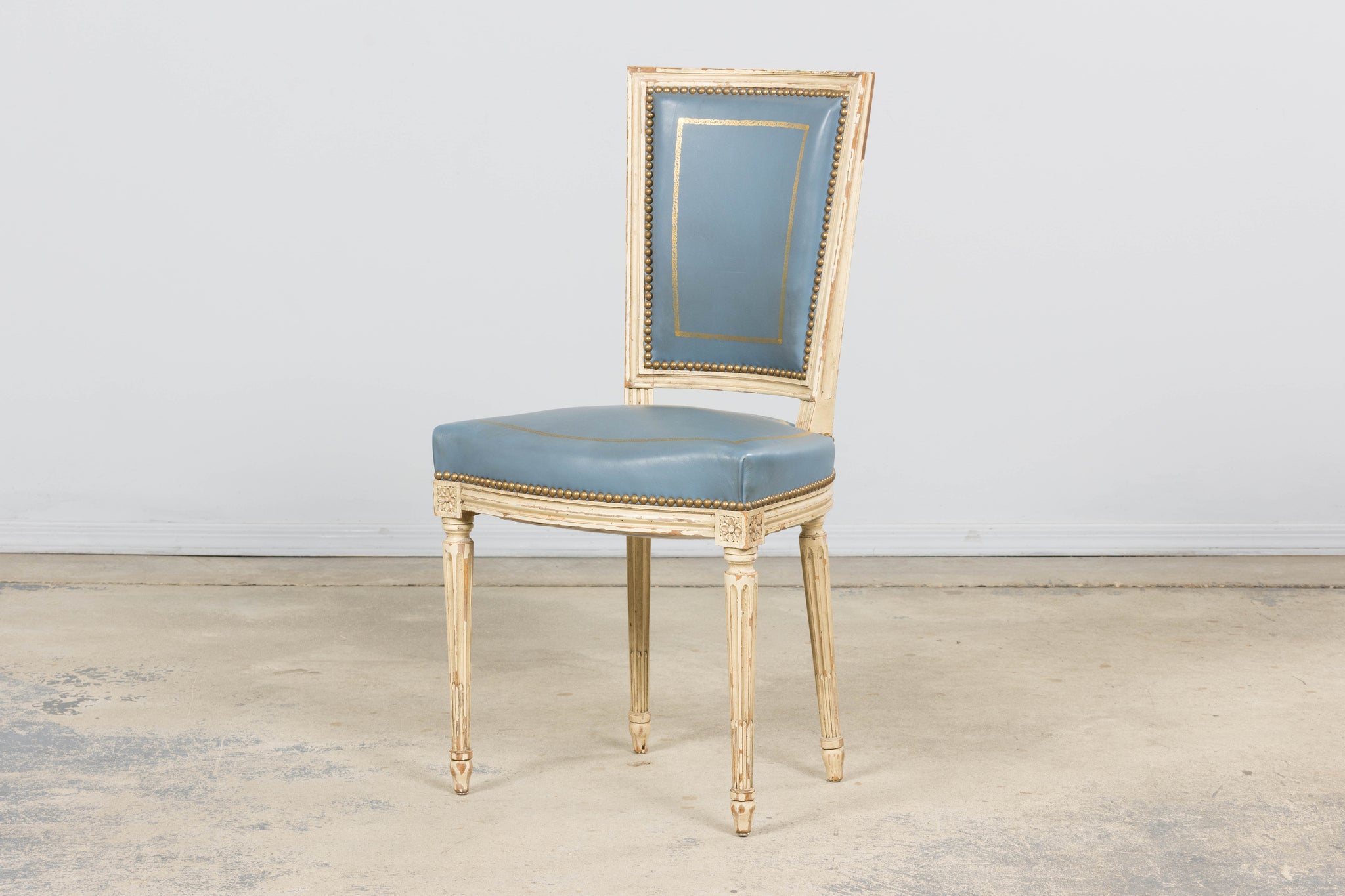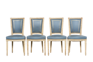 An exquisite set of four early 20th century French Louis XVI style side chairs, sourced in Paris. These chairs present classic Louis XVI revival proportions, defined by straight, tapering fluted legs, carved rosette corner blocks, and clean, architectural seat rails. The backs are gently shaped with upholstered panels, maintaining a restrained neoclassical profile that feels elegant without being overly formal. The painted wood frames showcase a naturally aged patina, with visible wear, paint loss, and surface variation developed over time. The frames have been structurally revised, reinforced, and tightened, and the chairs are solid and stable, ready for daily use. Seats and backs are upholstered in dusty French blue vinyl with gilt stenciled detailing and finished with brass nailhead trim applied with consistent spacing. Upholstery shows light wear consistent with age and use and remains in good overall condition. A refined and versatile set, well suited for both formal dining rooms and relaxed interiors, offering the balance of period character and practical comfort.