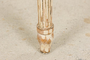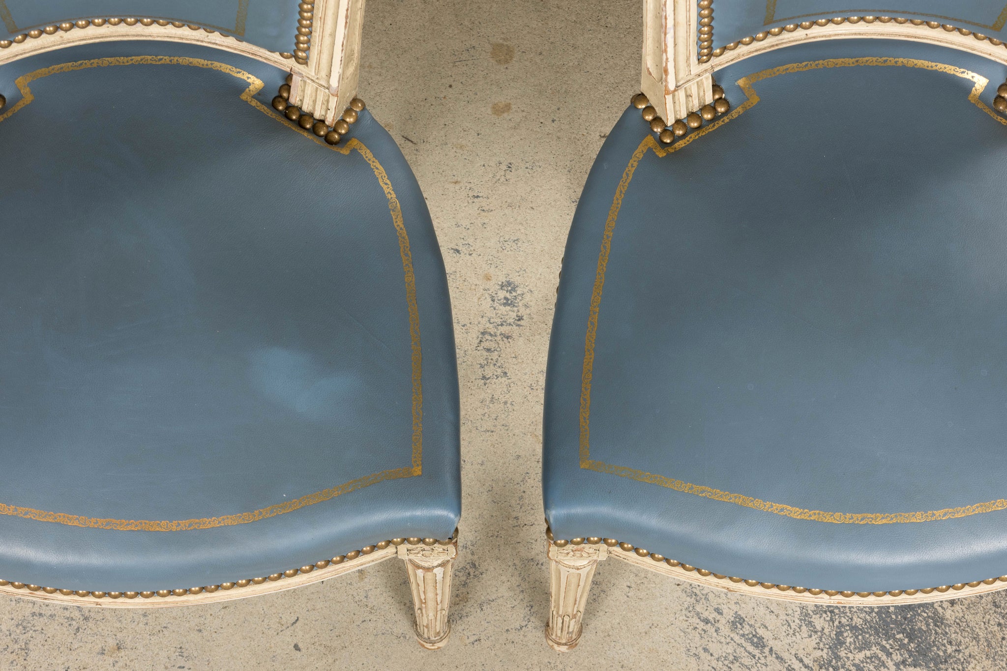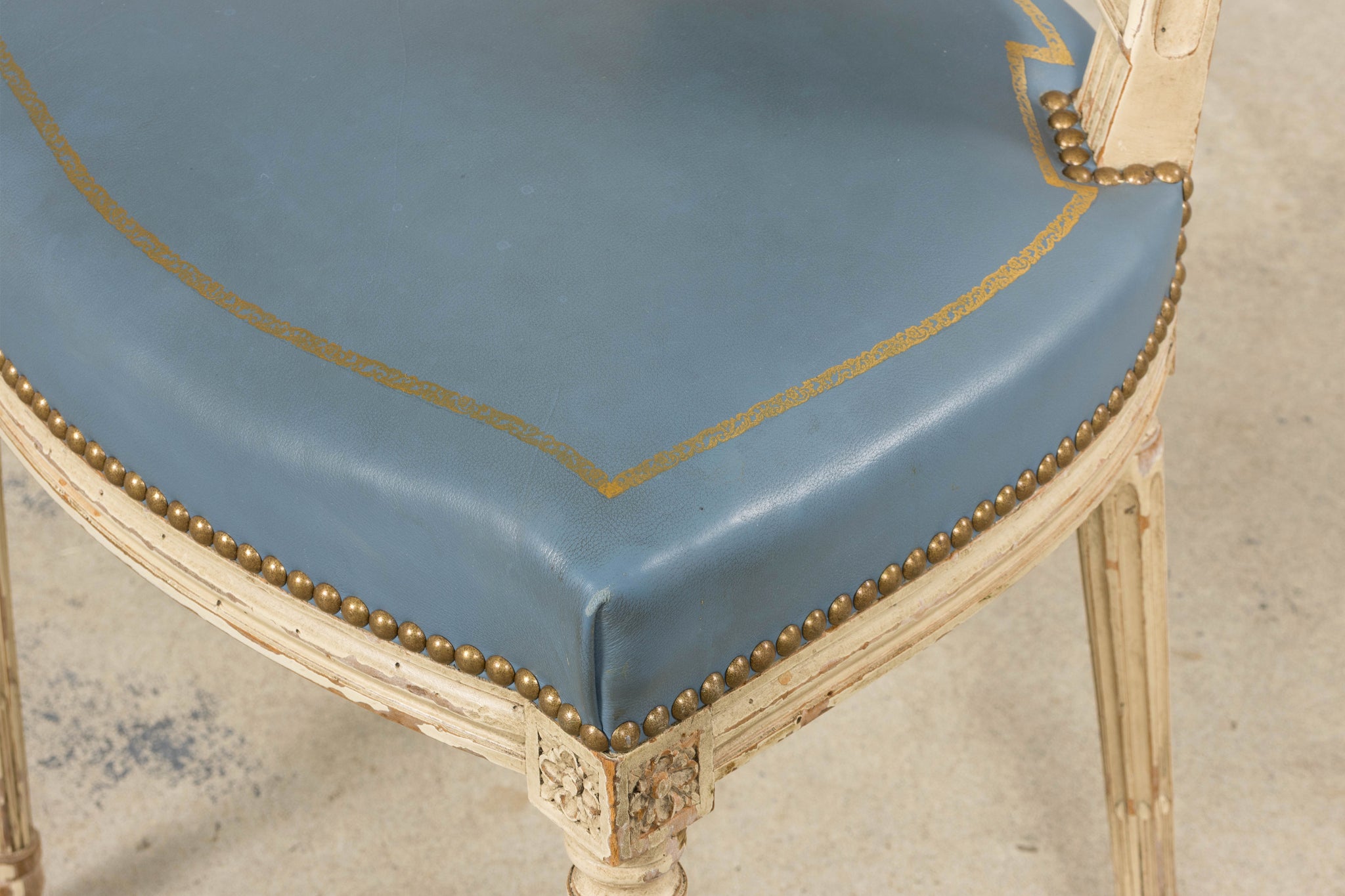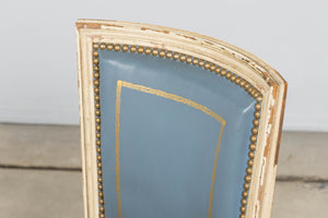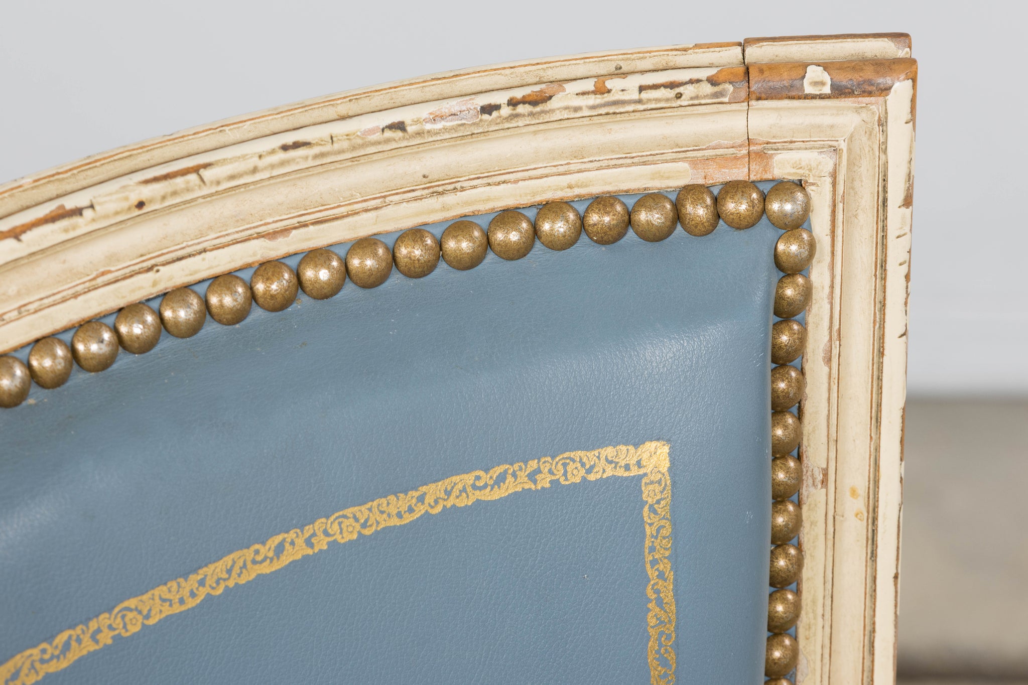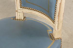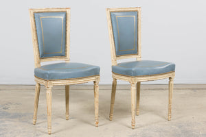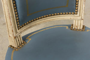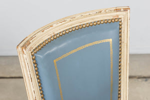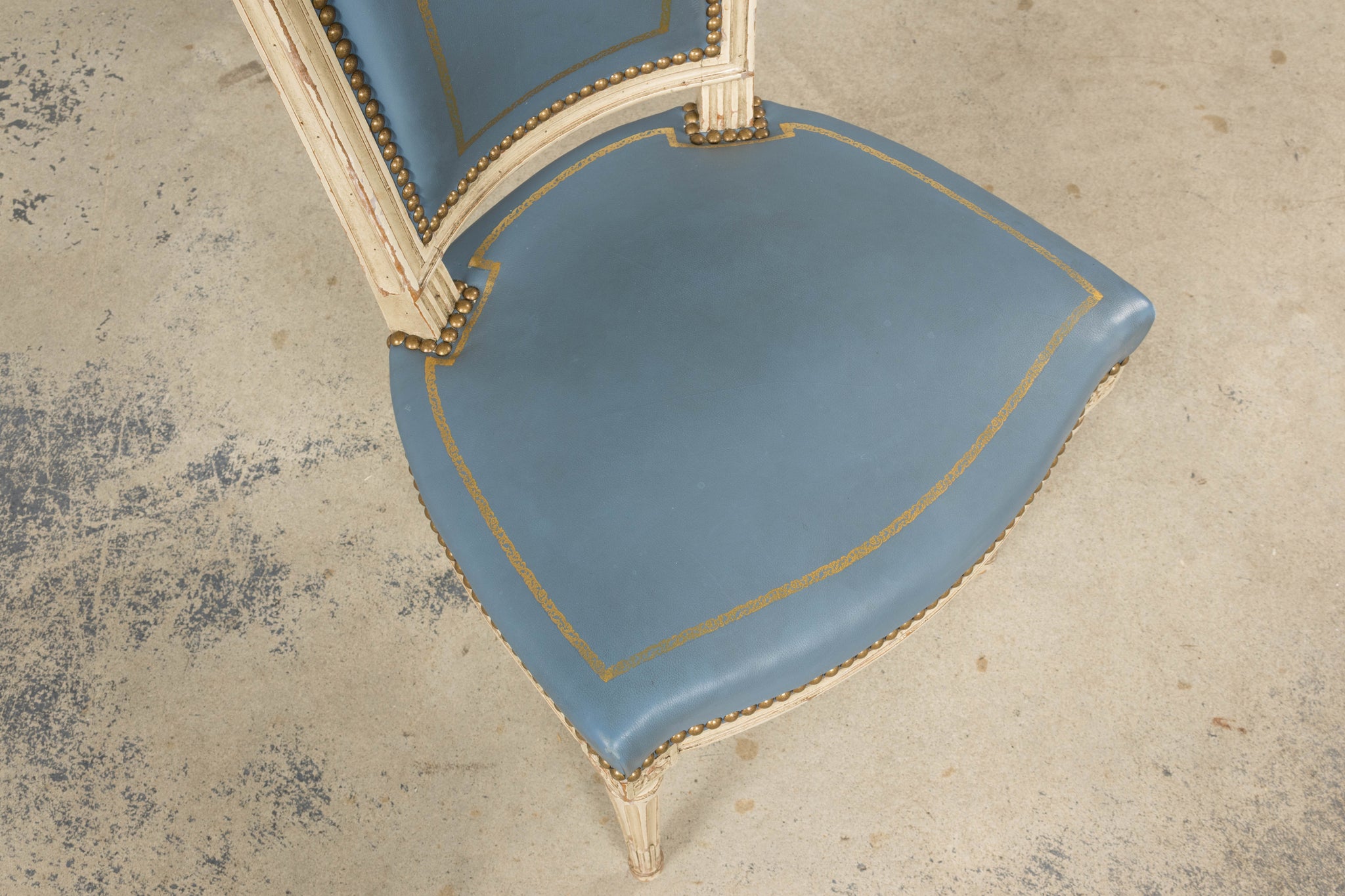 An exquisite set of four early 20th century French Louis XVI style side chairs, sourced in Paris. These chairs present classic Louis XVI revival proportions, defined by straight, tapering fluted legs, carved rosette corner blocks, and clean, architectural seat rails. The backs are gently shaped with upholstered panels, maintaining a restrained neoclassical profile that feels elegant without being overly formal. The painted wood frames showcase a naturally aged patina, with visible wear, paint loss, and surface variation developed over time. The frames have been structurally revised, reinforced, and tightened, and the chairs are solid and stable, ready for daily use. Seats and backs are upholstered in dusty French blue vinyl with gilt stenciled detailing and finished with brass nailhead trim applied with consistent spacing. Upholstery shows light wear consistent with age and use and remains in good overall condition. A refined and versatile set, well suited for both formal dining rooms and relaxed interiors, offering the balance of period character and practical comfort.