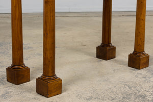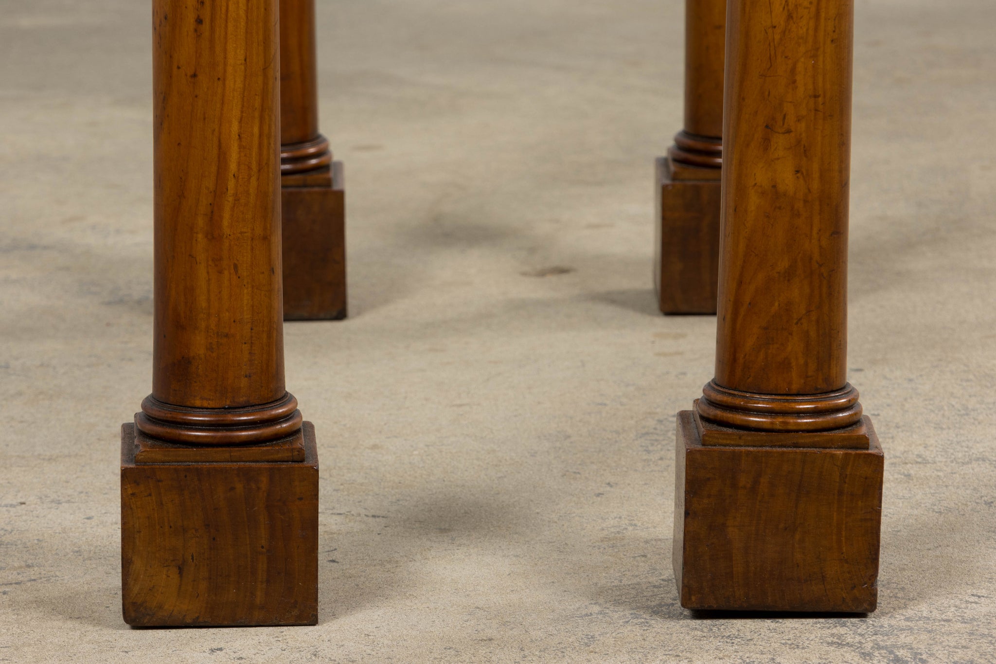 An early 19th century French Empire console table, sourced in Provence. The piece is constructed in solid mahogany with a rectangular dark grey granite top resting above a single apron drawer. The drawer front is veneered in figured mahogany, arranged in a bookmatched pattern that highlights the natural grain. The table stands on four columnar mahogany legs with ring moldings, each raised on square plinth bases, giving the form architectural balance and presence. The console has been structurally revised for stability. The mahogany shows an even, warm patina with age marks and light surface wear consistent with nearly two centuries of use. The veneered apron retains natural character, and the granite top remains in very good condition.