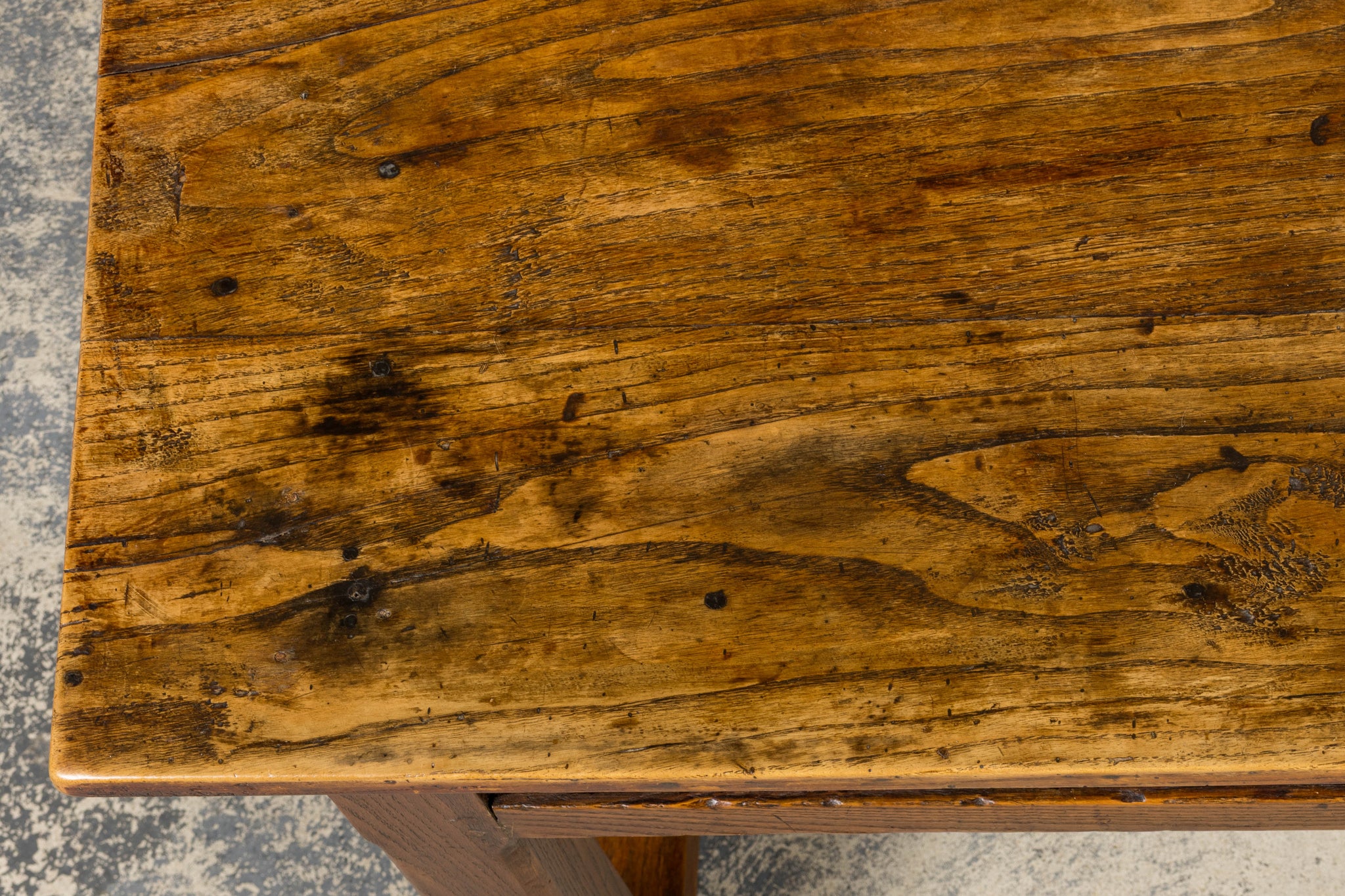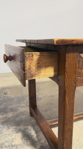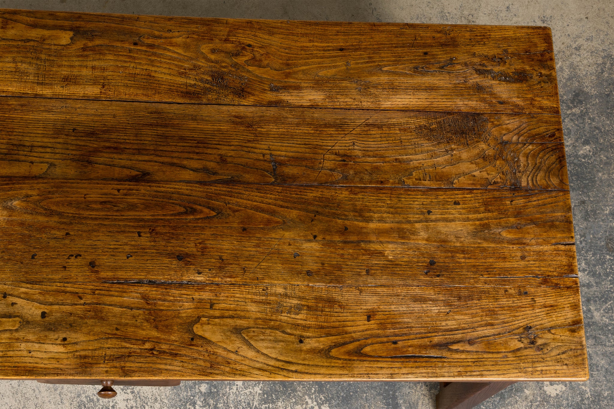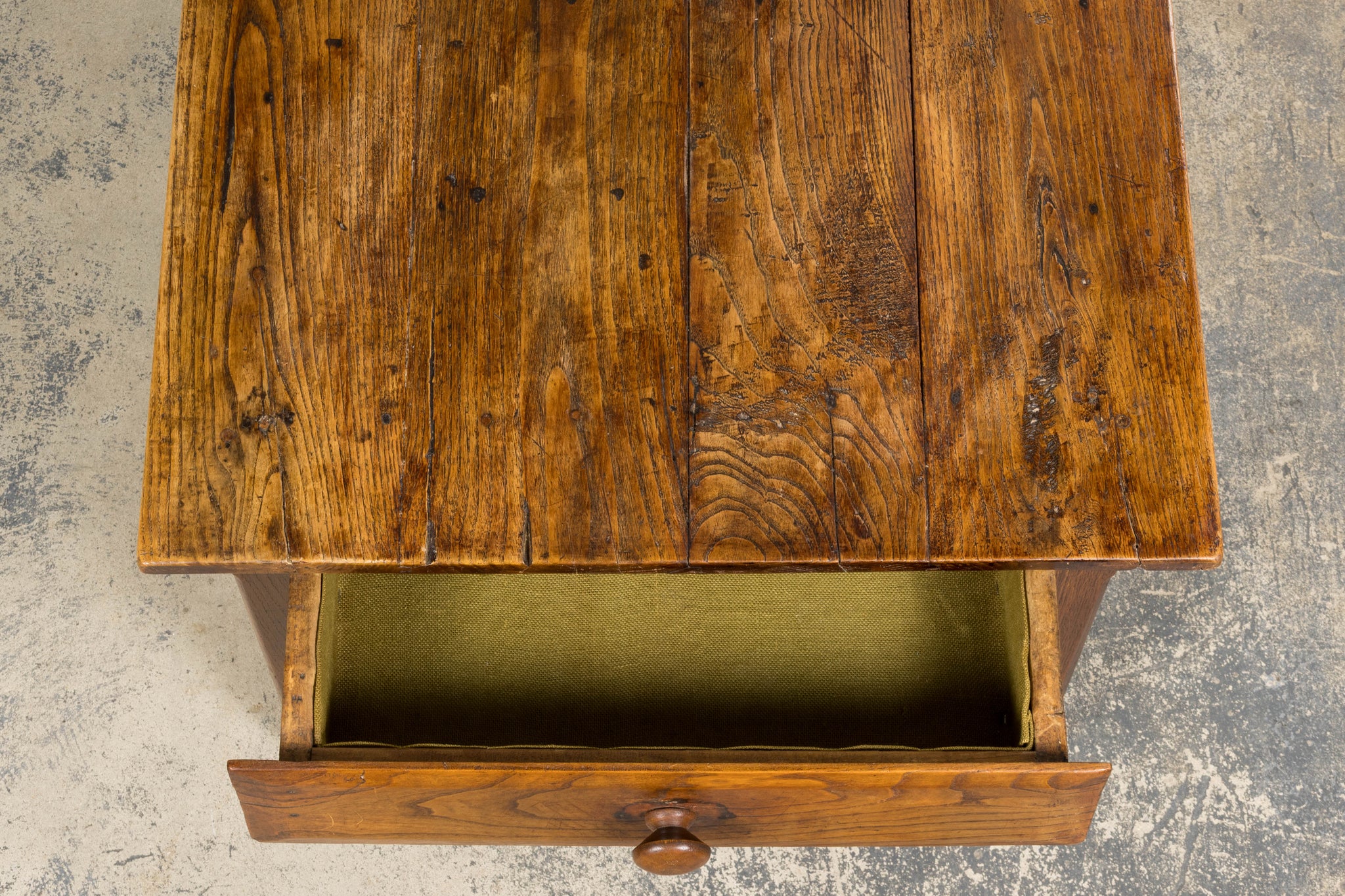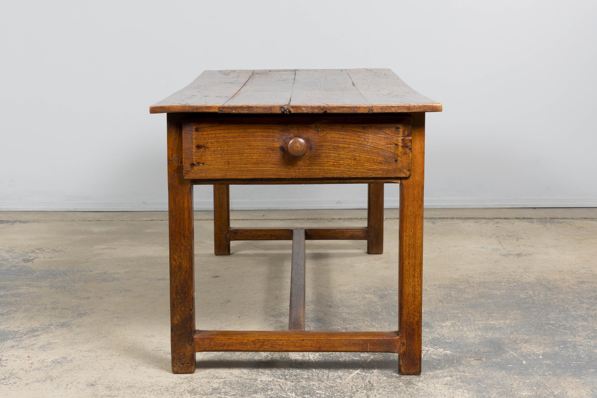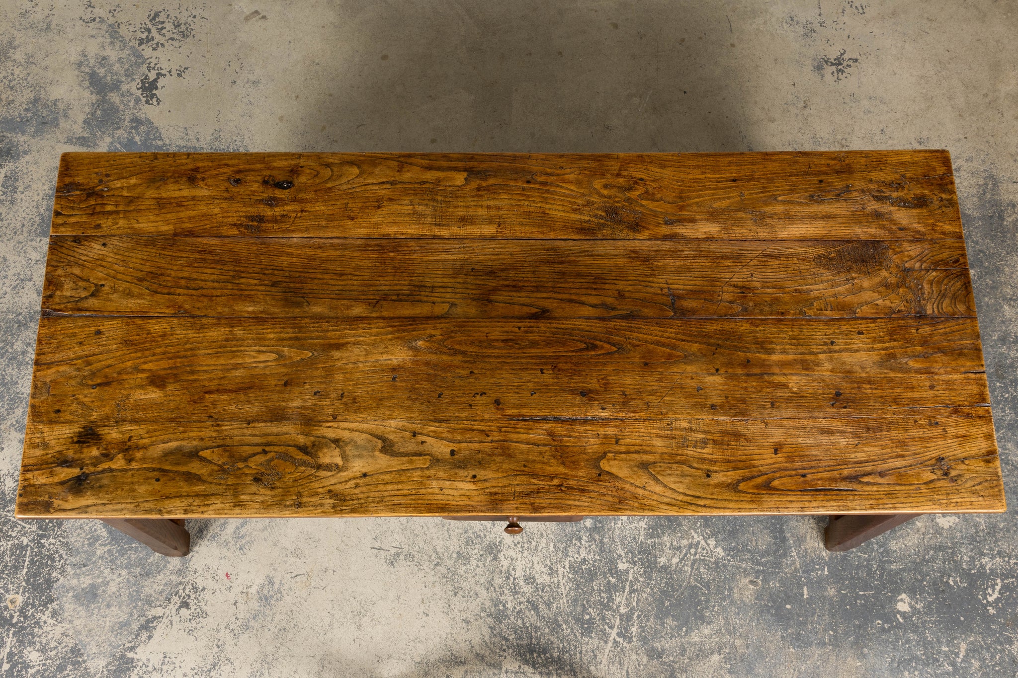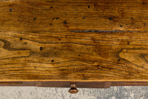 - Condition: Good antique condition consistent with age and use. The table has been structurally revised for stability; surface shows expected wear, tonal variation, and gentle undulation to the elm top, with minor marks throughout that contribute to its character.