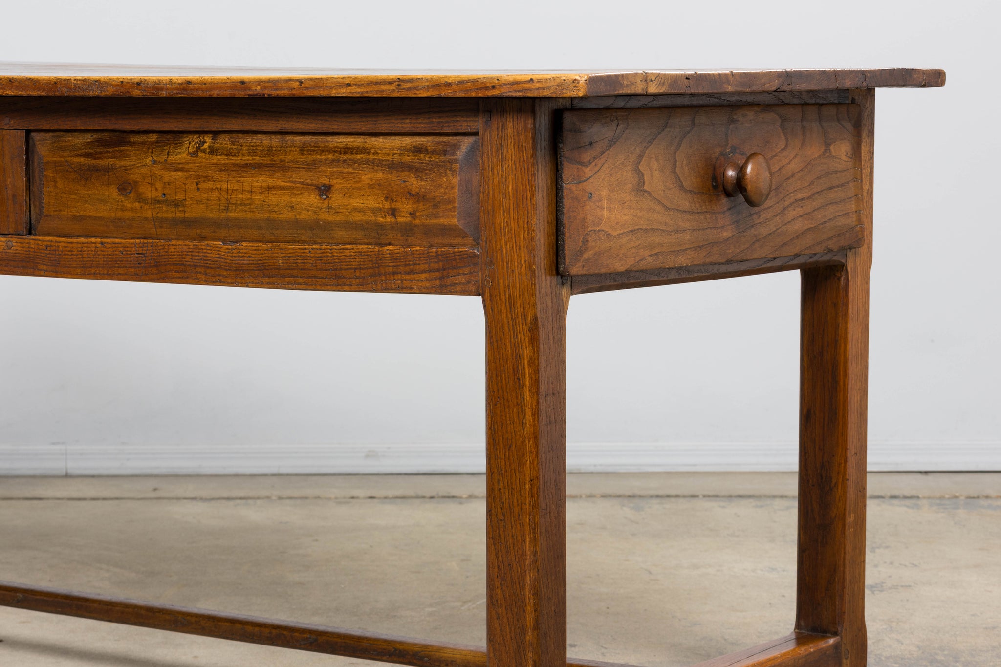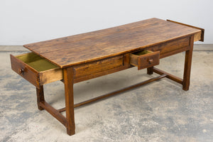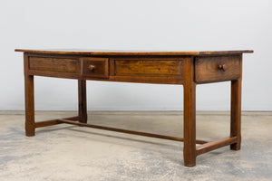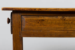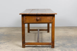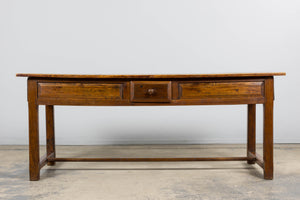 Early 19th century French provincial farmhouse trestle table sourced in Provence, France, featuring a solid elm plank top over a fruitwood base. The top shows warm tonal variation and natural wear accumulated over generations of use, creating a soft, lived-in surface and depth of color that only age can produce. Subtle undulation to the boards and gently worn edges reflect its hand-crafted origin and early construction. Raised on square chamfered legs joined by a full H-form stretcher base, the table is constructed with traditional pegged mortise and tenon joinery throughout. The fruitwood apron is fitted with three drawers, two long side drawers and one central working drawer, all with hand-cut interiors and wooden knob pulls, allowing the piece to function from multiple sides as originally intended. The piece has been structurally revised in our workshop to ensure stability for everyday use and the wood has been carefully cleaned and finished with a hand-applied wax, enhancing depth while preserving the original patina. Originally used as a kitchen or work table, it can again serve beautifully as a small dining table or kitchen island, and also adapts well as a console or large writing desk while retaining its honest farmhouse character and presence.