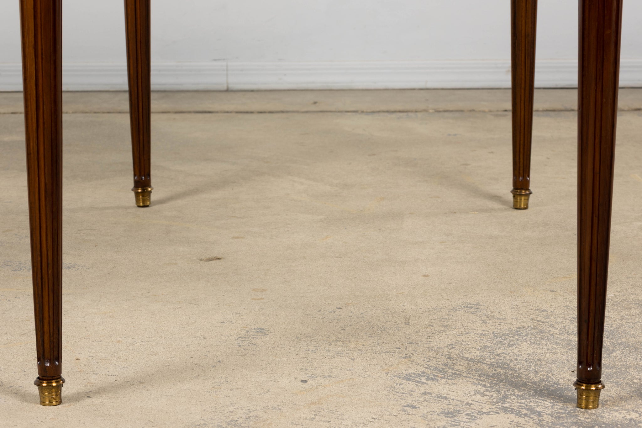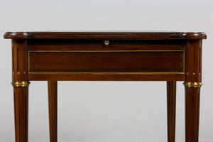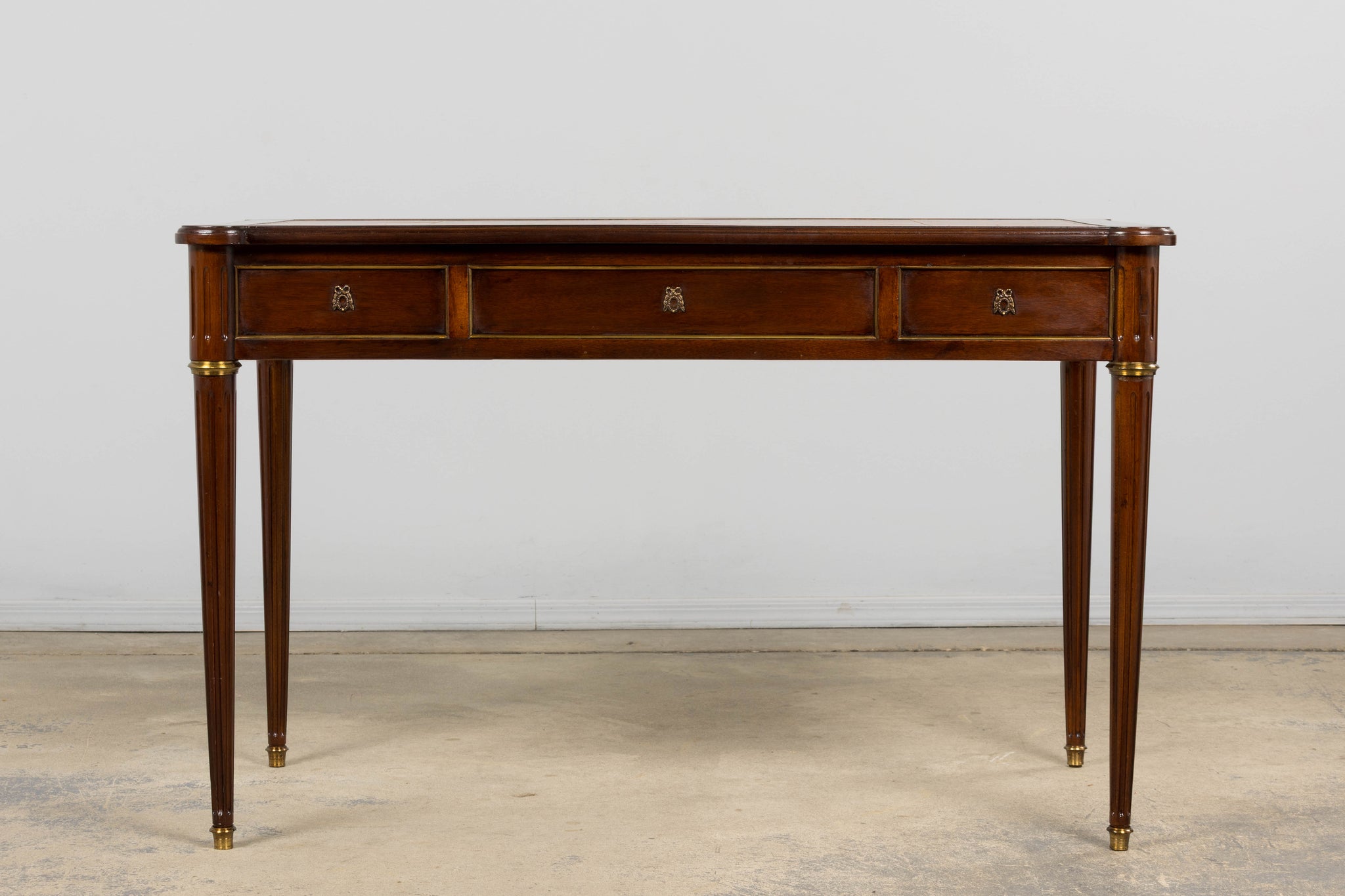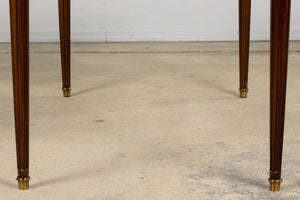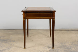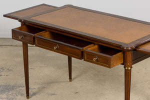 A refined early 20th century French Louis XVI style writing desk sourced in Paris and crafted in mahogany, expressing the clarity and symmetry associated with neoclassical design. The rectangular top is inset with its original warm cognac-toned gilt-tooled leather writing surface, bordered by a continuous tooling and centered by a classical cartouche, showing gentle wear consistent with age and use. The frieze is fitted with three drawers to the front and pull-out writing slides on both sides, allowing the working surface to expand when needed. Each drawer is framed by subtle brass beading and fitted with decorative escutcheons and key pulls. The desk stands on tapering fluted legs terminating in brass sabots, with rounded corner blocks echoing late eighteenth century architectural forms. The piece has been structurally restored in our workshop. Joints have been secured, drawers aligned, and surfaces carefully cleaned and waxed to revive depth of tone while preserving the natural patina. The leather top remains original and retains its character. Elegant in proportion and practical in scale, the desk works well as a writing desk, console, study table or powder room table within both traditional and contemporary interiors.