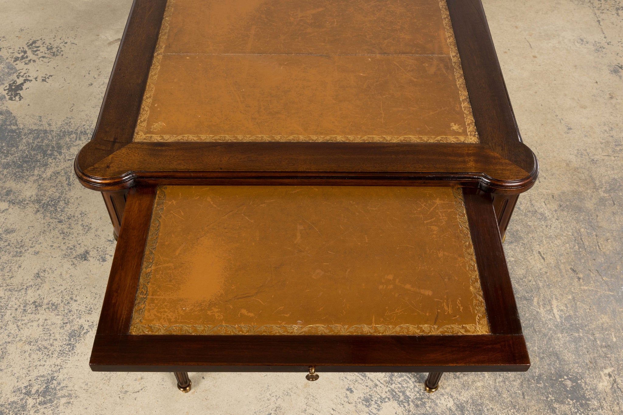 - Condition: Structurally sound. Original leather top with visible wear and patina. Surfaces cleaned and waxed. Minor age-appropriate marks throughout. Pull-out slides function smoothly.
