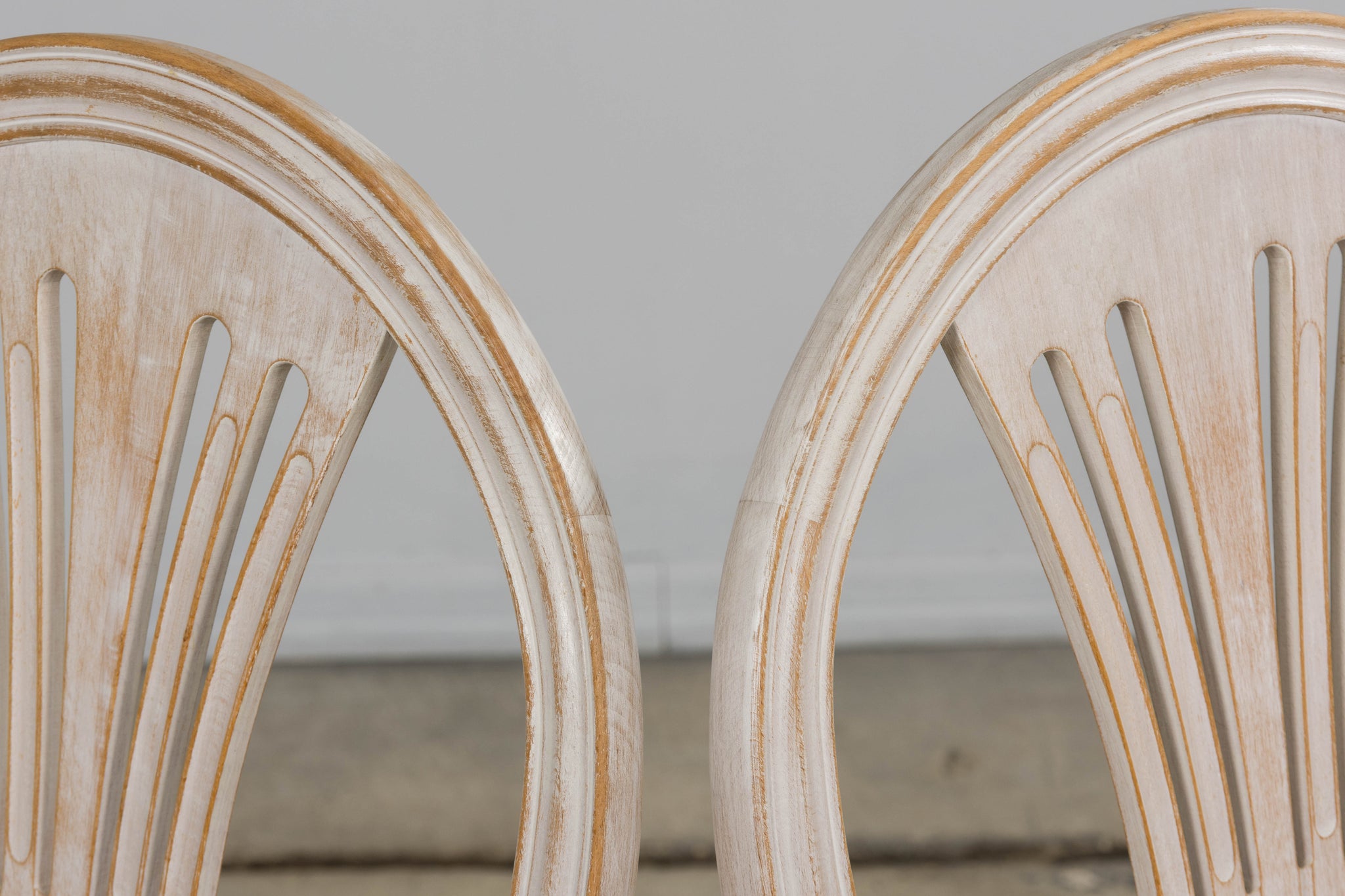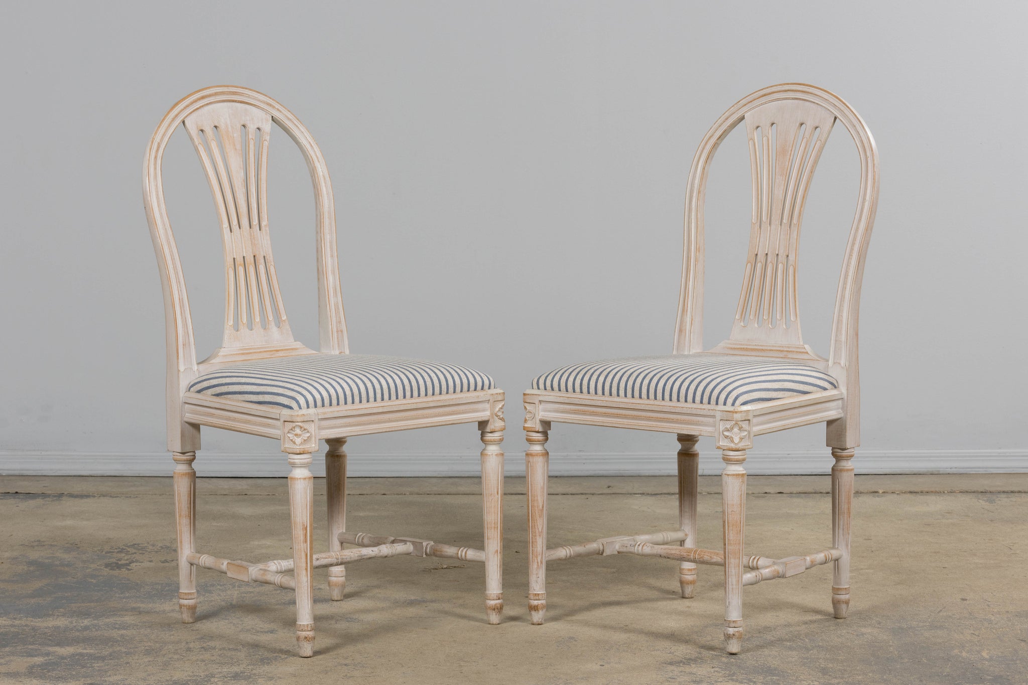 An elegant set of six mid 20th century French Louis XVI style dining chairs, sourced in Provence. Each chair presents an arched shield-back with a pierced splat, over a carved seat rail with rosettes at the corners, raised on tapered, fluted legs joined by turned stretchers. The frames have been structurally restored for stability and newly upholstered in a fresh striped linen, complementing the neoclassical form with a crisp, timeless look. The painted finish in a soft antique white, lightly distressed, recalls the pale Gustavian aesthetic while preserving the character of French neoclassicism.