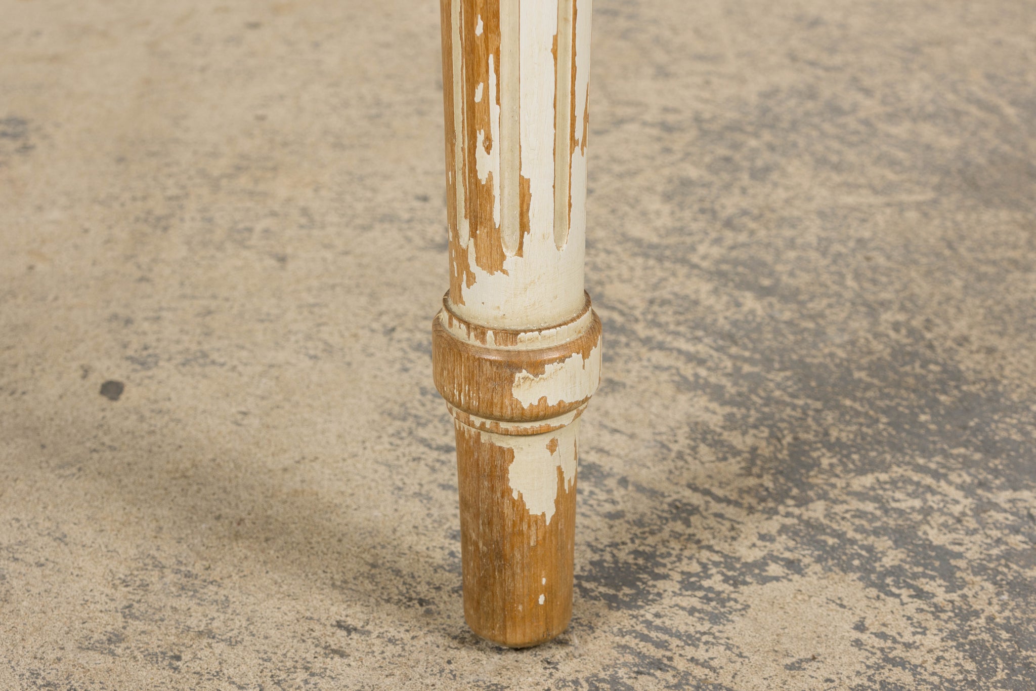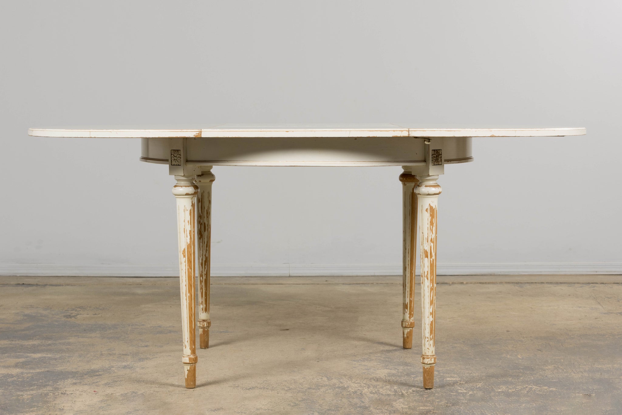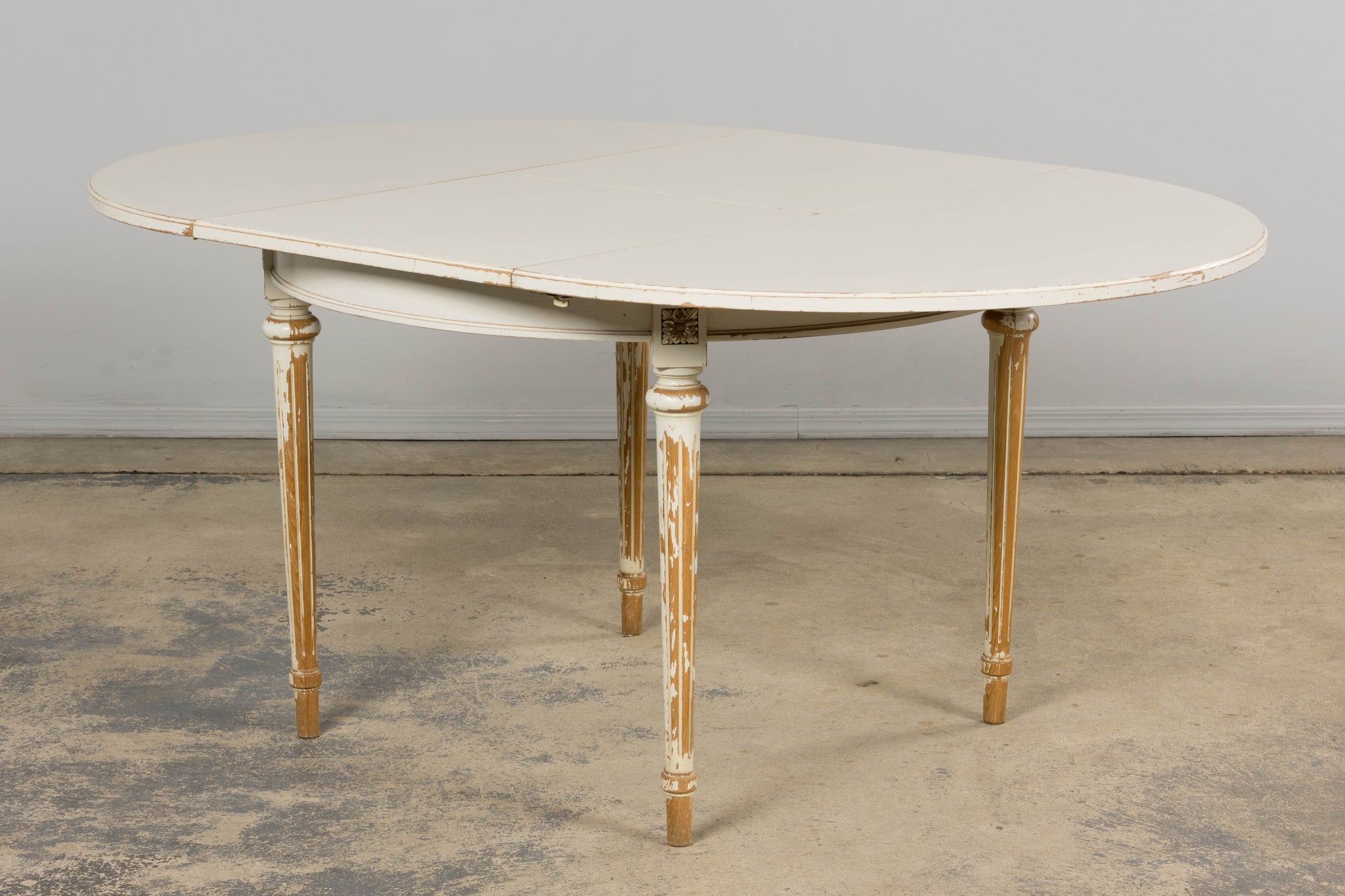 An elegant mid-20th century French Louis XVI style dining table, sourced in Provence. The table rests on four tapered, fluted legs capped with carved rosettes at the apron corners, all in a painted cream finish with distressed wear that evokes the Gustavian aesthetic. The circular top extends to an oval with the addition of two leaves, offering versatility for intimate or larger dining arrangements. The painted surface shows age-appropriate wear with areas of paint loss, giving the piece a relaxed Provençal character.