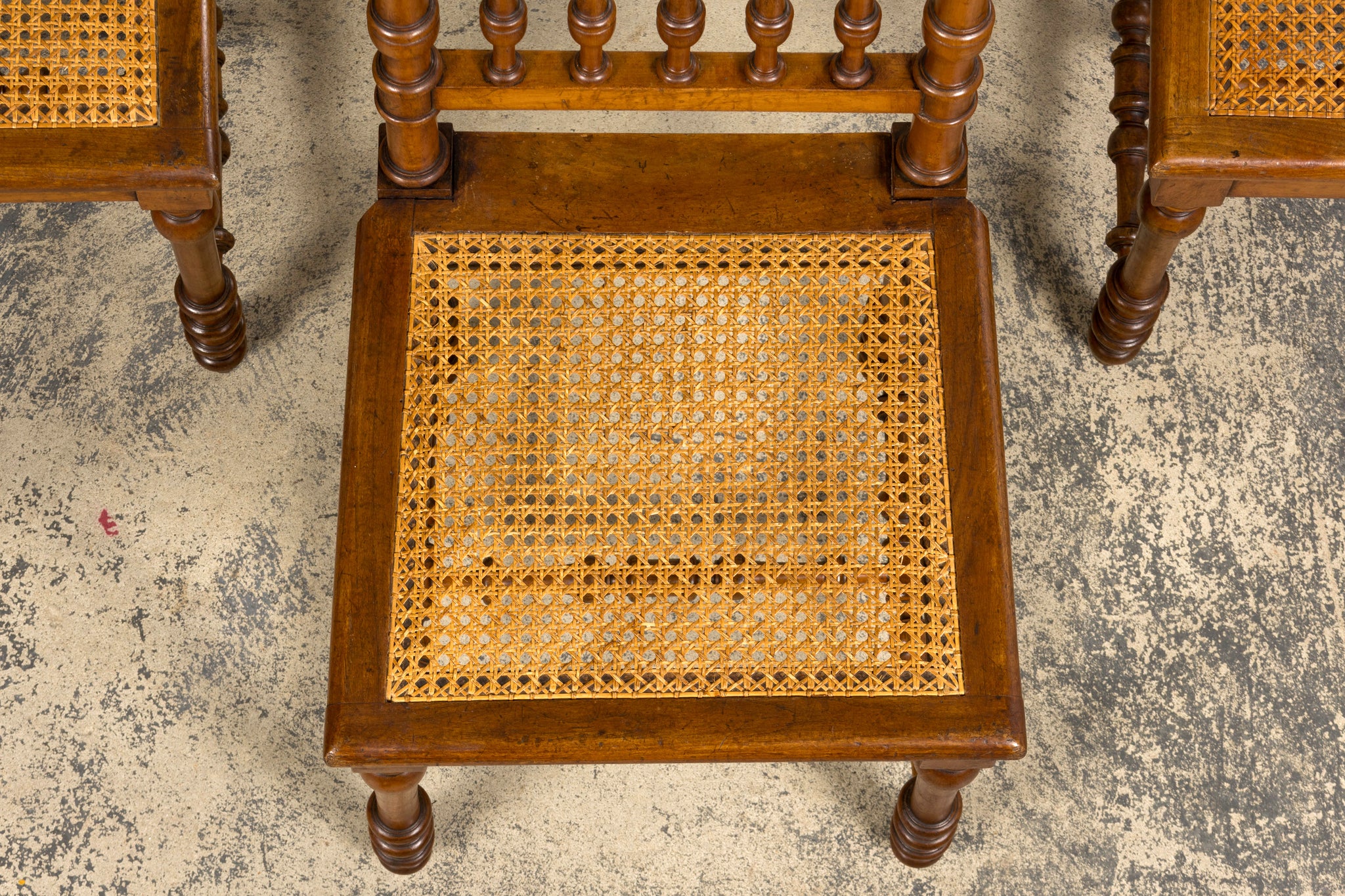- Condition: Structurally revised and stabilized. Walnut frames cleaned and waxed. Original cane seats with age-appropriate wear. Minor surface wear consistent with age and use.