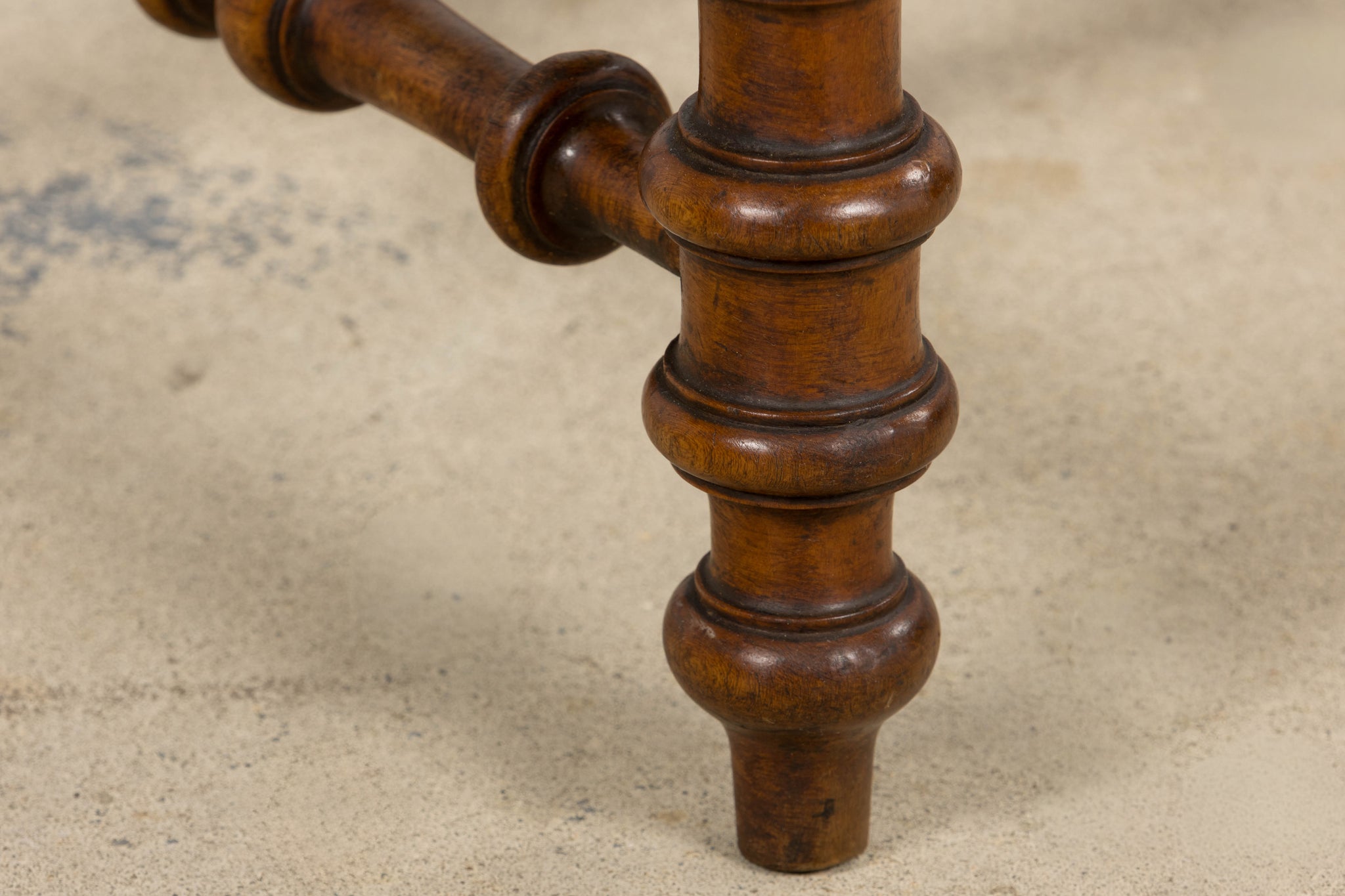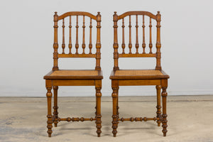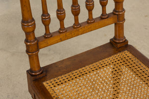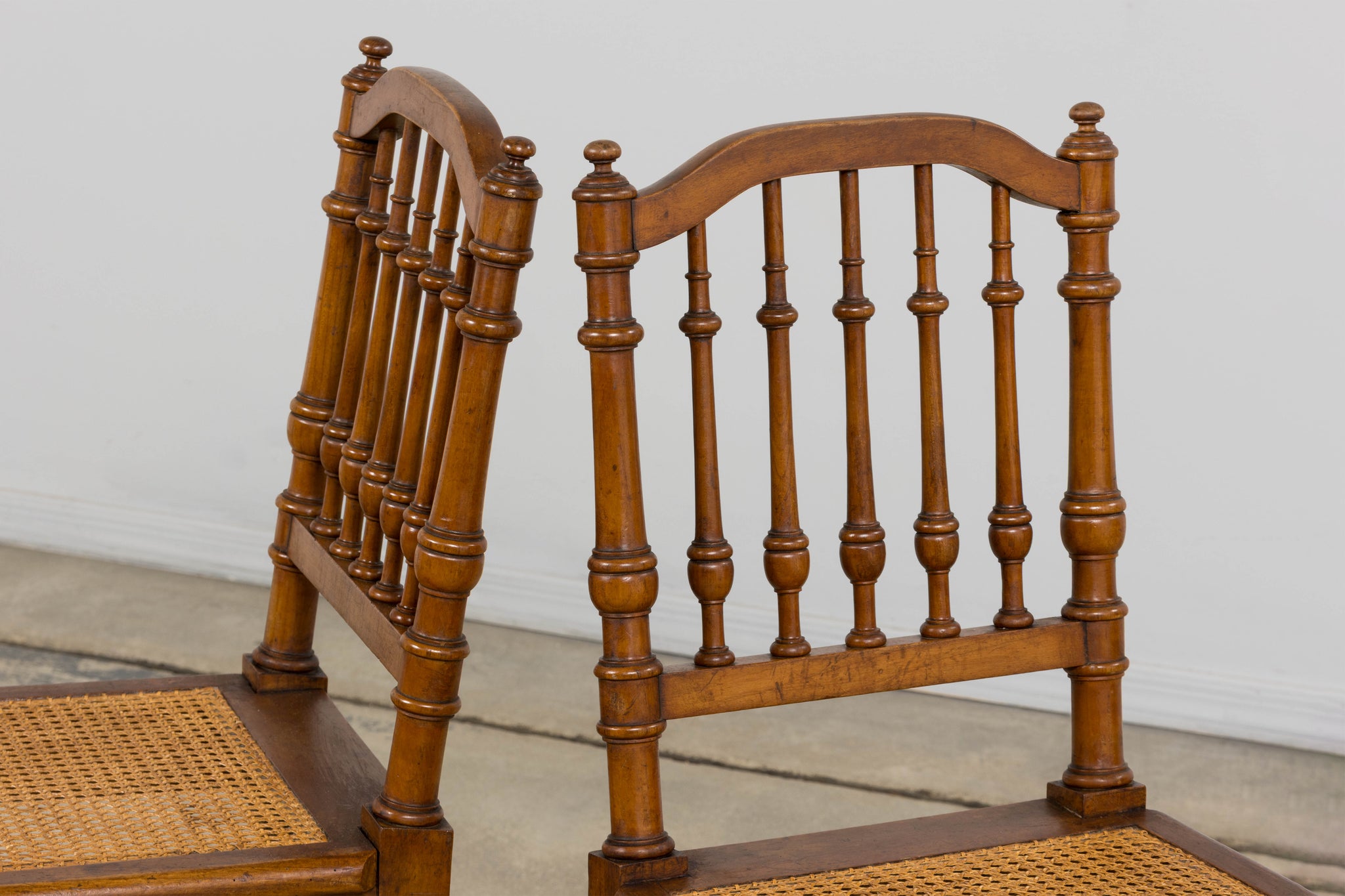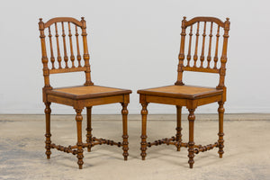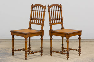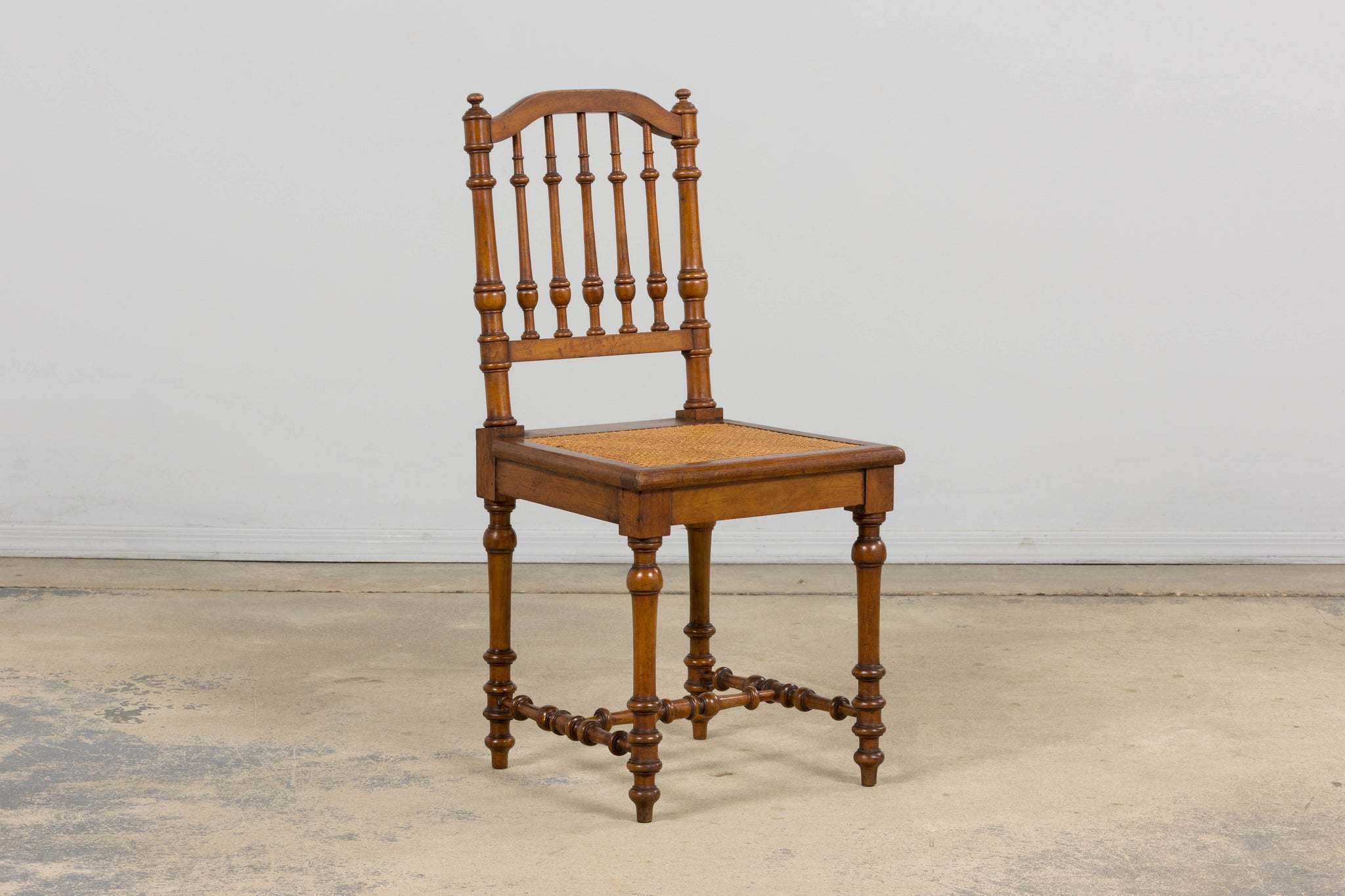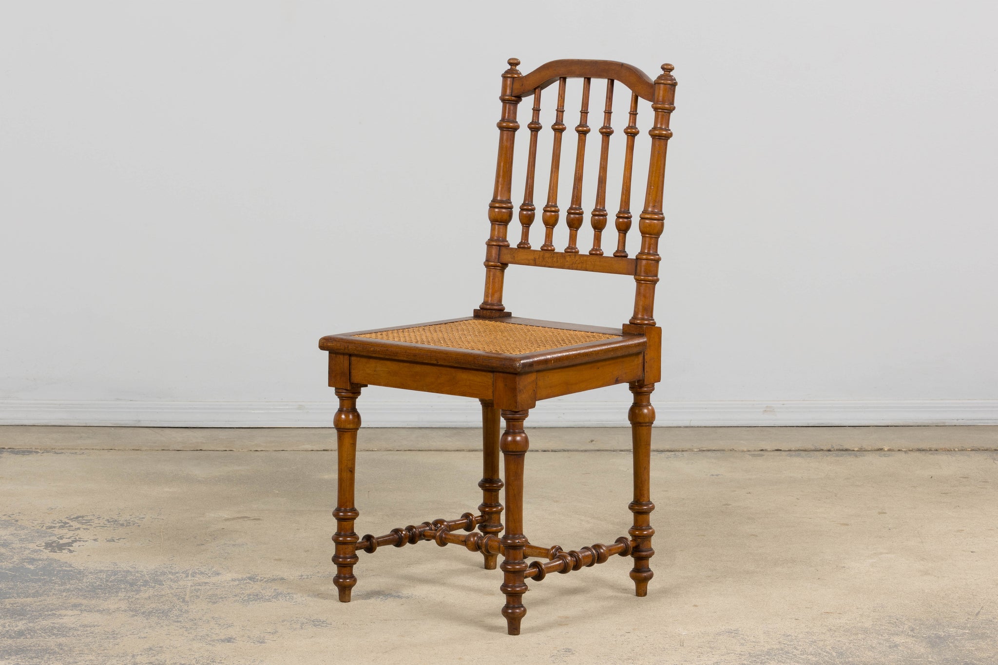 A charming set of six late 19th century French dining chairs in the Louis XIII style, sourced in Paris and crafted from solid walnut. Each chair features a gently arched crest rail above turned baluster spindles and finial-capped uprights, raised on turned legs joined by an H-form stretcher. The chairs retain their original hand-woven cane seats set within molded frames. Our workshop has structurally revised the frames to ensure stability for daily use, while preserving the character of the period construction. The walnut has been cleaned and finished with a protective wax, enhancing the natural tone and patina. Elegant yet practical in scale, the set works equally well around a farmhouse table or in a more formal dining setting.